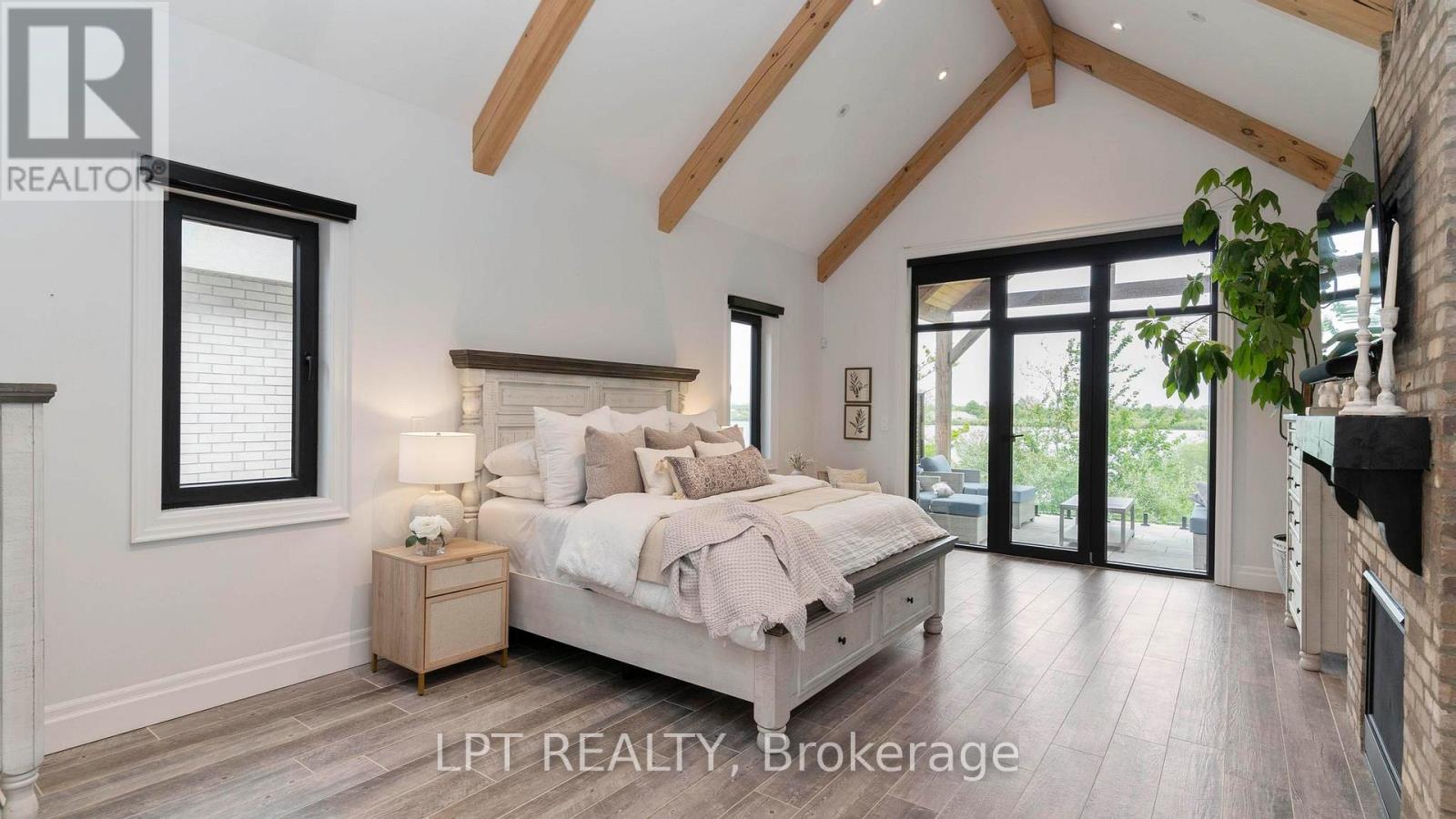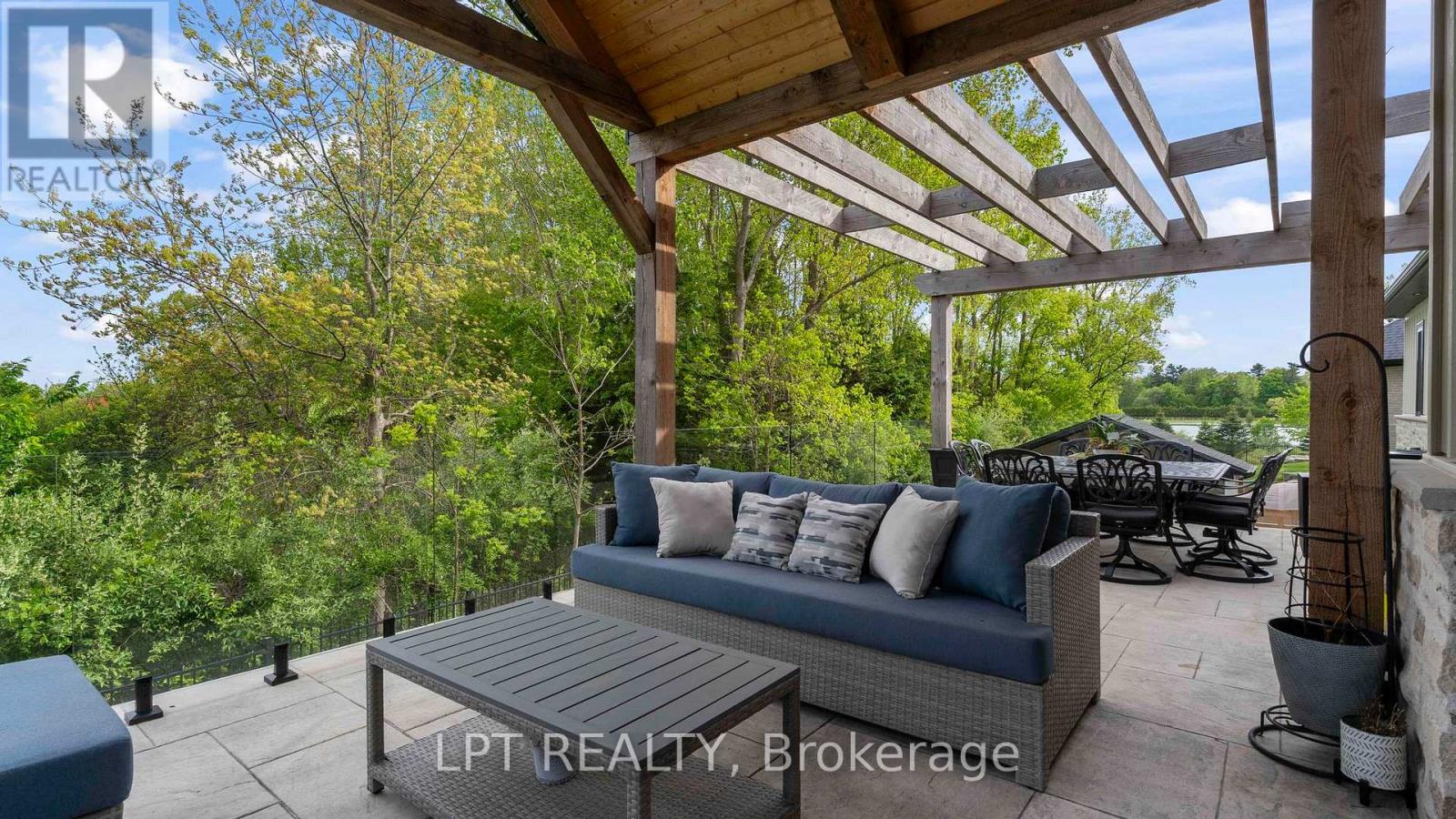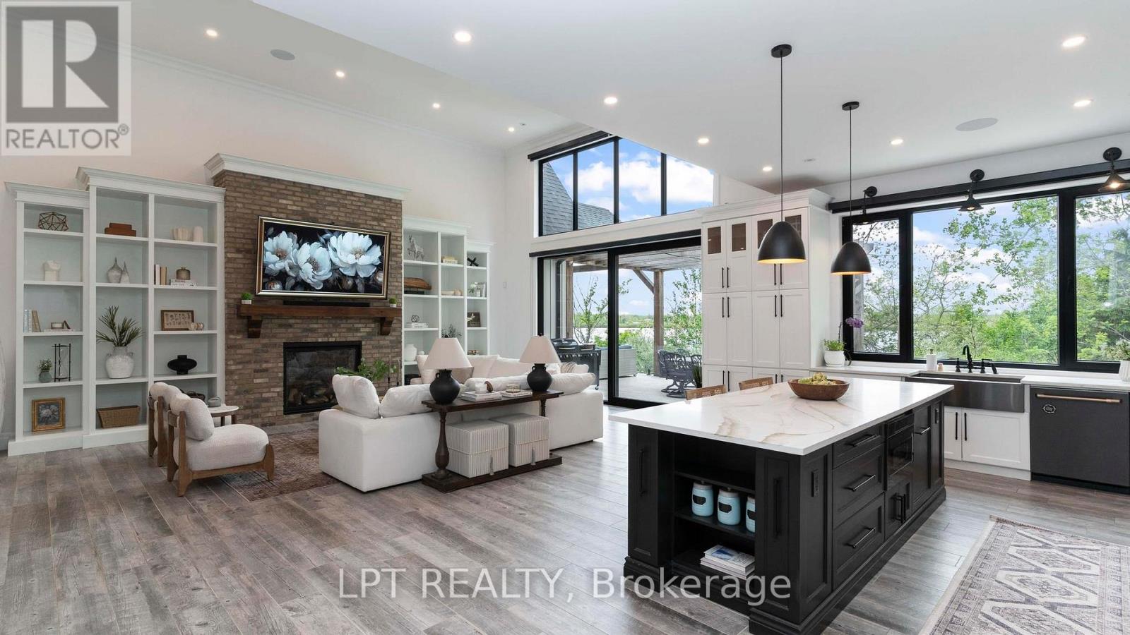 Welcome to 253-9861 Glendon Dr, a private residence nestled on a quiet cul-de-sac within the prestigious Bella Lago Estates of Komoka. This impressive bungaloft showcases outstanding craftsmanship, quality finishes, and a thoughtfully designed layout ideal for modern living. The exterior features a stone façade, curved concrete driveway, landscaped garden walls, exterior lighting, and an attached 3.5-car garage with keyless/fob entry. Inside, the open-concept main level is designed for both everyday comfort and entertaining. Heated floors extend throughout all three levels, complemented by a built-in sound system. The chef-inspired kitchen offers a large centre island, walk-in pantry and overlooks the spacious family room with custom built-ins and a brick fireplace. Expansive 14-ft sliding doors provide seamless access to the backyard. Step outside to a private outdoor retreat featuring a stamped concrete terrace, pergola, saltwater pool, and views of the pond. The fully fenced yard provides space for recreation, and the cabana with lighting is ideal for evening enjoyment. The primary bedroom includes cathedral ceilings with exposed beams, a fireplace, walk-out access to the patio, and a well-appointed ensuite with a freestanding tub, double vanities, rain shower, and walk-in closet. Two additional bedrooms with walk-in closets, a home office, and a mudroom with dog wash complete the main floor. The finished walkout lower level expands the living space with a home gym, theatre area, wet bar, guest bedroom, bonus room, two bathrooms, cold cellar, and ample storage. Additional features include European-style windows, upgraded insulation, and a full security system. Opportunities to purchase a beautifully finished home within this exclusive enclave of just 29 homes in the private residence area are rare, don't miss your chance. Some interior photos of the home are virtually staged and are indicated as such in the photo section. (id:64974)