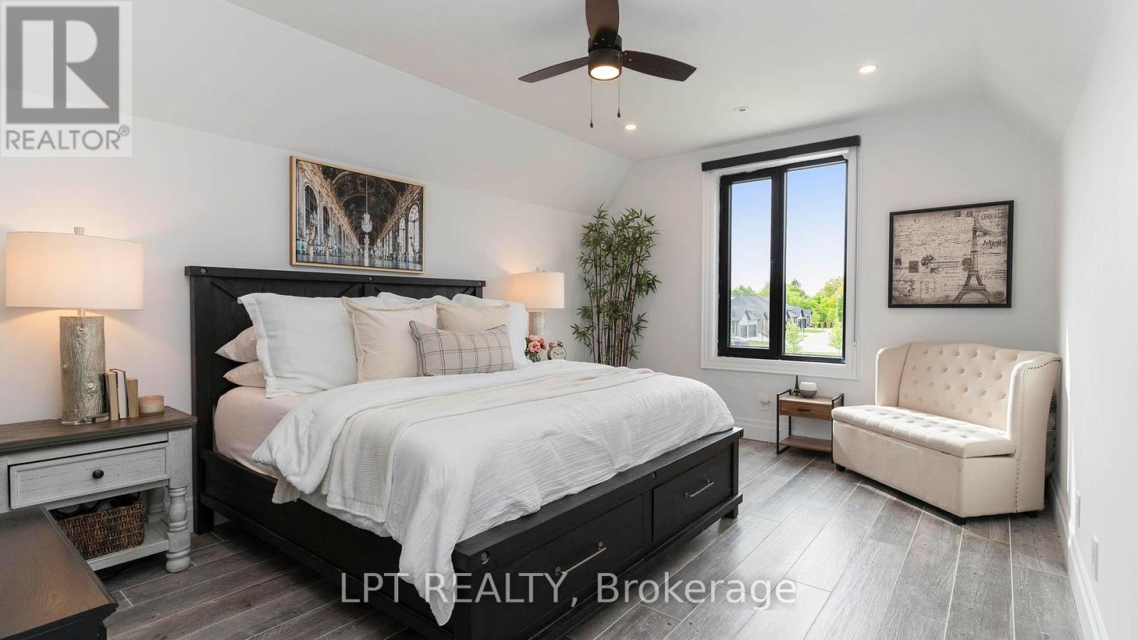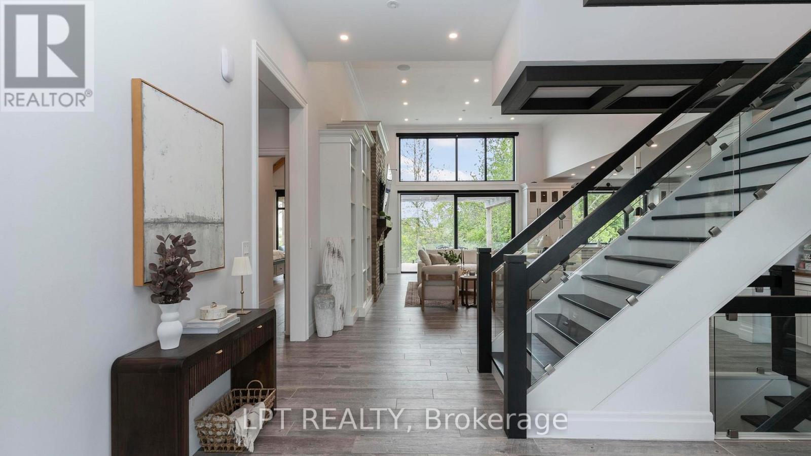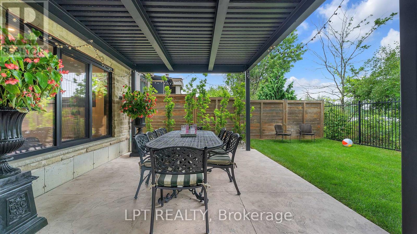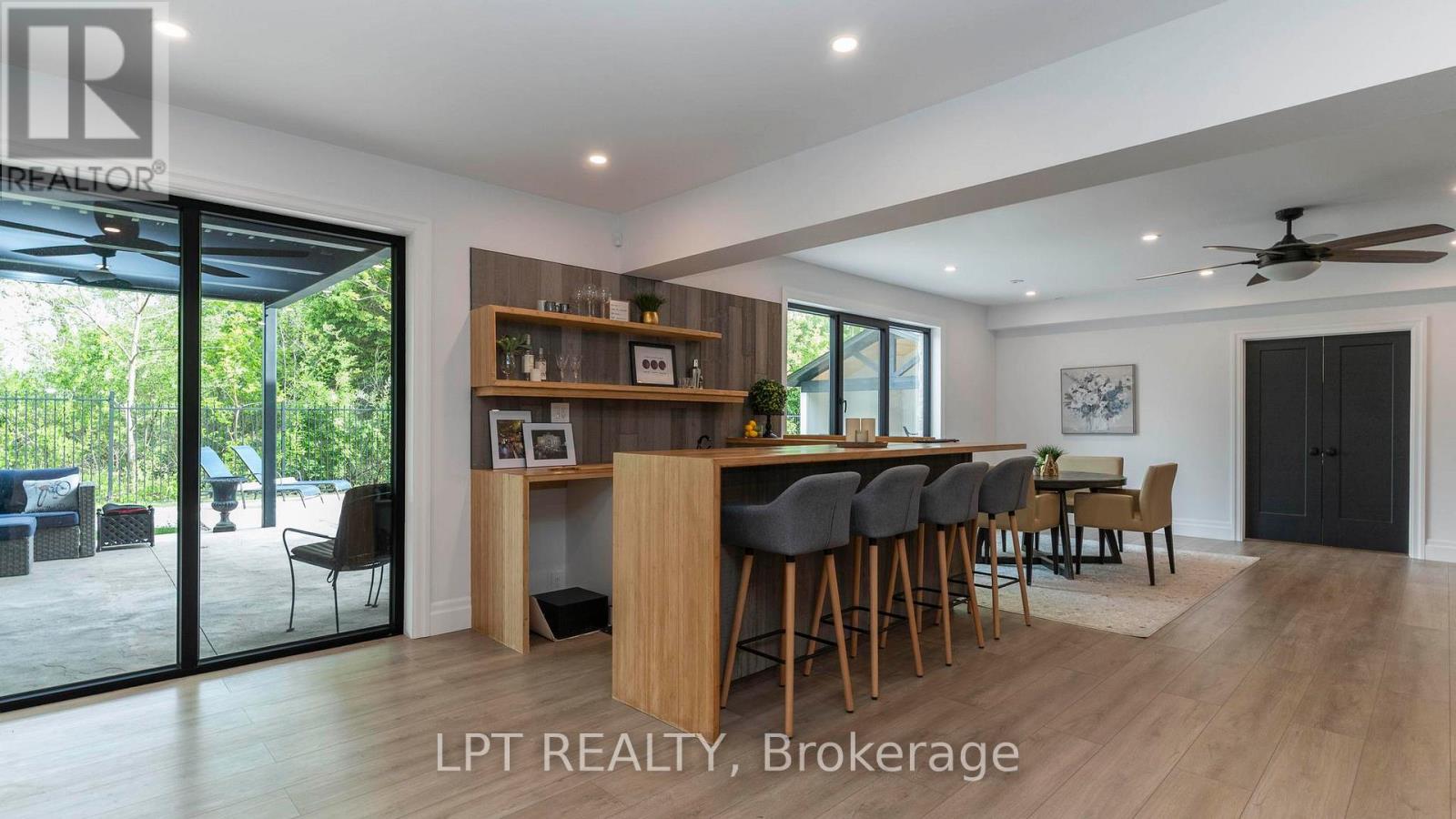 Welcome to 253-9861 Glendon Dr, a private residence nestled on a quiet cul-de-sac within the prestigious Bella Lago Estates of Komoka. This impressive bungaloft showcases outstanding craftsmanship, quality finishes, and a thoughtfully designed layout ideal for modern living. The exterior features a stone façade, curved concrete driveway, landscaped garden walls, exterior lighting, and an attached 3.5-car garage with keyless/fob entry. Inside, the open-concept main level is designed for both everyday comfort and entertaining. Heated floors extend throughout all three levels, complemented by a built-in sound system. The chef-inspired kitchen offers a large centre island, walk-in pantry and overlooks the spacious family room with custom built-ins and a brick fireplace. Expansive 14-ft sliding doors provide seamless access to the backyard. Step outside to a private outdoor retreat featuring a stamped concrete terrace, pergola, saltwater pool, and views of the pond. The fully fenced yard provides space for recreation, and the cabana with lighting is ideal for evening enjoyment. The primary bedroom includes cathedral ceilings with exposed beams, a fireplace, walk-out access to the patio, and a well-appointed ensuite with a freestanding tub, double vanities, rain shower, and walk-in closet. Two additional bedrooms with walk-in closets, a home office, and a mudroom with dog wash complete the main floor. The finished walkout lower level expands the living space with a home gym, theatre area, wet bar, guest bedroom, bonus room, two bathrooms, cold cellar, and ample storage. Additional features include European-style windows, upgraded insulation, and a full security system. Opportunities to purchase a beautifully finished home within this exclusive enclave of just 29 homes in the private residence area are rare, don't miss your chance. Some interior photos of the home are virtually staged and are indicated as such in the photo section. (id:64974)