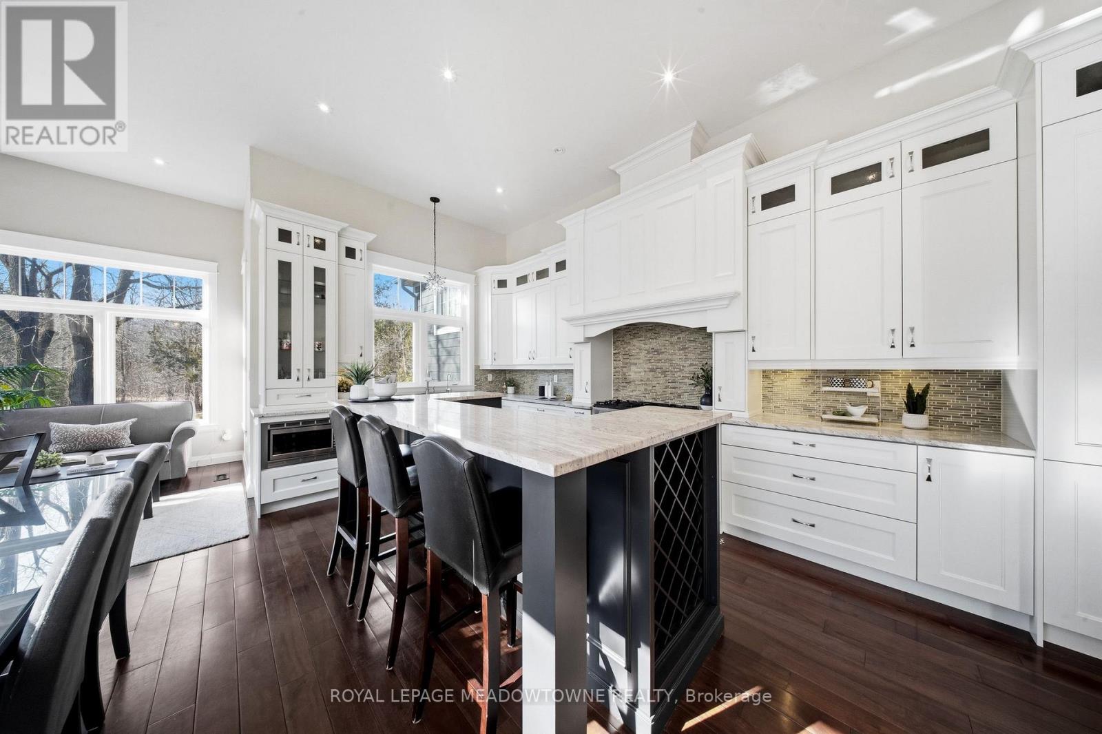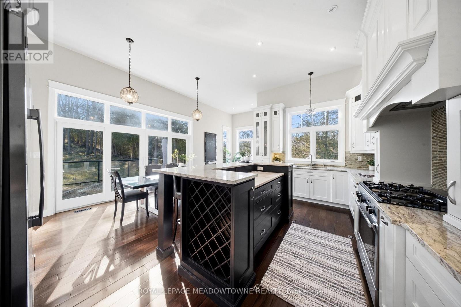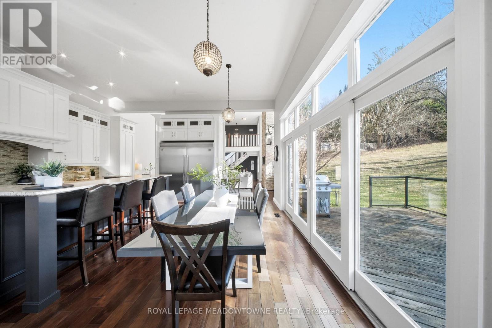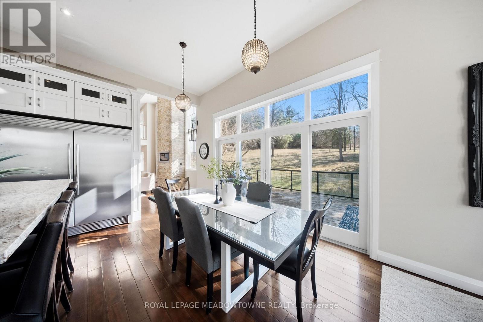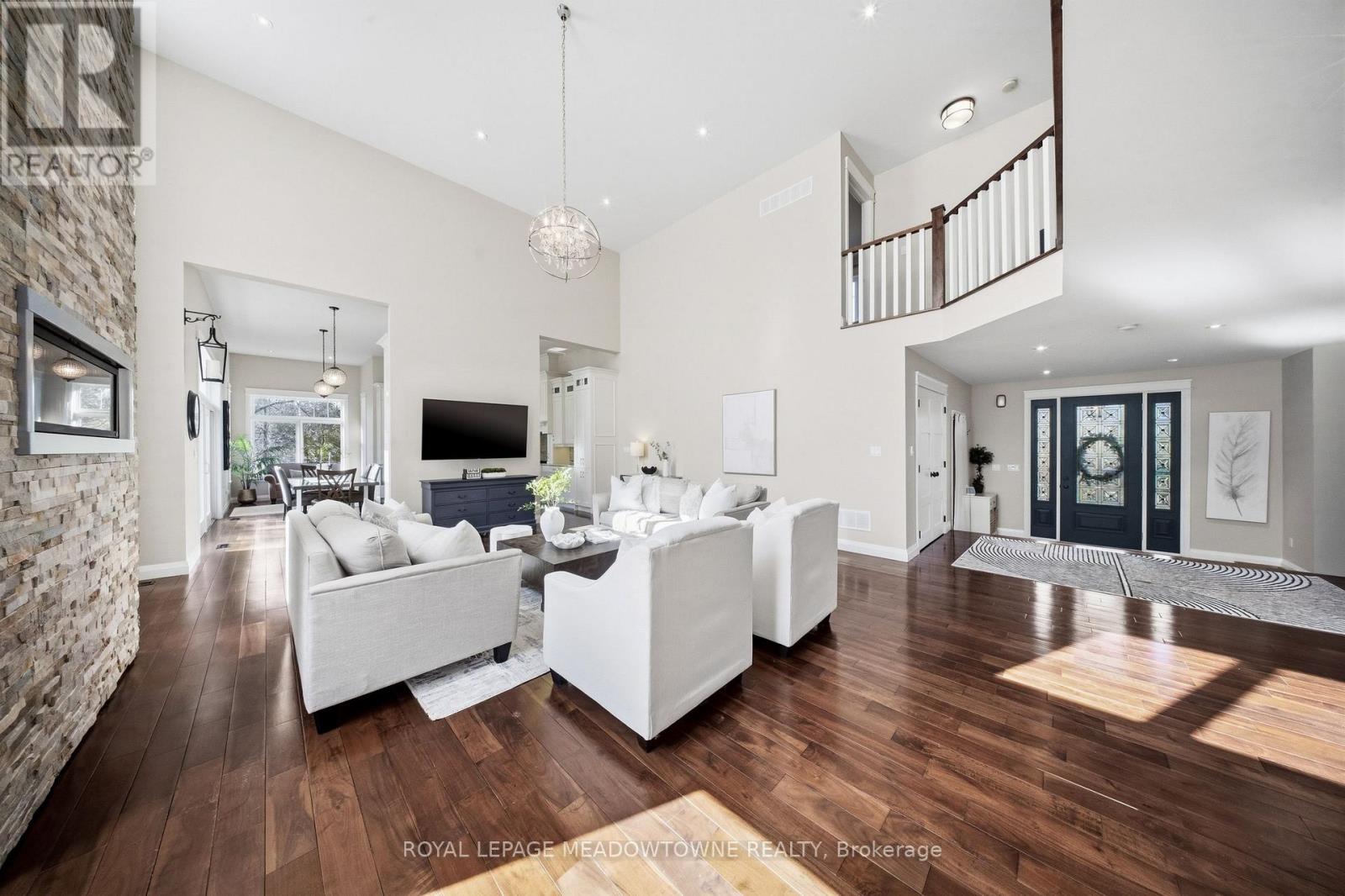 Custom-built detached home set on a picturesque 1-acre lot backing onto conservation, offering exceptional privacy and natural views. A circular driveway provides ample parking and leads to a built-in two-car garage plus covered parking area. Welcoming covered front porch opens to a sunken foyer.The open-concept great room impresses with soaring 17-ft ceilings, a striking stone fireplace, and expansive windows that flood the space with natural light. The gourmet kitchen features high-end stainless steel appliances, a centre island with built-in wine rack and breakfast bar, and is combined with the dining area with walkout to a large raised deck-ideal for entertaining.Main floor highlights include a private office, perfect for working from home, and a spacious primary retreat with his and hers closets, a 5-piece ensuite, and serene ravine views. Above the garage, a separate living space offers a family room with cathedral ceiling, bedroom, and ensuite-perfect for guests or extended family.The second level is accessed by an open staircase overlooking the great room and features three additional bedrooms, all with ensuite access. A fully finished walk-out lower level includes an in-law suite with its own bedroom, kitchen, and bathroom, providing excellent multi-generational living potential.Ideally located in the heart of Georgetown, close to the hospital, fairgrounds, The Club at North Halton, and an abundance of scenic paths and trails. (id:64974)