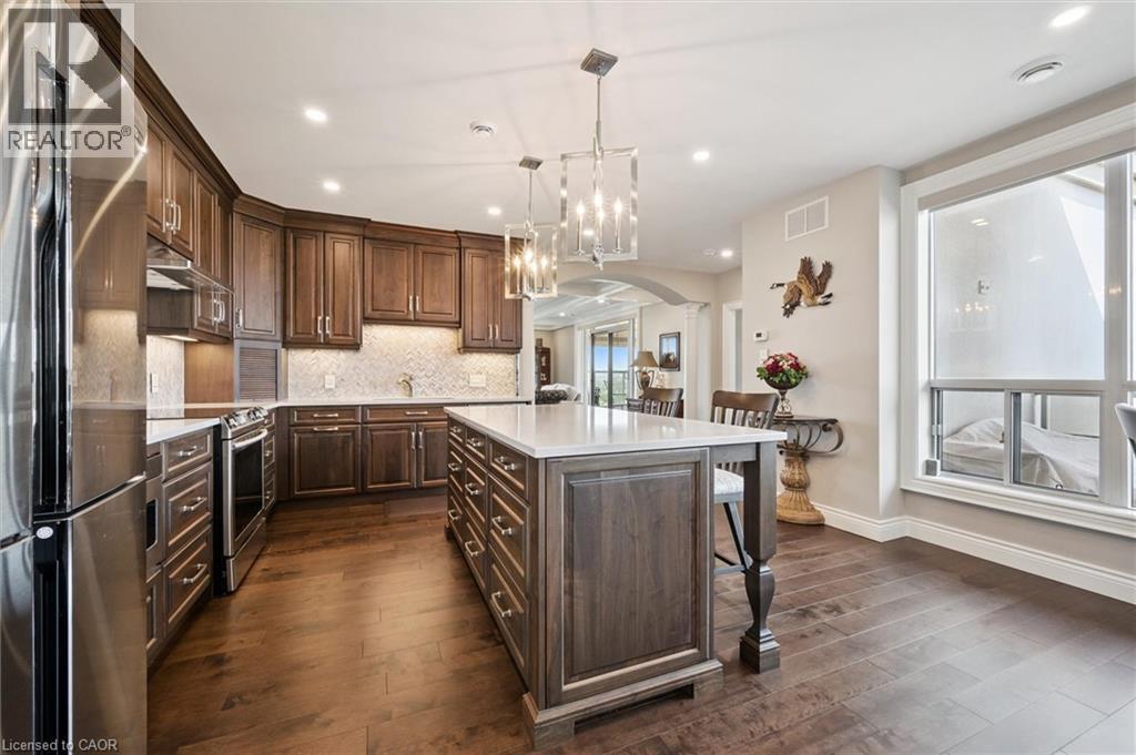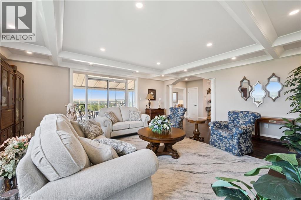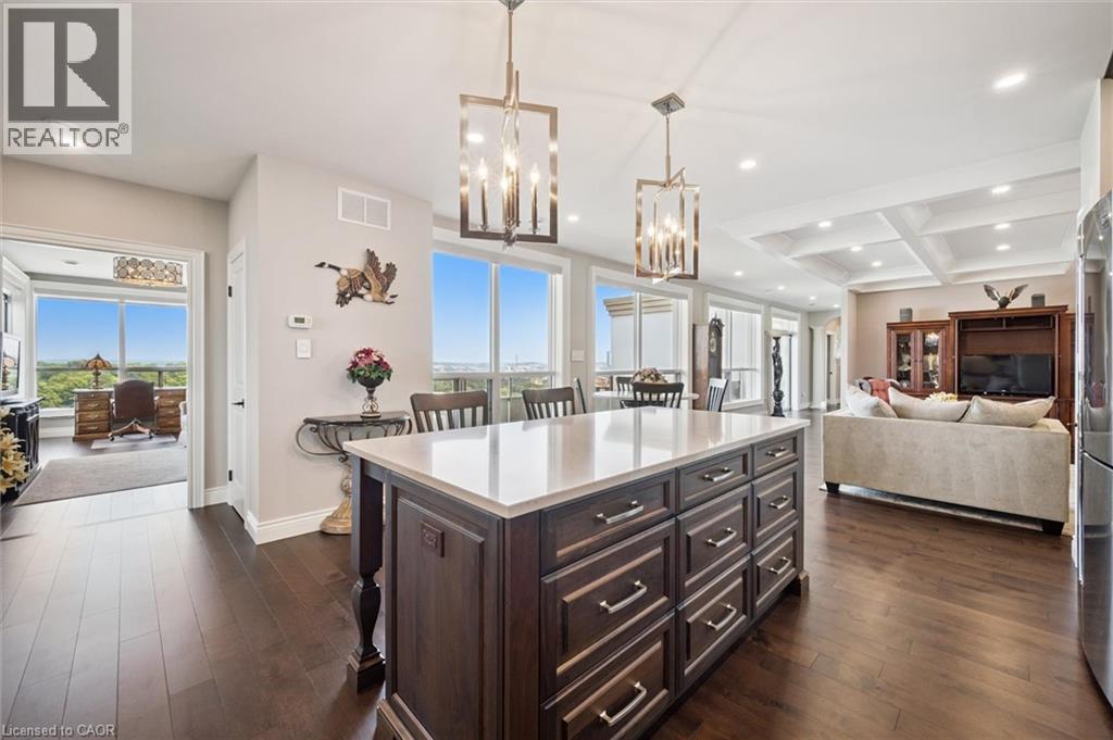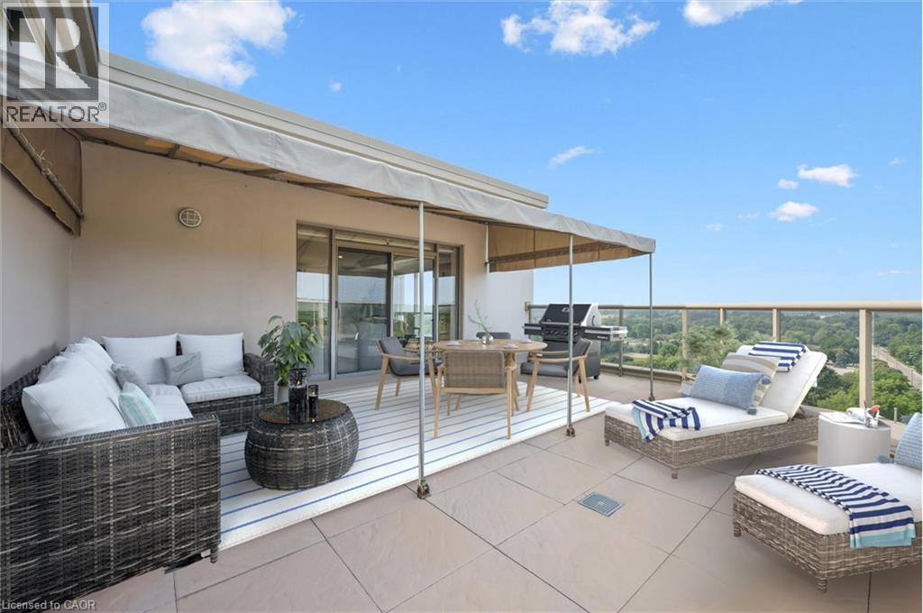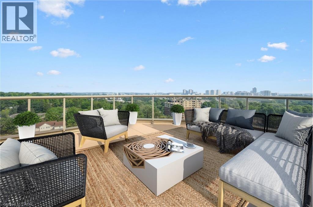 Welcome to this one-of-a-kind, professionally designed 2,241 sq. ft. penthouse in the heart of Waterloo’s coveted Beechwood neighbourhood. Perched high above the treetops, this showstopper boasts panoramic views from three sides and offers an unmatched sense of privacy and natural light through oversized windows at every turn. Meticulously renovated top to bottom by Menno Martin, this residence exudes quality and elegance. The grand living room features coffered ceilings and hardwood flooring throughout, opening onto a breathtaking 400 sq. ft. terrace—one of three outdoor spaces. The open-concept kitchen is a chef’s dream, showcasing solid wood cabinetry, quartz countertops, and premium finishes, seamlessly connecting to a formal dining area perfect for entertaining. The spacious primary suite is a private retreat with its own 400 sq. ft. terrace, a luxurious ensuite, and generous closet space. A second bedroom, additional bedroom or den, and a second expansive 200 sq. ft. terrace offer plenty of flexibility for guests, work, or relaxation. Set in a quiet, exceptionally well-maintained building, this rare penthouse is just steps to Waterloo Park, trails, and the vibrant offerings of Uptown Waterloo. Three underground parking spaces complete this truly exceptional package—an incredibly rare find in this location. The condominium also includes a fitness center, library, on-site super-intendant, guest suite and two lockers. Call to book a private showing today. (id:64974)
