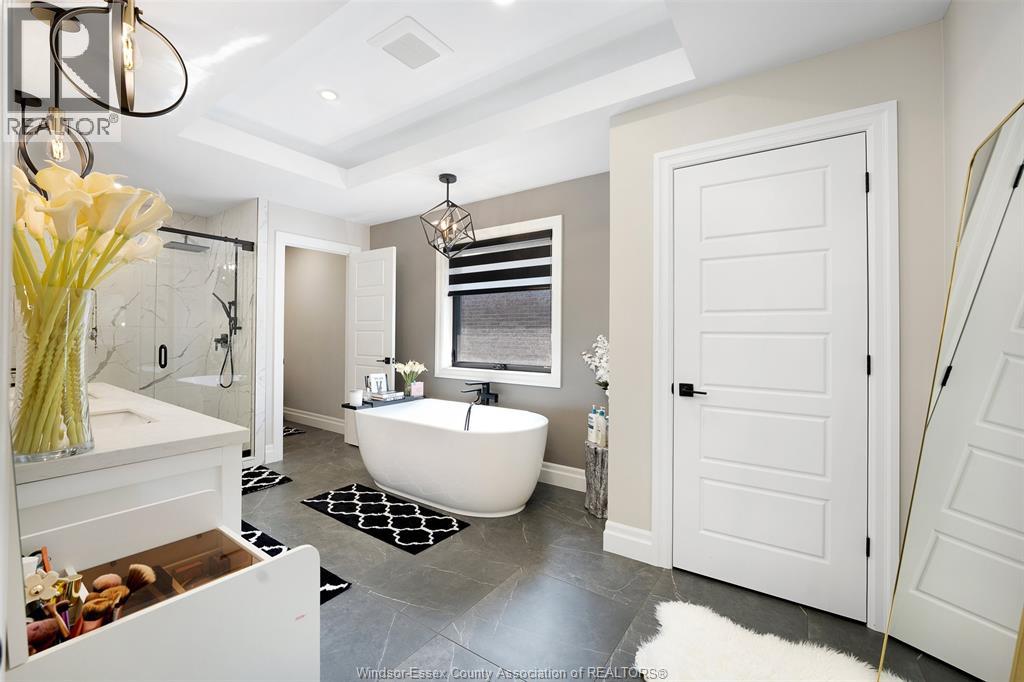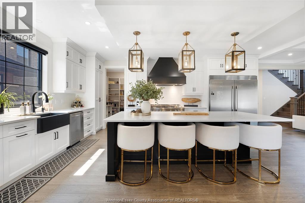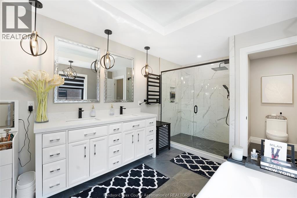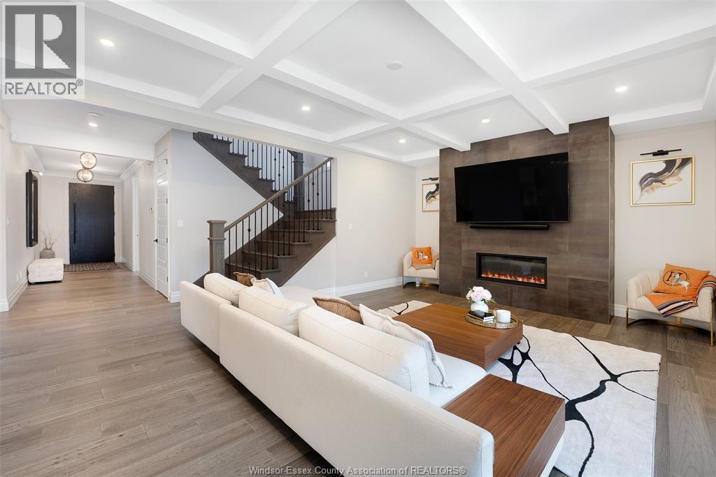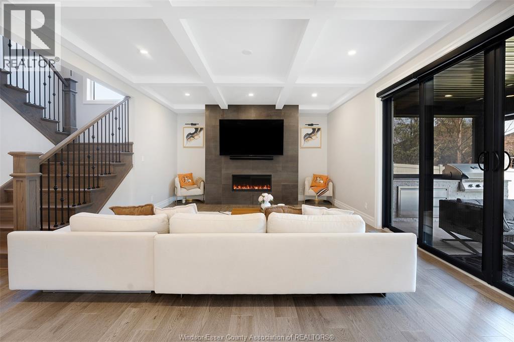 Welcome to this stunning two-storey brick and stone residence, boasting 4 +1 bedrooms and 6 bathrooms (w/ 3 ensuite), ideally located in the prestigious Russell Woods community built by Caster Custom Homes (2022). Offering approximately 3,166 sq ft above grade, plus a fully finished lower level with a separate grade-level entrance through the attached double garage, this home is perfectly designed for luxury living and multi-generational flexibility. The main floor showcases an elegant open-concept layout, highlighted by a sophisticated living room featuring custom coffered ceilings and a striking tiled fireplace. The gourmet chef’s kitchen is truly the heart of the home, complete with a large centre island with eat-in seating, wine fridge, premium appliances including 48"" range with 6 burners + griddle and double ovens, separate dining area, and a walk-in pantry. A highly desirable main floor bedroom includes a private 3-piece ensuite with a custom glass shower— ideal for guests or extended family. Easily converted to a home office for professionals preferring to work from home. Upstairs, the luxurious primary suite offers a refined retreat, featuring custom lighting, a tray ceiling, and an expansive walk-in closet with built-in cabinetry. The spa-inspired 5-piece ensuite includes a soaker tub, glass shower, and private water closet. Two additional generously sized bedrooms are connected by a beautifully designed Jack and Jill 5-piece ensuite. 2nd floor laundry centre for your convenience. The fully finished lower level provides exceptional additional living space with a separate entrance, spacious living area, bedroom, wet bar, a 3-piece bathroom, and an additional 2-piece bath—perfect for an in-law suite or income potential. Step outside to enjoy the covered rear porch with a outdoor kitchen, seating area, and fireplace. Motorized screens for privacy - ideal for effortless outdoor entertaining. (id:64974)