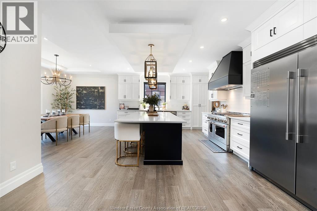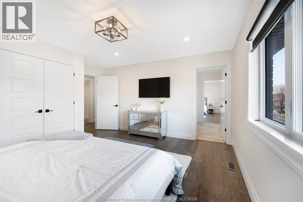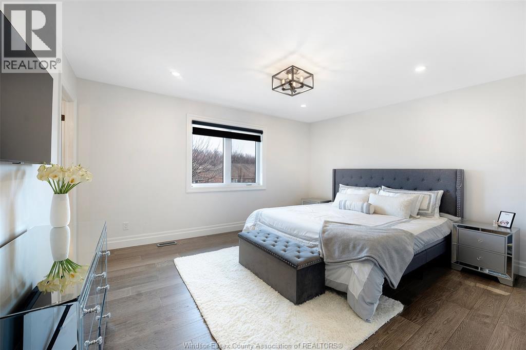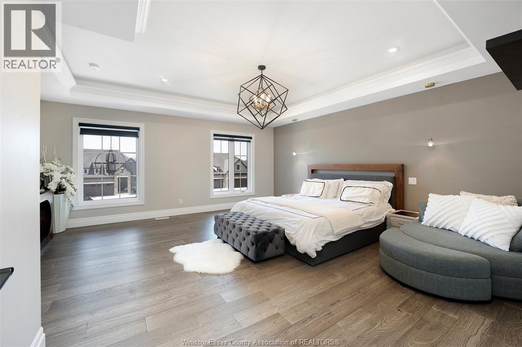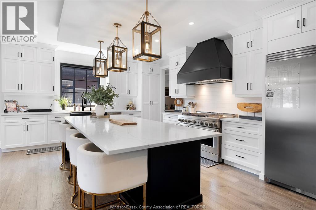 Welcome to this stunning two-storey brick and stone residence, boasting 4 +1 bedrooms and 6 bathrooms (w/ 3 ensuite), ideally located in the prestigious Russell Woods community built by Caster Custom Homes (2022). Offering approximately 3,166 sq ft above grade, plus a fully finished lower level with a separate grade-level entrance through the attached double garage, this home is perfectly designed for luxury living and multi-generational flexibility. The main floor showcases an elegant open-concept layout, highlighted by a sophisticated living room featuring custom coffered ceilings and a striking tiled fireplace. The gourmet chef’s kitchen is truly the heart of the home, complete with a large centre island with eat-in seating, wine fridge, premium appliances including 48"" range with 6 burners + griddle and double ovens, separate dining area, and a walk-in pantry. A highly desirable main floor bedroom includes a private 3-piece ensuite with a custom glass shower— ideal for guests or extended family. Easily converted to a home office for professionals preferring to work from home. Upstairs, the luxurious primary suite offers a refined retreat, featuring custom lighting, a tray ceiling, and an expansive walk-in closet with built-in cabinetry. The spa-inspired 5-piece ensuite includes a soaker tub, glass shower, and private water closet. Two additional generously sized bedrooms are connected by a beautifully designed Jack and Jill 5-piece ensuite. 2nd floor laundry centre for your convenience. The fully finished lower level provides exceptional additional living space with a separate entrance, spacious living area, bedroom, wet bar, a 3-piece bathroom, and an additional 2-piece bath—perfect for an in-law suite or income potential. Step outside to enjoy the covered rear porch with a outdoor kitchen, seating area, and fireplace. Motorized screens for privacy - ideal for effortless outdoor entertaining. (id:64974)