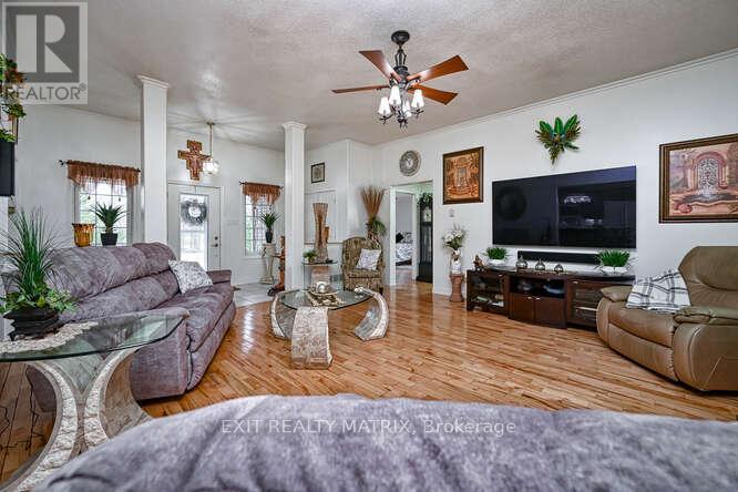 Welcome to 2573 Mitchell Street, a beautifully maintained all-brick bungalow set back on a private 1.9-acre lot surrounded by mature trees and thoughtfully designed rock gardens. Pride of ownership is evident throughout the property, both inside and out. The backyard is a true retreat, ideal for entertaining and family gatherings, featuring a spacious deck, pavilion, tiki bar, fire pit, and a brand-new above-ground pool (2025). Dusk-to-dawn lighting enhances the outdoor space, creating a warm and inviting atmosphere well into the evening. Inside, the home offers a functional and flexible layout well-suited for multi-generational living. The main floor includes spacious bedrooms, a private primary suite with ensuite and deck access, and an open-concept living, dining, and kitchen area designed for everyday comfort and connection. The fully finished basement provides excellent potential for an in-law suite, complete with a walk-out to the backyard, a bedroom, bathroom, and an unfinished area already plumbed for a future kitchen, offering endless possibilities for extended family or private living space. At the rear of the property, a large detached garage with high doors includes its own water and septic system, an office, bathroom, and loft space, making it ideal for a home-based business, workshop, hobbyist, or potential secondary dwelling (buyer to verify). This versatile property offers space, privacy, and flexibility rarely found, just minutes to Metcalfe and a short drive to Greely and Osgoode, 35 mintutes to downtown Ottawa, 20 minutes from Ottawa airport. (id:64974)
