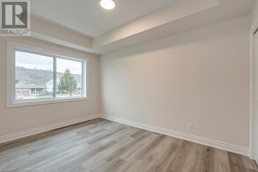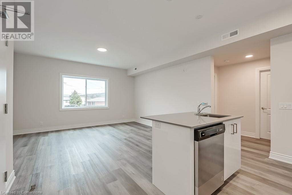 Be the first to live in this gorgeous 877 square foot open concept, 2-bedroom 1 bath unit in Stoney Creek. Beautiful modern finishes include vinyl flooring, stainless steel appliances, quartz counter tops, high ceilings, and in suite laundry. The unit includes one parking space (#24) and the BBQ picnic area, bike storage and visitor parking all make this boutique condominium a great place to live. Close to downtown Stoney Creek and all it has to offer as well as parks, shopping, and transit, this unit is ready for you to call home. (id:64974)