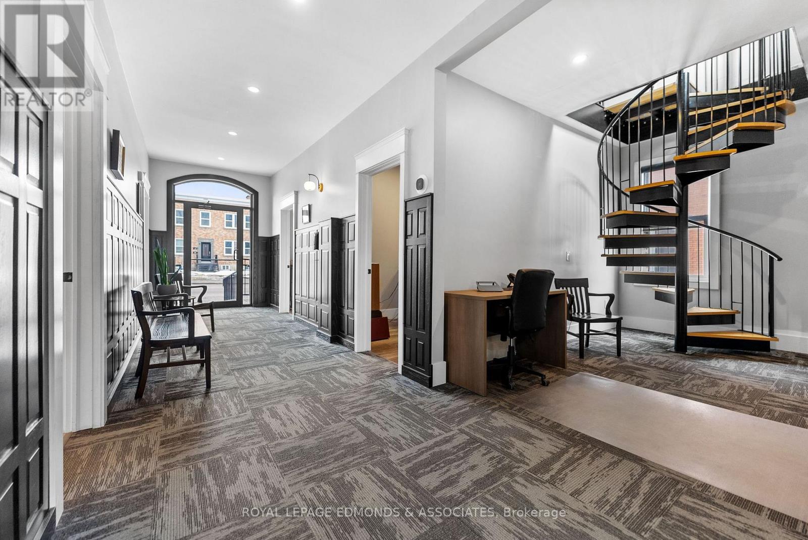 Completely renovated mixed-use building in a high-traffic, highly sought-after location. This versatile property offers nearly 1,200 sq. ft. of commercial space on the main level and a 3-bedroom, 1-bathroom residential apartment on the second floor, making it ideal for investors or business owners looking to occupy or generate additional income. The commercial space features a fully accessible main entrance fronting onto Pembroke Street, as well as a convenient rear entrance from the parking lot, which provides ample parking for both clients and staff. Inside, you'll find four spacious offices filled with natural light, creating a bright and productive work environment. An unfinished basement offers excellent additional storage space. Upstairs, the residential unit includes three large bedrooms with abundant natural light, an open-concept kitchen and living area, and a private entrance from the parking lot leading to a spacious deck. A stunning spiral staircase connects the lower and upper levels and is currently closed off but could be reopened, allowing the upper level to be converted into additional office or commercial space if desired. A rare opportunity to own a turnkey mixed-use property with flexible potential in a prime location. Upgrades include: furnace and A/C 2024, all new windows 2022, metal roof, spray foam in attic 2023. 48 Hours Irrevocable on all written offers. (id:64974)