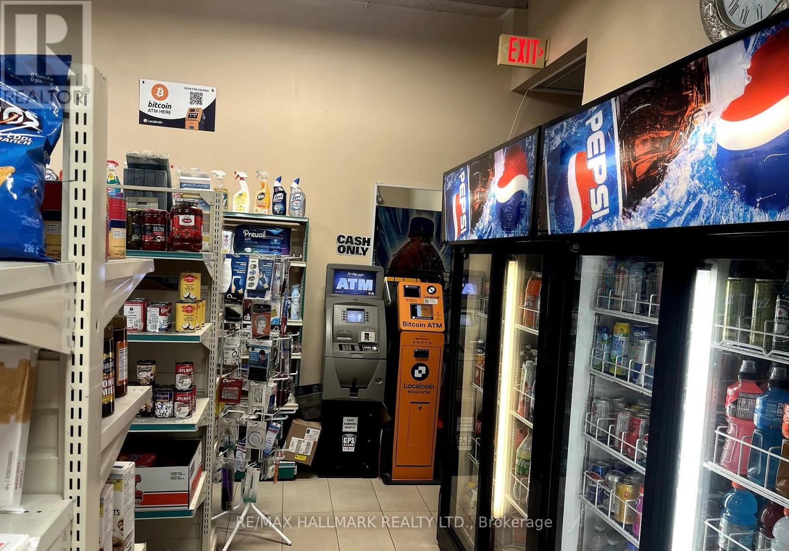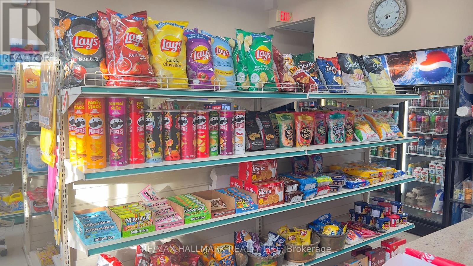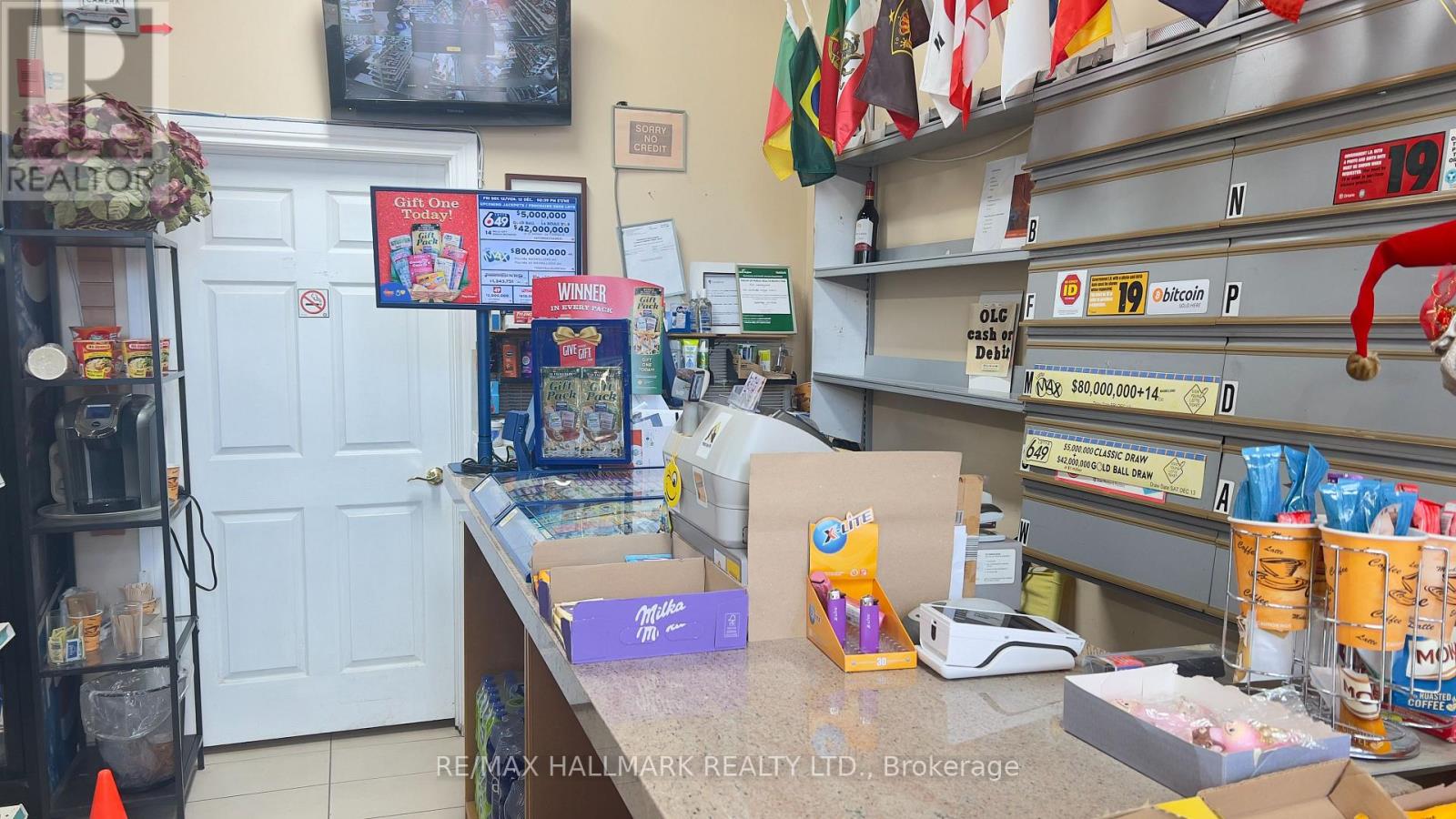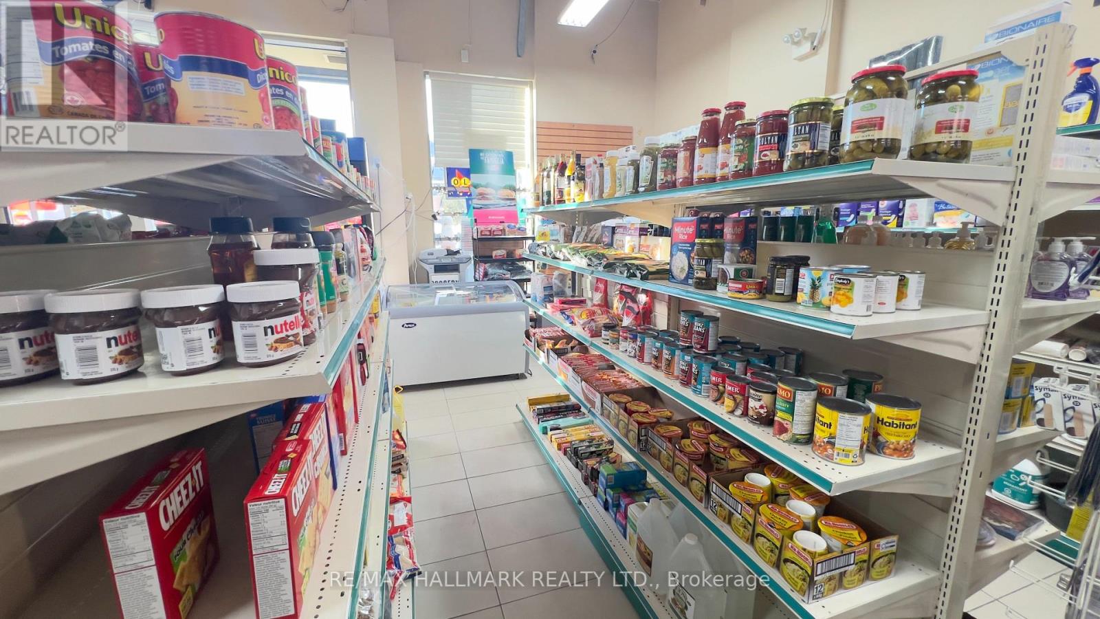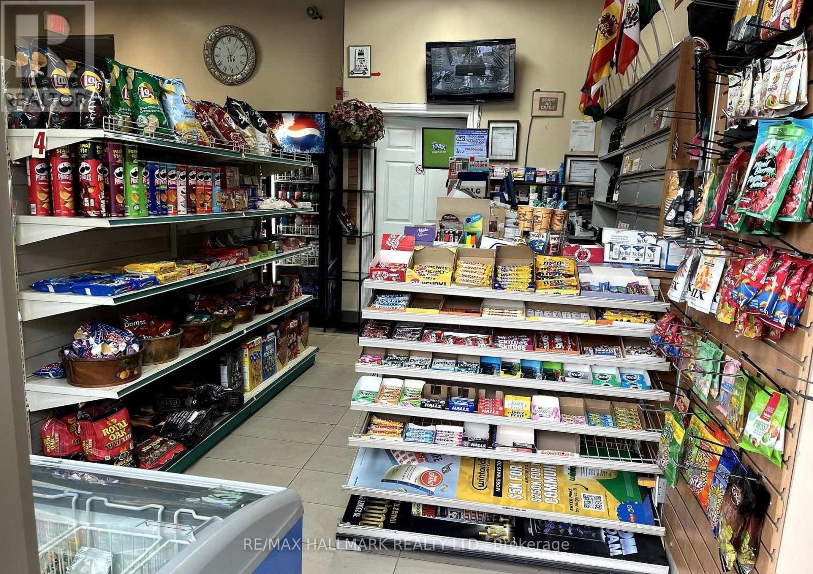 Rare opportunity to own a high-potential convenience store in a prime, high-traffic location, located at the ground level of a 256-unit condominium building. Surrounded by private and public schools, banks, and well-established businesses.Low monthly rent of $2,267 (TMI + water included). The store offers separate storage with a kitchen area and is licensed for lottery, food packaging, tobacco, wine, and beer.Excellent future growth potential with three new condo developments coming soon directly across the street. Neighboring businesses include a dental clinic, a well-known makeup salon, multiple hair salons, major banks such as RBC and BMO, and a bus stop, providing steady foot traffic. (id:64974)