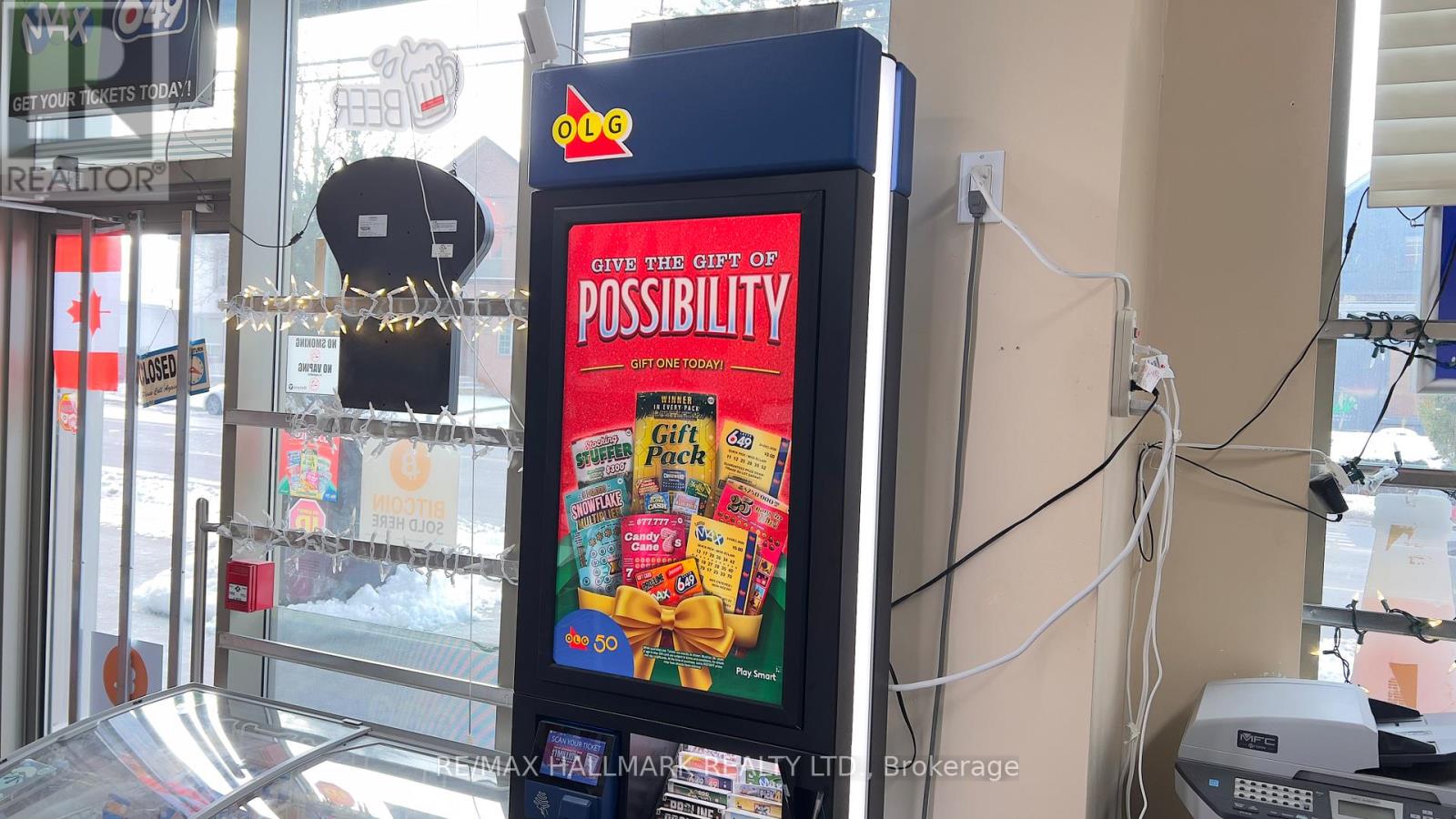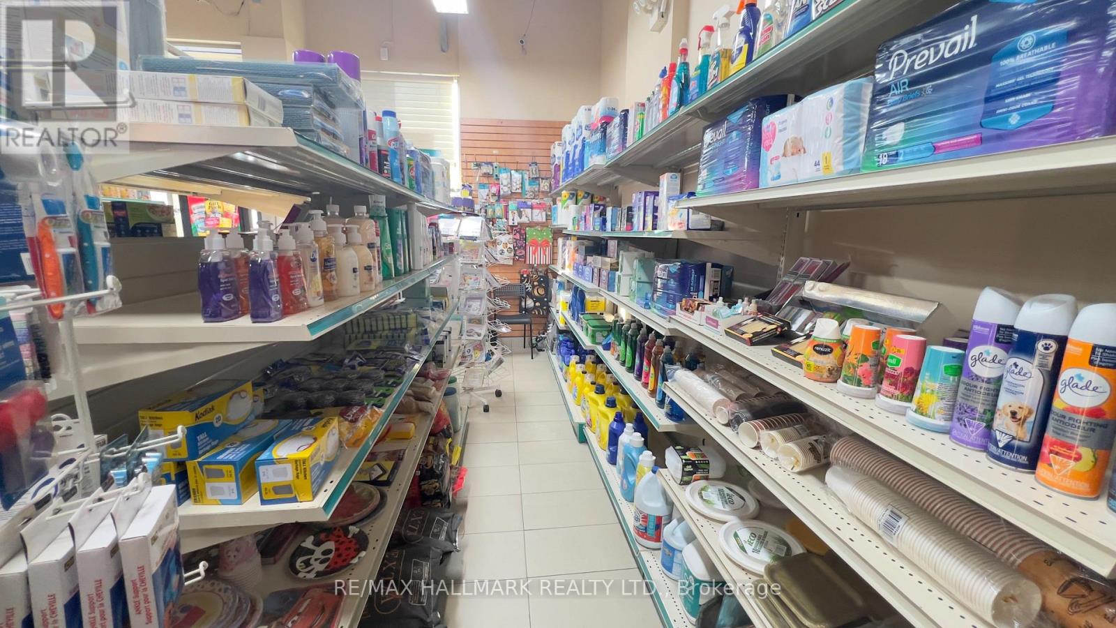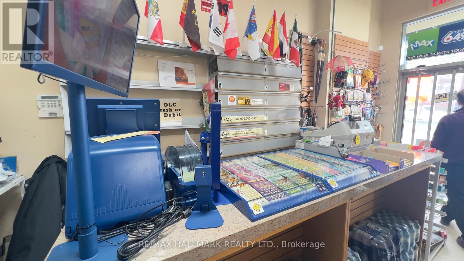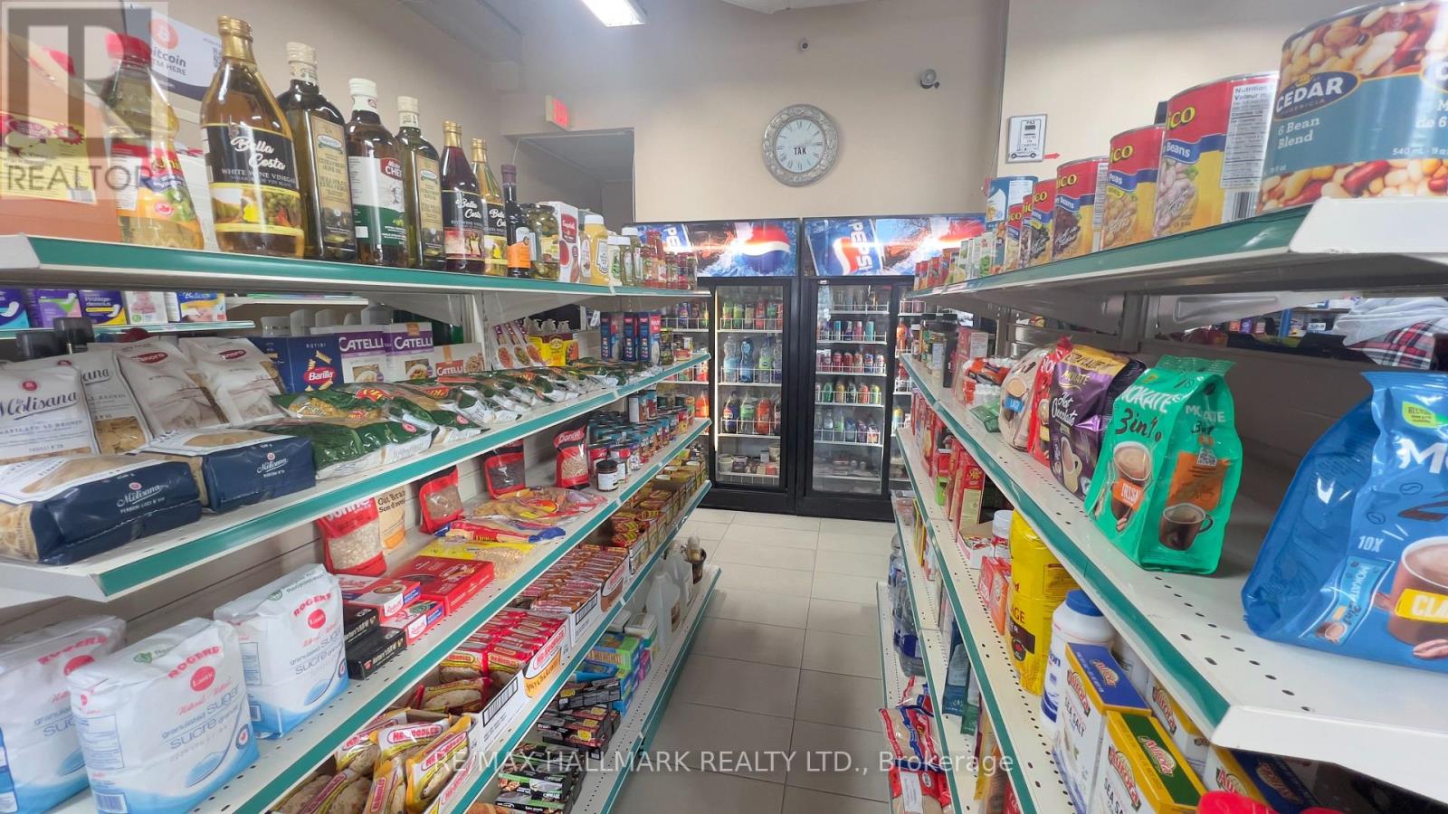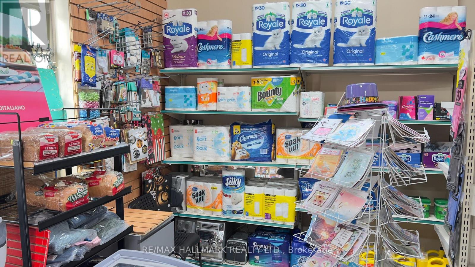 Rare opportunity to own a high-potential convenience store in a prime, high-traffic location, located at the ground level of a 256-unit condominium building. Surrounded by private and public schools, banks, and well-established businesses.Low monthly rent of $2,267 (TMI + water included). The store offers separate storage with a kitchen area and is licensed for lottery, food packaging, tobacco, wine, and beer.Excellent future growth potential with three new condo developments coming soon directly across the street. Neighboring businesses include a dental clinic, a well-known makeup salon, multiple hair salons, major banks such as RBC and BMO, and a bus stop, providing steady foot traffic. (id:64974)