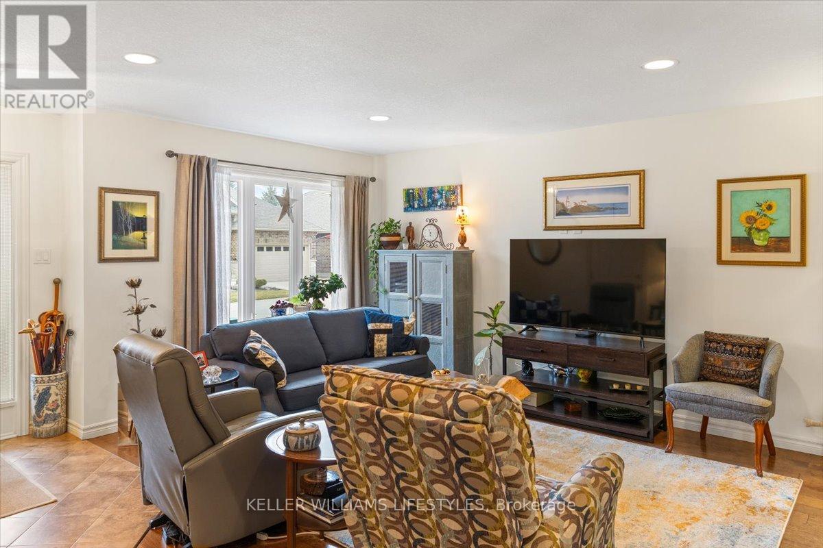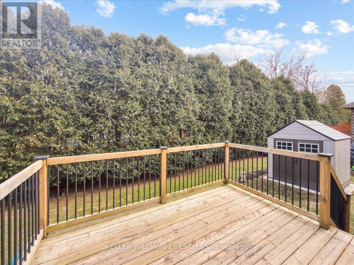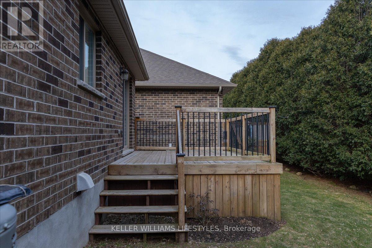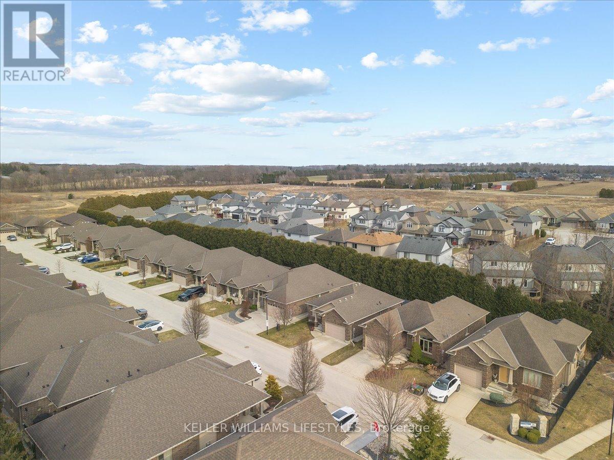 This well-maintained, move-in ready, all-brick vacant land condo has everything you need on one level, including main floor laundry and a bright and inviting living room with stunning engineered hardwood flooring. The kitchen is complete with appliances and boasts plenty of space for cooking and preparing meals. The eating area includes a patio walkout to the backyard with a 10 x12 wood deck, perfect for enjoying summer evenings. The home features two spacious bedrooms, including a primary bedroom with cheater en-suite privileges to the 3 piece bath with wheel-in glass shower. The lower level is finished with a 3pc bathroom and plenty of storage space. Additional features of the home include, single car garage, beautiful landscaping and includes fridge, stove, dishwasher, washer, dryer and backyard storage shed! This is a wonderful opportunity to own a beautiful and low-maintenance home in a great location, with easy access to amenities and all of what lovely Strathroy has to offer, like shopping, the dog park, downtown, the 402 and recreation. This home is truly a must see! Low monthly maintenance fee of $113.95. (id:64974)