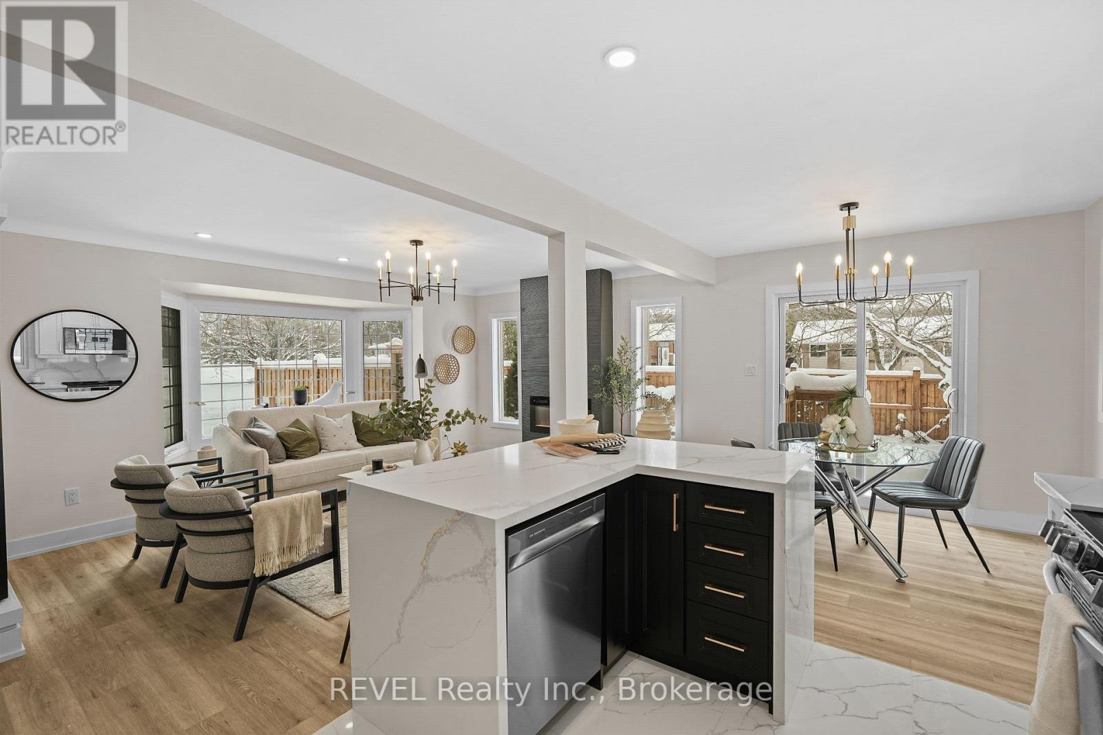 This luxurious boutique bungalow featuring 3+2 bedrooms and 2 bathrooms, with a fully finished basement, has just hit the market in a sought-after neighbourhood of St. Catharines. This gorgeous, fully upgraded home boasts brand-new high-end renovations and sits on a large, spacious corner lot with brand-new fencing. From the moment you step inside, you will fall in love with the upgrades throughout. The main level offers a very spacious open-concept layout, high-end tile flooring in the foyer and kitchen, luxury vinyl flooring, and upgraded chandeliers and light fixtures throughout. The bright and inviting living room features a stunning accent wall with an electric fireplace and is filled with natural light all day long. The heart of the home is the beautiful two-toned kitchen, complete with ample cabinetry, quartz countertops and backsplash, a waterfall island, brand-new stainless steel appliances, and elegant gold accents. The dining room provides direct access to the fully fenced backyard and a small deck. The upper level includes three bedrooms, with the spacious primary bedroom showcasing a stylish accent wall. The luxurious 4-piece bathroom features floor-to-ceiling high-end tile, a brand-new quartz vanity, and a new tub and tiled shower. The fully finished basement, with a separate entrance, offers two spacious bedrooms, a large recreation room, a luxurious 3-piece bathroom, and a beautiful wet bar with a feature wall, adding a premium touch to the space. The basement also has excellent potential to be converted into an in-law suite if desired. Recent upgrades include a new roof (2019), furnace (2019), owned hot water tank, and improved attic insulation. This exceptional location offers tennis courts and a community soccer field directly across the street, with close proximity to the Bruce Trail and Twelve Mile Creek trails, the Pen Centre, and Brock University. (id:64974)