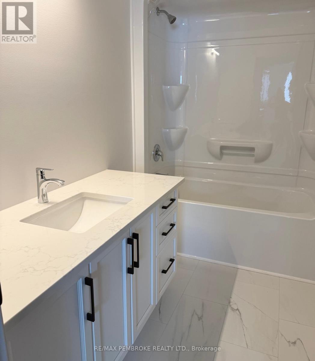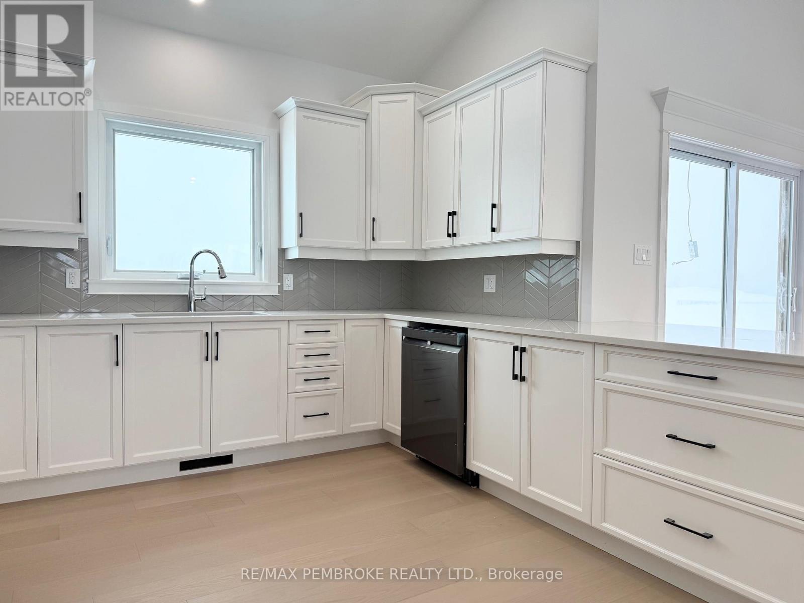 Welcome to 26 Jade Avenue in Radtke Estates subdivision of Petawawa. This beautifully crafted 3-bedroom, 2-bathroom bungalow embodies modern, comfortable living.Step into a bright, open-concept living space featuring vaulted ceilings that enhance the airy feel of the living room, dining area, and kitchen. Patio doors lead to a covered patio, ideal for enjoying morning coffee amidst serene treeline views.The kitchen has sleek white cabinets, durable quartz countertops, a stylish backsplash, and luxury vinyl plank flooring that ensures easy maintenance. A convenient main-floor laundry room adds to the home's practicality.Retreat to the primary bedroom, complete with a spacious walk-in closet and a luxurious 3-piece ensuite. Two additional bedrooms and a four-piece bathroom down the hallway, offering ample space for family or guests.The unfinished lower level offers excellent potential for expansion-perfect for a family room, extra bedrooms, or a home office.Additional features include central air conditioning, eavestroughs, a paved driveway, concrete walkway leading to the front entrance, a spacious triple-car garage, sodded front and back yards, and a full Tarion warranty, ensuring your peace of mind.Experience the perfect blend of inviting warmth and functionality in Petawawa's newest community. Schedule your private viewing today-this home is ready to welcome you! (id:64974)