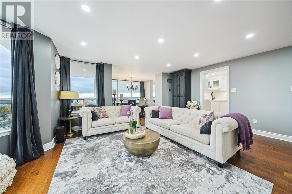Set majestically high on the 26th floor of the Phoenix Condos, this rarely offered corner suite offers 1,280 sq. ft. of elegant living space with panoramic, unobstructed city and lake views. Featuring southeast facing exposure with a private balcony, this fully renovated residence combines style and functionality in a prime location just minutes from Square One, GO Transit, major highways, shopping, schools, and parks. Beautifully appointed interior upgrades include walnut-stained engineered hardwood floors, extra-deep baseboards, smooth ceilings and pot lights (2024). The modern kitchen is equipped with high-end Fisher & Paykel, Bosch, Sharp and Asko appliances, custom cabinetry, quartz counters, and a hidden stackable washer/dryer. The inviting open-concept layout separates two spacious bedrooms for maximum privacy, each offering walk-in or built-in California Closets. Two fully renovated bathrooms (2021) feature premium fixtures and spa-inspired finishes. Additional highlights include a full mirrored entry wall (2021), custom window coverings (2024), gallery-style hallway, two furnaces (with new fan coil insulation 2024), and two owned parking spaces. Residents enjoy resort-style amenities including a 24-hour concierge, indoor whirlpool, sauna, fitness centre, tennis court, squash court, party room, library, and landscaped outdoor spaces. (id:64974)