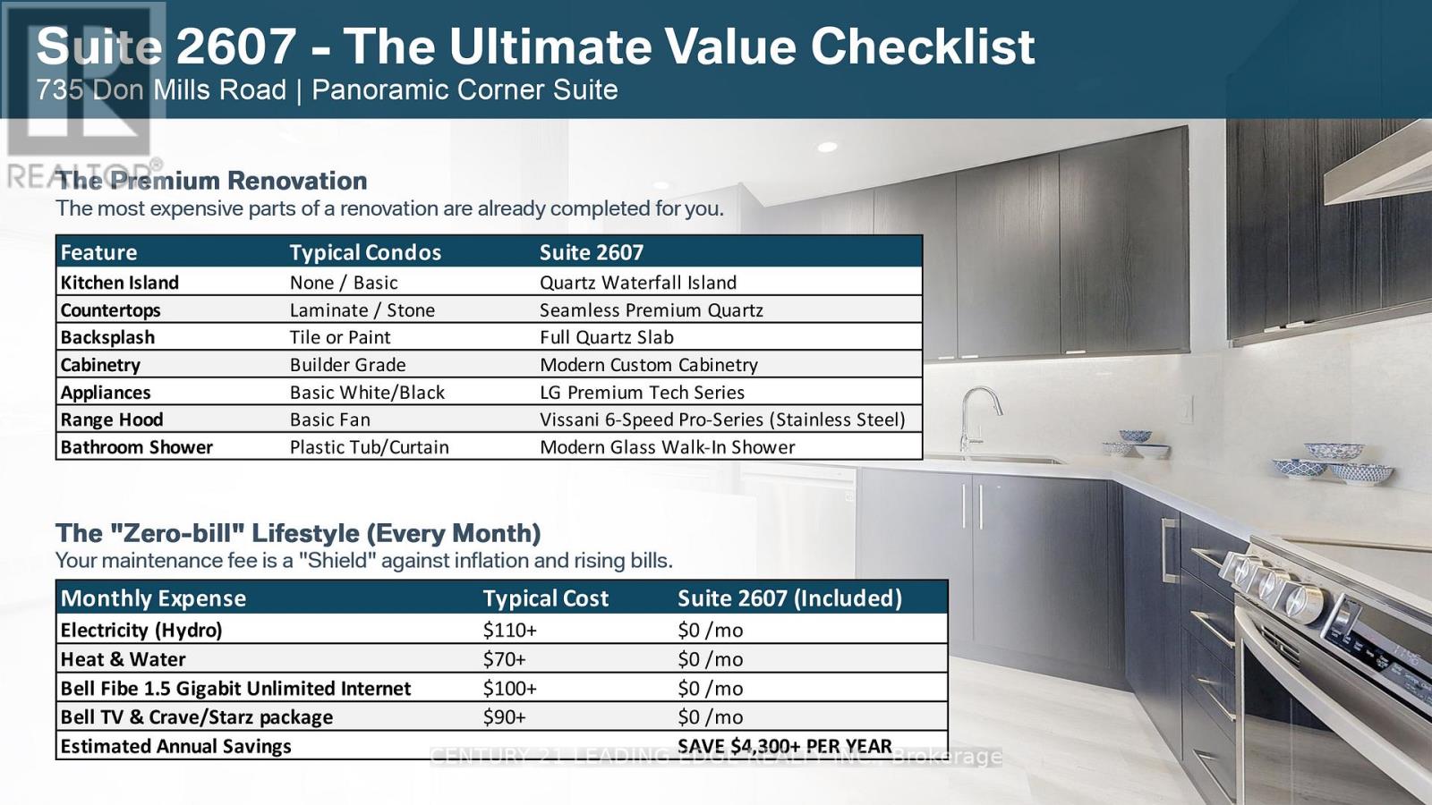 Welcome to Suite 2607 at 735 Don Mills Rd - a spacious, fully renovated corner unit offering exceptional value in today's market. With over 950 sq ft of living space, this home features a rare layout with generous room sizes and built-in cost savings that are increasingly hard to find. Located on the 26th floor, this bright unit offers unobstructed eastern skyline views, large windows, and abundant natural light throughout the day. The thoughtfully designed open-concept layout is ideal for both everyday living and entertaining. The modern kitchen has been fully renovated with quartz countertops, quartz backsplash, a waterfall island, new cabinetry, and premium LG stainless steel appliances, complemented by pot lights and updated fixtures. The bathroom features a sleek, contemporary glass stand-up shower. This well-maintained, non-smoking home includes 2 generous bedrooms, 1 underground parking space, and a large, full-sized storage locker. A major highlight: ALL utilities are included in the maintenance fees - heat, water, electricity, plus premium Bell Fibe 1.5 Gigabit unlimited internet, TV, and Crave/Starz - offering predictable monthly costs and meaningful savings compared to many condo buildings. Residents also enjoy access to premium amenities including an indoor pool, gym, sauna, and garden. Unbeatable location with TTC at your doorstep, quick access to DVP and Hwy 401, minutes to downtown, and close to Costco, East York Town Centre, parks, schools, libraries, banks, restaurants, and the upcoming LRT. An ideal opportunity for first-time buyers or investors seeking space, convenience, and long-term value in a well-established building. Excellent layout with premium renovations and truly hard to replace at this size and price point. (id:64974)