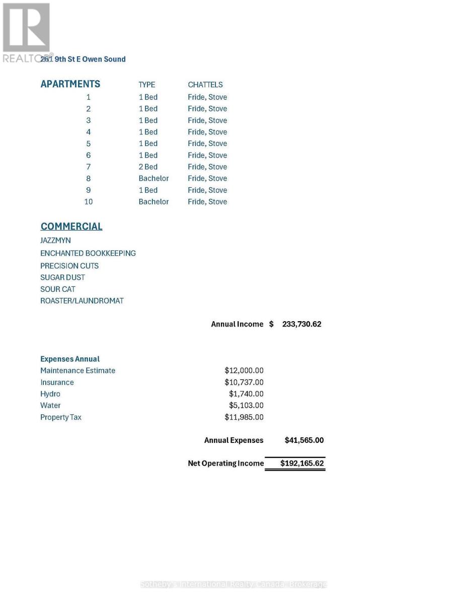 Discover 261 9th Street East, a well-maintained mixed-use property in the heart of Owen Sound. This income-producing building features 6 fully leased commercial units on the ground floor along with 10 residential apartments above. With tenants responsible for their own utilities, this property offers a stable and efficient revenue stream.Located in a high-visibility downtown location, the property benefits from steady foot traffic, strong community presence, and proximity to shops, restaurants, and services. Whether you're an experienced investor or expanding your portfolio, this is a rare opportunity to own a solid mixed-use building in one of Owen Sounds most desirable commercial corridors. (id:64974)