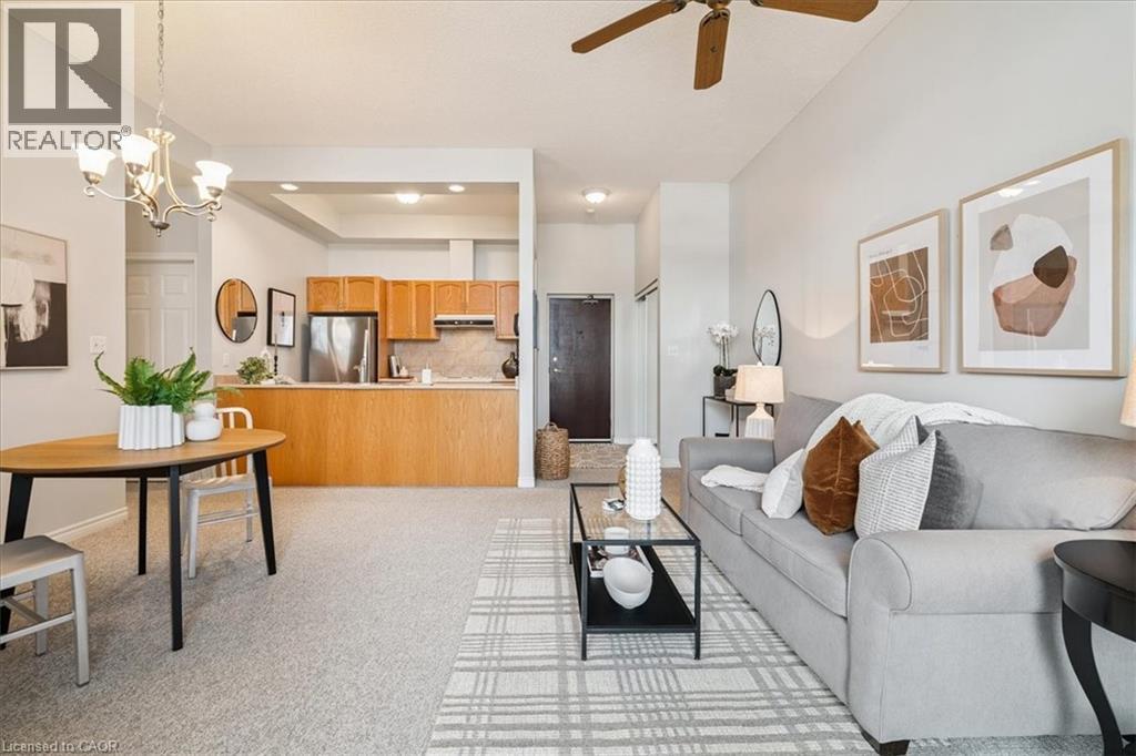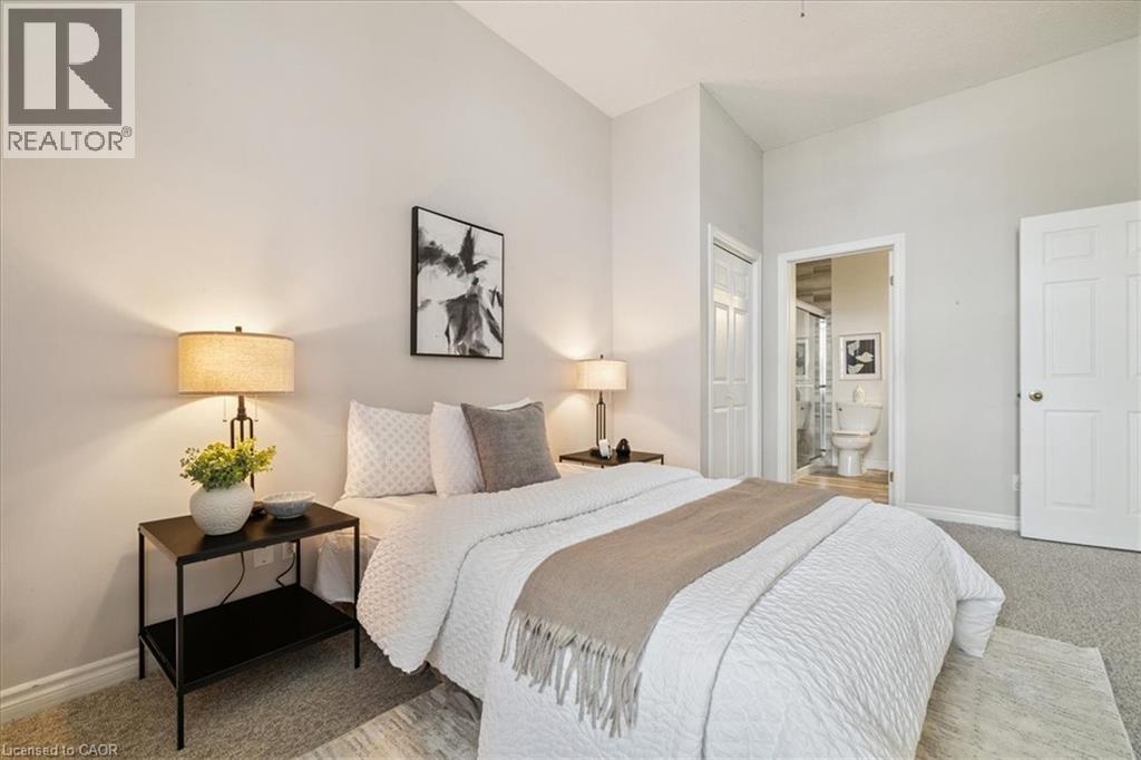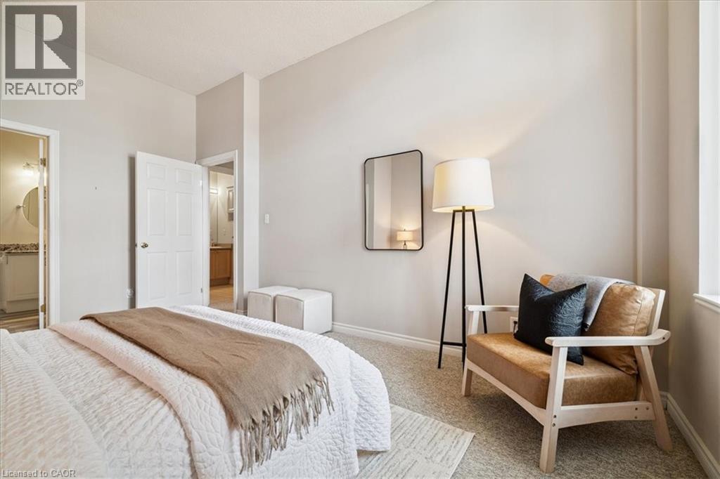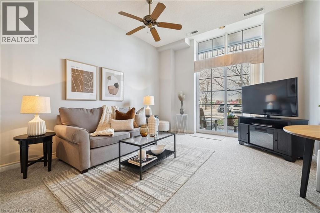 Welcome to this beautiful and spacious 2 bedroom, 2 full bathroom condo located in the highly sought-after Historic Waterdown High School building. Featuring a desirable open-concept layout with impressive 10 ft ceilings, large windows, and transom details, this unit offers a bright and inviting living space filled with natural light. The thoughtfully designed floor plan provides comfortable living and dining along with two well-proportioned bedrooms, including a primary suite complete with its own full ensuite. A sliding door leads to your personal patio space, extending the living area for morning coffees or sunset beverages. Ideally positioned on the first floor and located near the east building entrance, this unit offers exceptional accessibility and everyday convenience—making it one of the most convenient locations in the building. Additional features include in-suite laundry, a large storage locker, and two parking spaces—one underground and one surface space located directly across from the suite. Situated in the heart of Waterdown, this condo is just steps from local shops, restaurants, parks, and everyday amenities, offering comfortable, low-maintenance living in one of the community’s most charming and walkable locations. (id:64974)