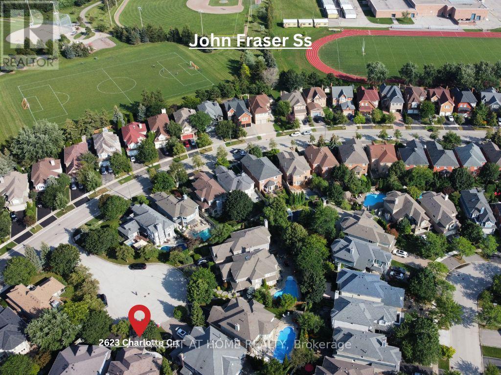 Executive Home on a Premium Court in Central Erin Mills! Welcome to 2623 Charlotte Crt, a beautifully maintained residence nestled on a quiet cul-de-sac private court in one of Mississauga's most desirable communities, offering both privacy and a highly sought-after setting with excellent Feng Shui. The home features a beautiful covered front porch, creating a warm and welcoming entrance with added privacy from the street. This charming space is perfect for enjoying morning coffee or relaxing in the afternoon sun while overlooking the front yard. Situated on a rare pie-shaped lot, the property also offers a fully landscaped, fenced backyard with a tranquil pond, ideal for outdoor enjoyment and entertaining. Offering approx. 3,000 sq. ft., the home showcases hardwood flooring on the main level, a spacious layout, and a modern kitchen with granite countertops, perfect for family living and entertaining. The sun-filled primary bedroom features a private balcony, while the second floor offers 4 generously sized bedrooms and 3 full bathrooms, including 2 ensuites (primary bedroom and second bedroom). Convenient upper-level laundry adds to everyday comfort. Located in a top-ranked school district: John Fraser SS, St. Aloysius Gonzaga SS, Middlebury PS, and Thomas Middle School. Walking distance to schools, parks, community centre, and Erin Mills Town Centre. Minutes to Credit Valley Hospital, major highways, shopping (Walmart, Loblaws, Nations, Rona), dining, and entertainment (Cineplex). A rare opportunity to own a spacious family home in a premium location! Some photos are virtually staged for illustration purposes only. (id:64974)