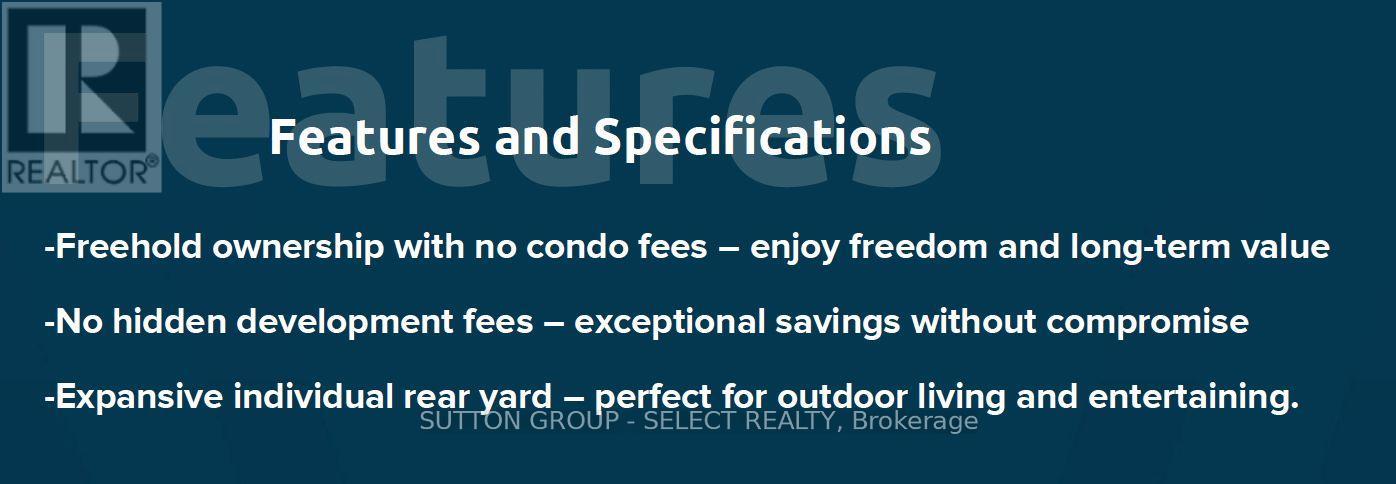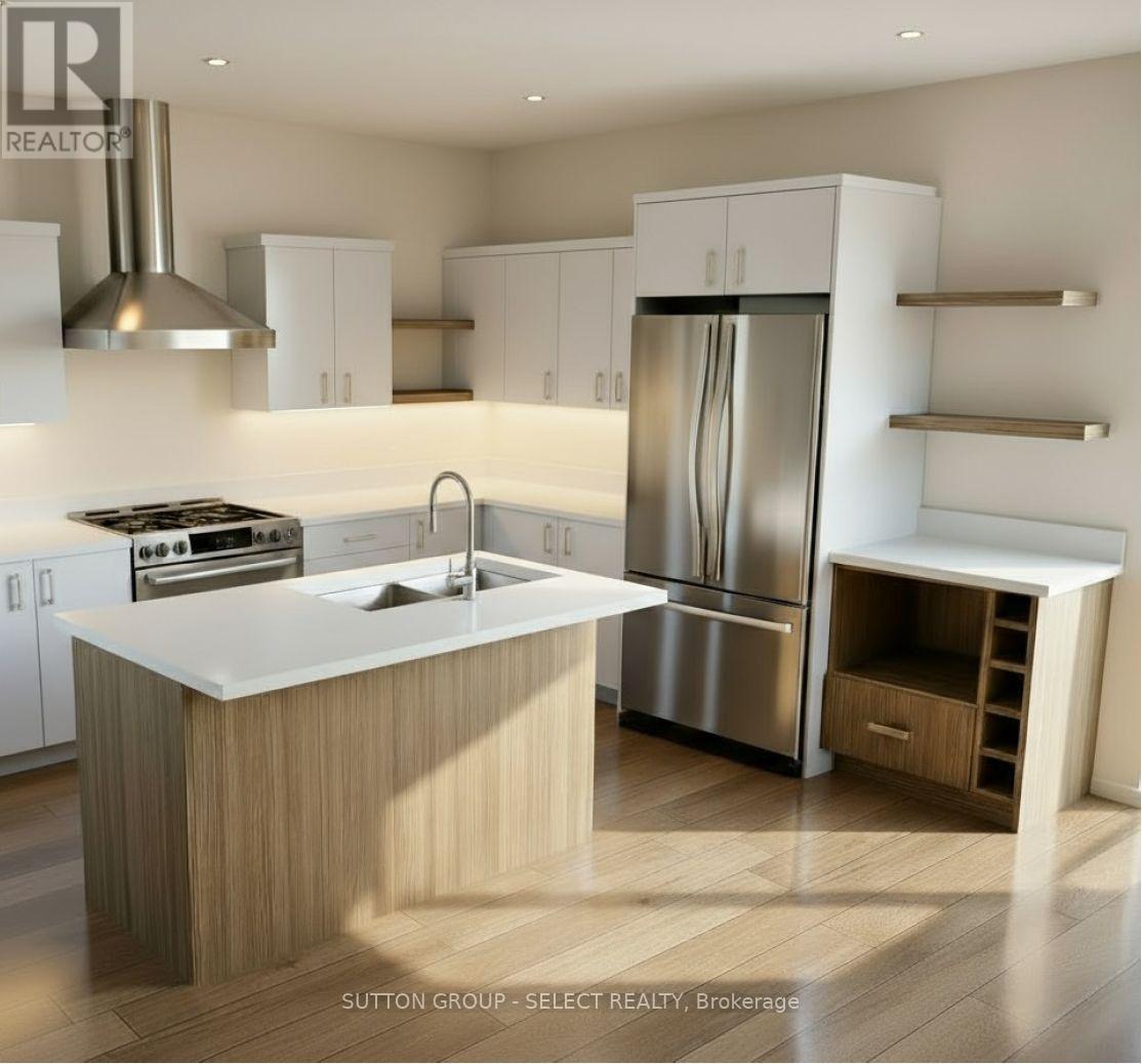 The New HST rebate has not been applied to the list price. The builder will be giving the full rebate amount to all qualified buyers after April 1 priced at $640,000 after applicable rebates, offering incredible value you won't want to miss. This stunning new townhouse community showcases an impressive 1,905 sq. ft. end unit featuring 4 bedrooms and 2.5 bathrooms, thoughtfully designed with comfort, function, and style at the forefront.Designed for versatility, the home offers lower levels with separate side entrances-perfect for multigenerational living or added investment potential. The basement is also roughed in for a kitchenette. These are freehold townhouses with no condo fees, providing complete ownership and long-term value.Step inside to an inviting open-concept main floor highlighted by 9' ceilings, oversized windows, and a luxurious 8' patio door that fills the space with natural light. The custom kitchen shines with quartz countertops, designer lighting, and LVP flooring flowing seamlessly throughout the main and upper levels.The primary suite is a true retreat, complete with a walk-in closet and a spa-inspired ensuite featuring a glass-enclosed tiled shower. Upstairs, enjoy the convenience of a spacious second-floor laundry room with custom cabinetry, sink, and tile flooring.Every detail has been elevated-from the stained staircase with black aluminum spindles to Benjamin Moore premium paint and 8' ceilings on the upper level. The exterior blends James Hardie siding, Aristocrat stone, and stucco accents, finished with bold black windows, soffits, fascia, and eavestroughs for striking curb appeal.Outside, enjoy a large backyard, concrete driveway and walkway, fully sodded lot, and architectural shingles with a limited lifetime warranty. An oversized single-car garage with opener adds even more value. With 8' basement ceilings, the space is ready for your future vision.The Manors on Barn Swallow is a luxurious yet welcoming place to call home-where style (id:64974)