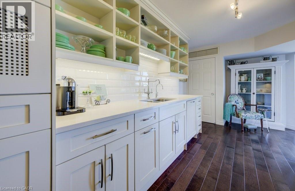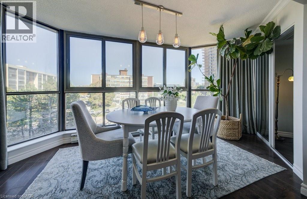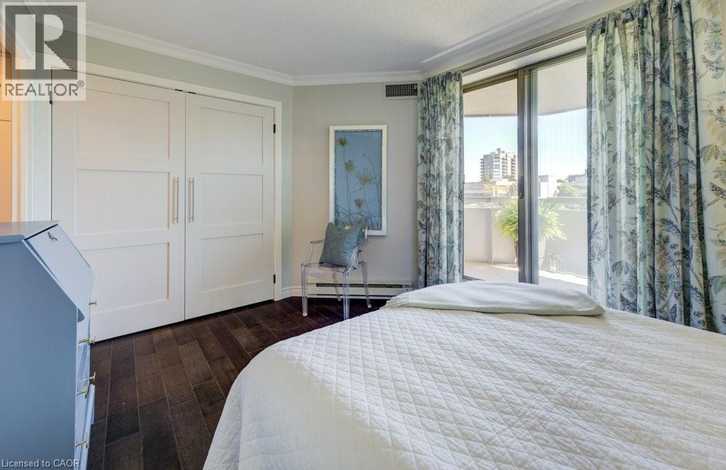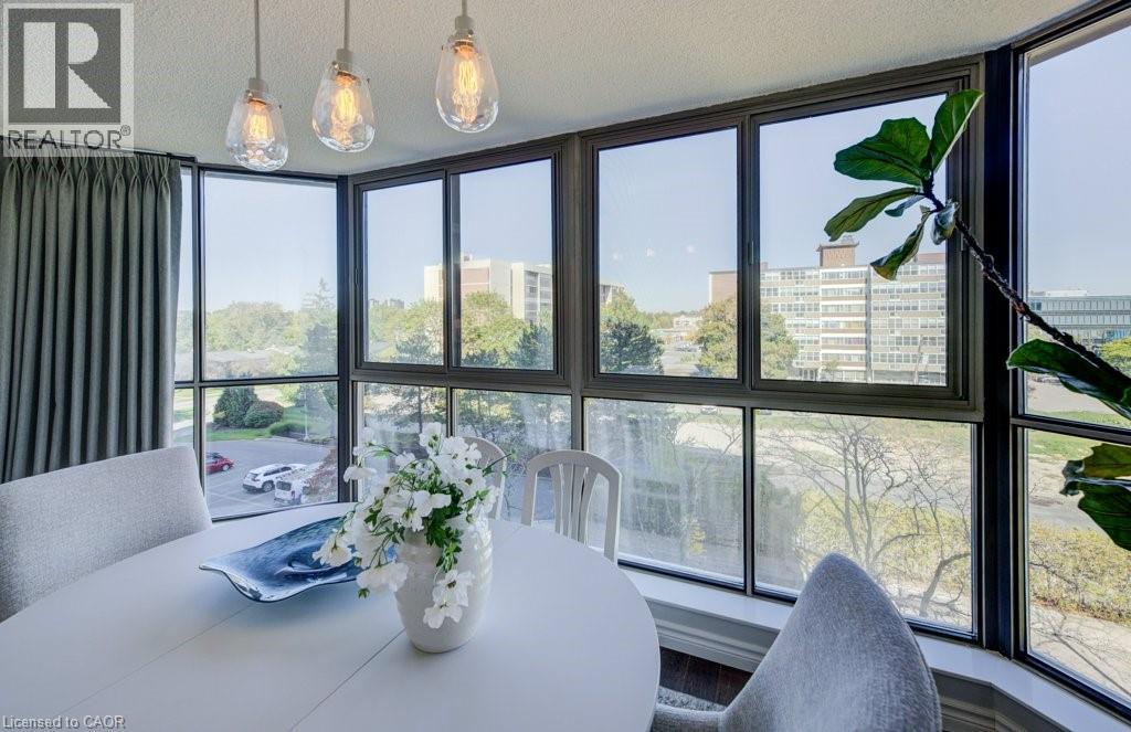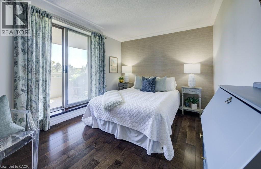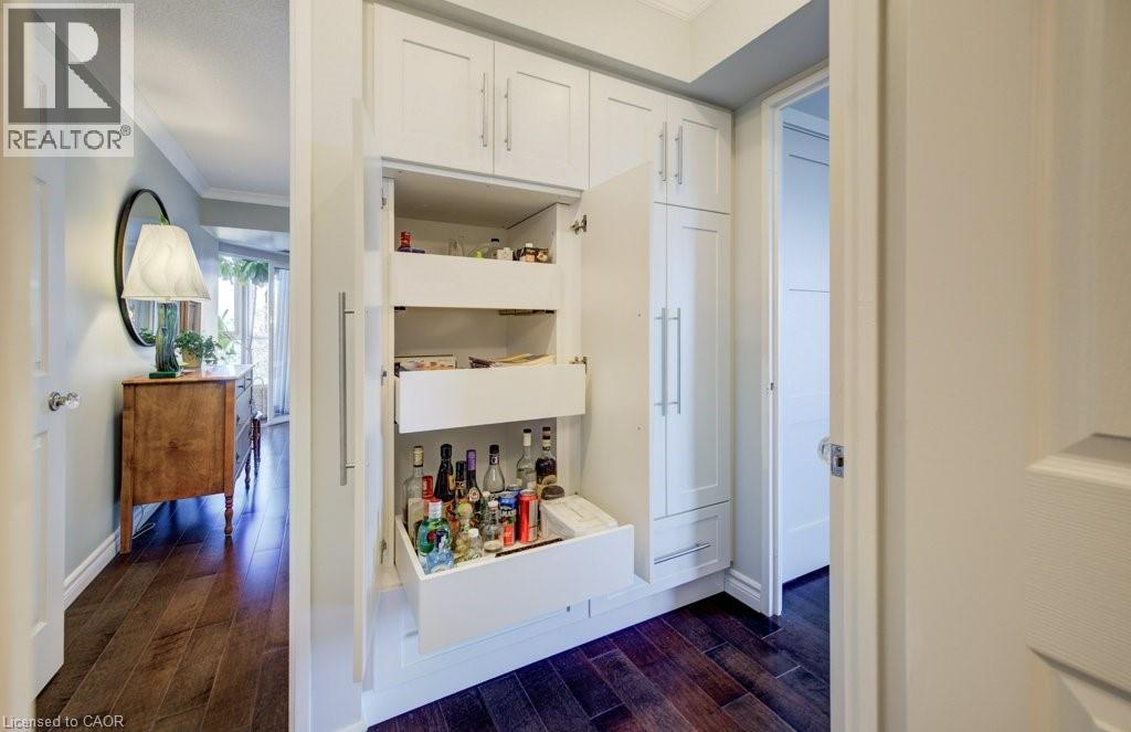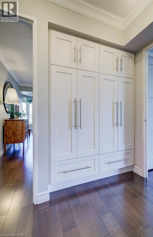 Luxury awaits in this beautifully custom-designed 2-bedroom corner suite at The Beechmount. From the moment you step through the door, the exceptional attention to detail is unmistakable. Expansive windows flood the space with natural light, enhancing the thoughtfully curated design throughout. Fully renovated in 2015 with over $200,000 in high-end upgrades, this residence showcases stunning hardwood flooring, new baseboards, crown moulding, doors, and trim, all complemented by a refined, calming colour palette. The chef-inspired kitchen (2015) is both stylish and functional, featuring sleek cabinetry, quartz countertops, a panel dishwasher, stainless steel refrigerator (2024), and cleverly integrated storage, including a hidden microwave space. An inviting atrium-style dining area overlooks lush greenspace below—an ideal setting for entertaining—while the adjoining living room offers a warm and cozy retreat. The primary bedroom continues the home’s commitment to smart, elegant design, boasting a walk-in closet with floor-to-ceiling custom storage and a private ensuite bathroom. The second bedroom is equally impressive, complete with built-in cabinetry and access to a secluded terrace— overlooking expansive greenspace & perfect for quiet relaxation. A well-appointed 4-piece bathroom connects to a beautifully finished laundry and storage room, featuring high-end Miele washer and dryer (2019), and maintaining the home’s consistent elevated aesthetic. The Beechmount is an amenity-rich condominium, widely regarded as one of the best-managed buildings in the region. Ideally located, you’ll enjoy everyday conveniences just steps from your door. Complete with two underground parking spaces, this rare offering combines luxury, comfort, and turnkey convenience—truly a standout opportunity. (id:64974)