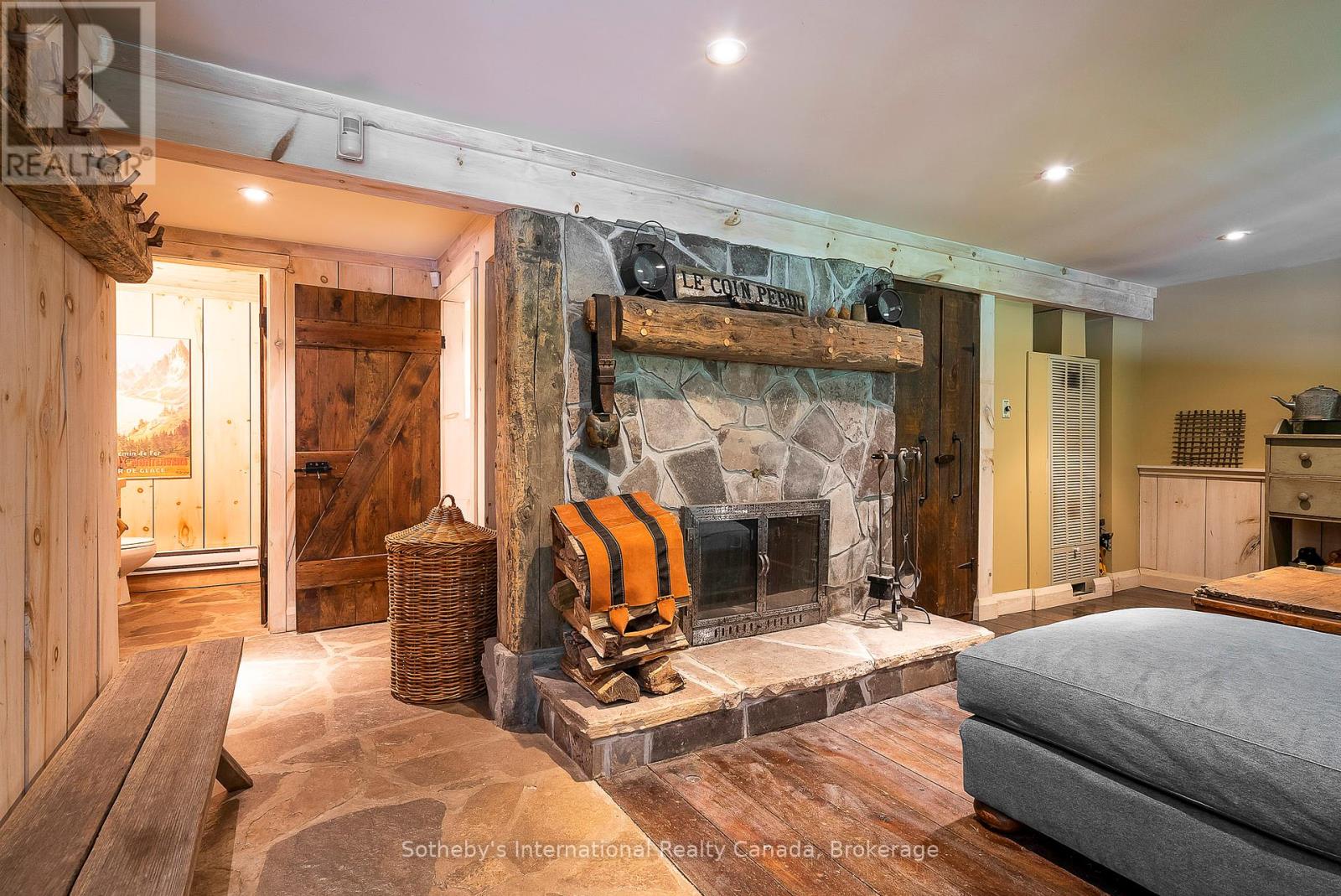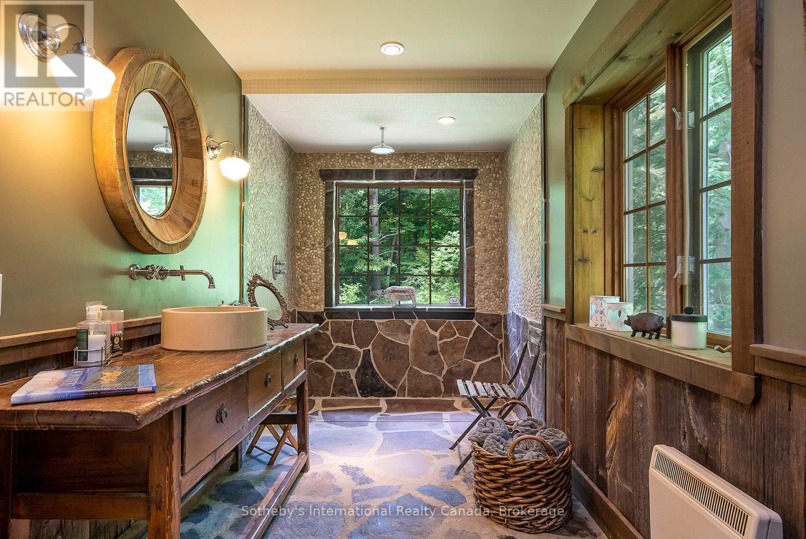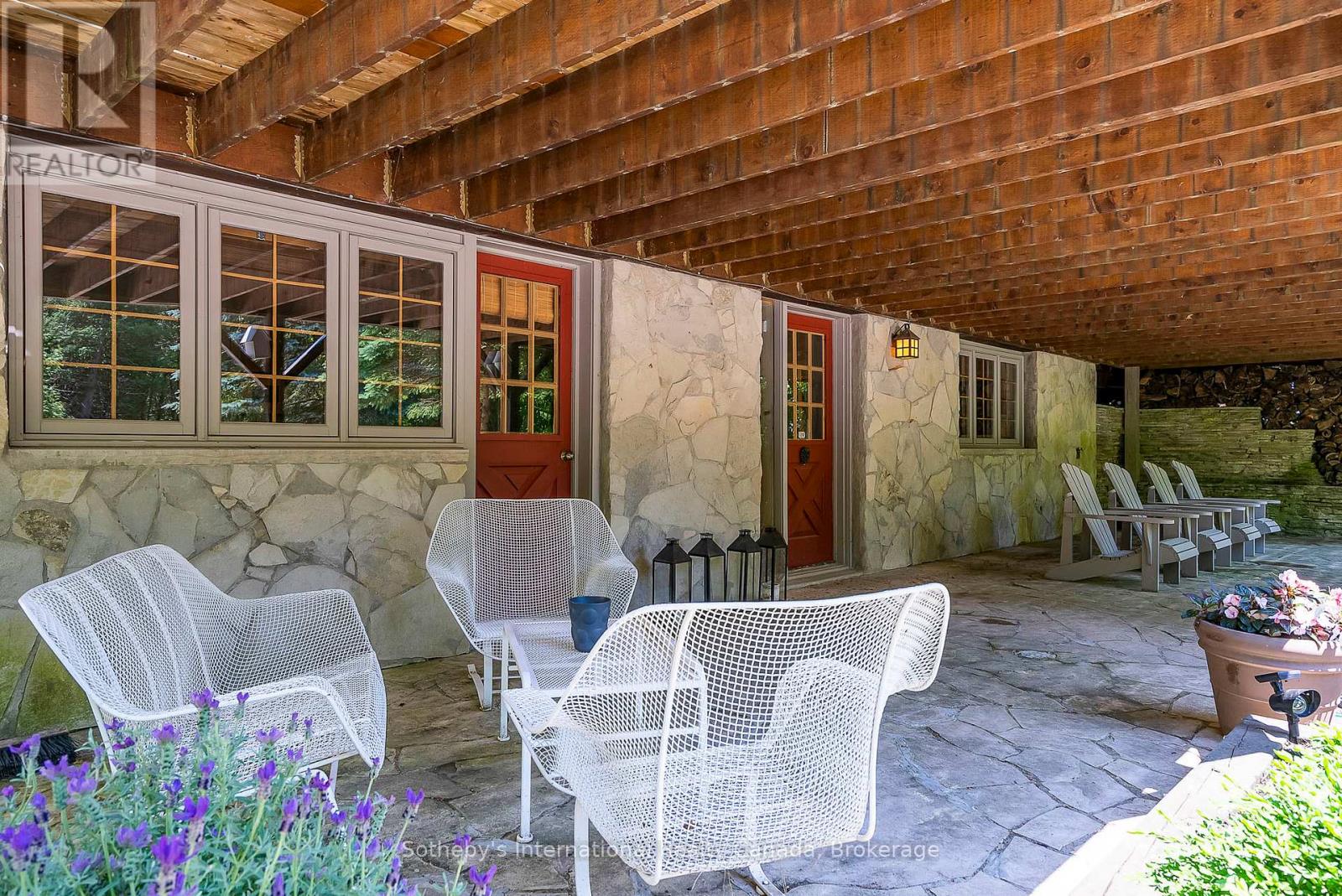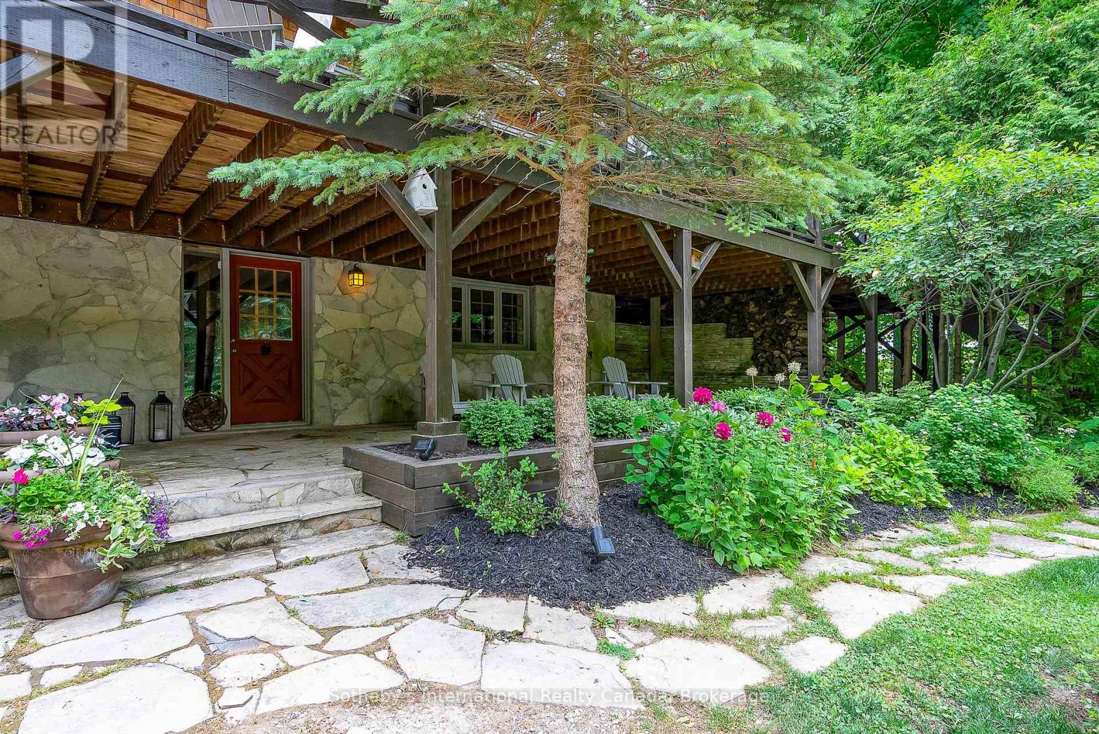 Le Coin Perdu A Private 13-Acre Estate Retreat! Welcome to Le Coin Perdu, a rare sanctuary where timeless craftsmanship meets modern luxury living. Nestled on nearly 13 acres of former vineyard, this private estate offers trails, a managed forest with 300-500 new trees planted annually over 20 years, and a tranquil pond creating the ultimate retreat in nature.Step inside the custom-built residence completely renovated in 1998. Experience rustic elegance at its finest. Hand-hewn post-and-beam timber ceilings, flagstone and BC Pine flooring, and two dramatic stone fireplaces showcase authentic artistry with locally sourced stone and granite finishes. Oversized windows flood the home with light, framing views of lush greenery. The gourmet kitchen features a striking stone sink, stainless steel appliances, reverse osmosis water system, and a dining area with a solid wood table and wraparound banquette perfect for hosting family and friends.The spa-inspired bath offers a jet soaker tub, rainfall shower, and a cedar sauna for four. Outdoors, unwind in the hot tub beneath a canopy of trees, refresh in the outdoor shower, or relax on expansive wraparound decks. The private primary suite includes its own deck for sunset views. A detached 2-car garage built in 2006, crafted with vintage barn board and fieldstone, features a finished 30x40 loft with kitchenette, brass sink, pool table, TV lounge, and full field stone bathroom with open shower ideal for entertaining. Located minutes from Georgian Bays pristine shoreline, Meaford Harbour, premier golf, ski clubs, hiking, biking trails, and vibrant local markets, Le Coin Perdu offers an unmatched lifestyle of luxury, privacy, and adventure.This one-of-a-kind retreat blends European charm, rustic warmth, and modern amenities into a legacy property designed for those who value nature, comfort, and timeless beauty. (id:64974)