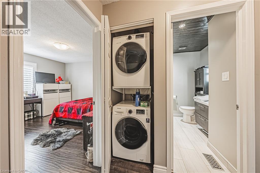 Chic an Sassy!This gorgeous, beautifully maintained stacked townhome on South Hamilton Mountain – is move in ready! The open concept second floor is well appointed with beautiful white kitchen cabinetry, stainless steel appliances, a spacious living room/dining room with walkout to a large terrace and 2-piece bathroom. The primary bedroom is unique with its own balcony. The second bedroom is spacious and the perfect retreat. There is a 4-piece and washer/dryer on this level. Carpet free thru-out with rich dark flooring, recently updated Furnace, Air Conditioner and Patio Door. Just a short drive to Ancaster, Stoney Creek, Downtown Hamilton, minutes to the Linc Access, Conveniently located close to parks, trails, schools, library, and shopping. (id:64974)