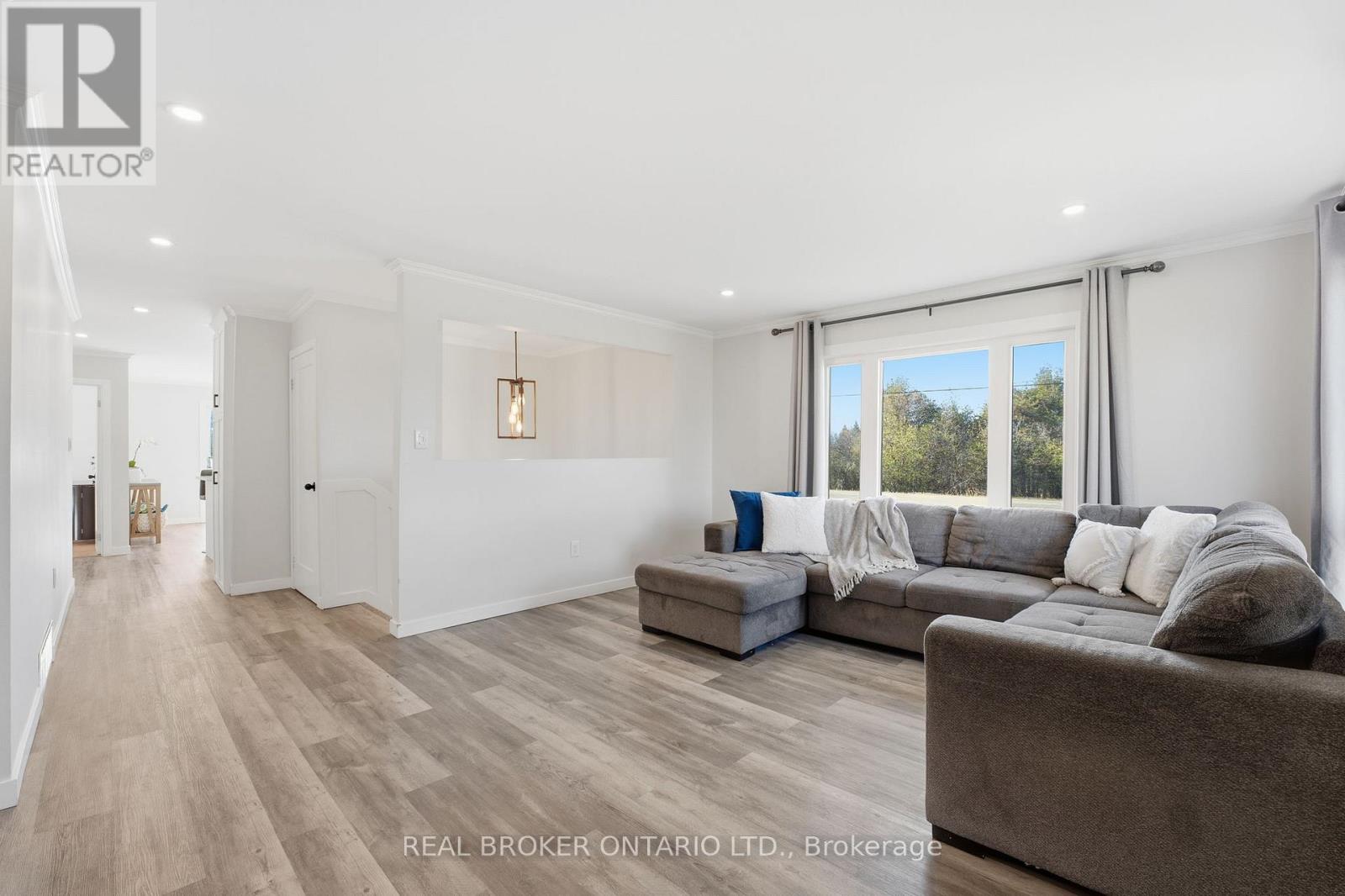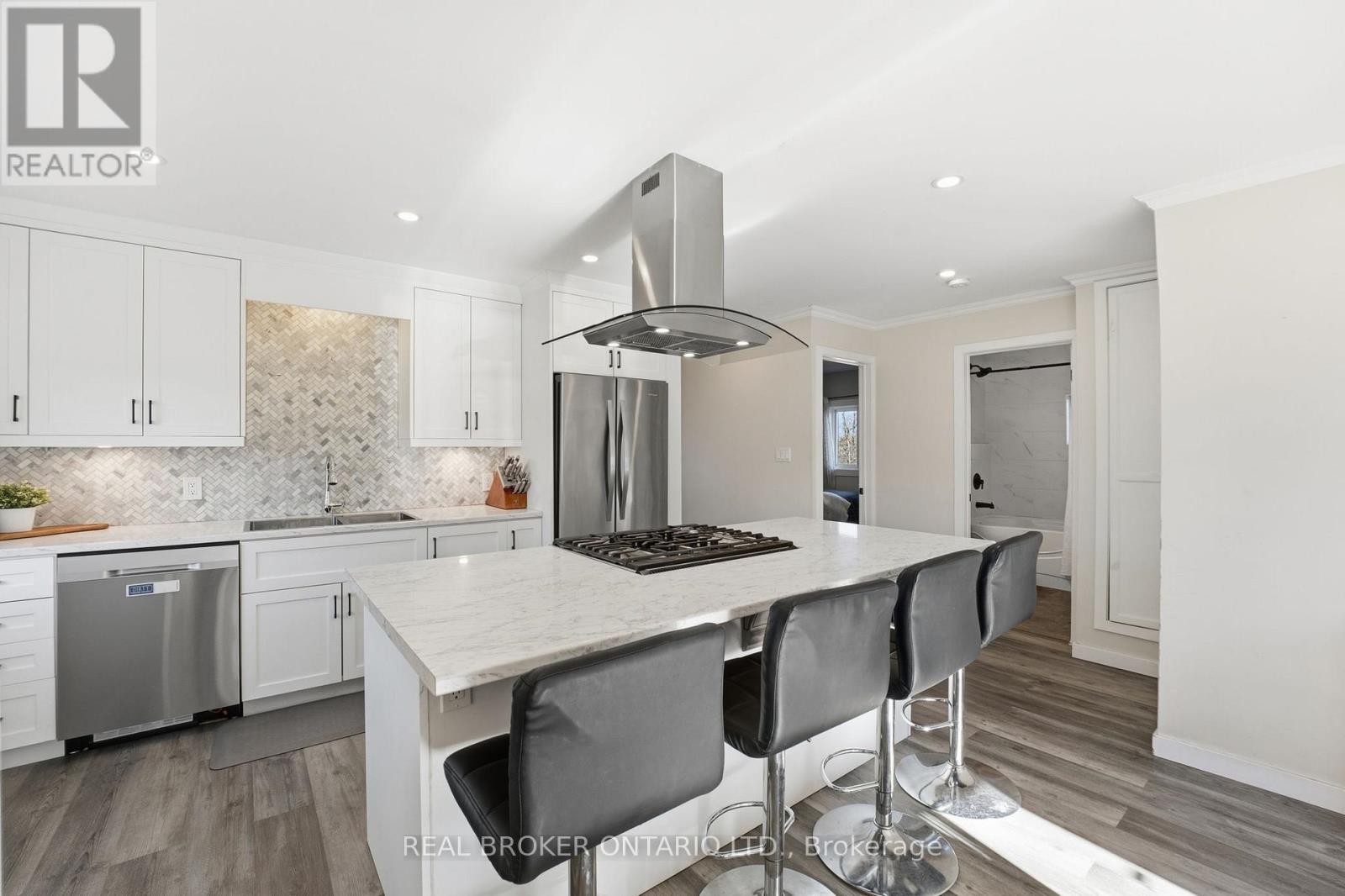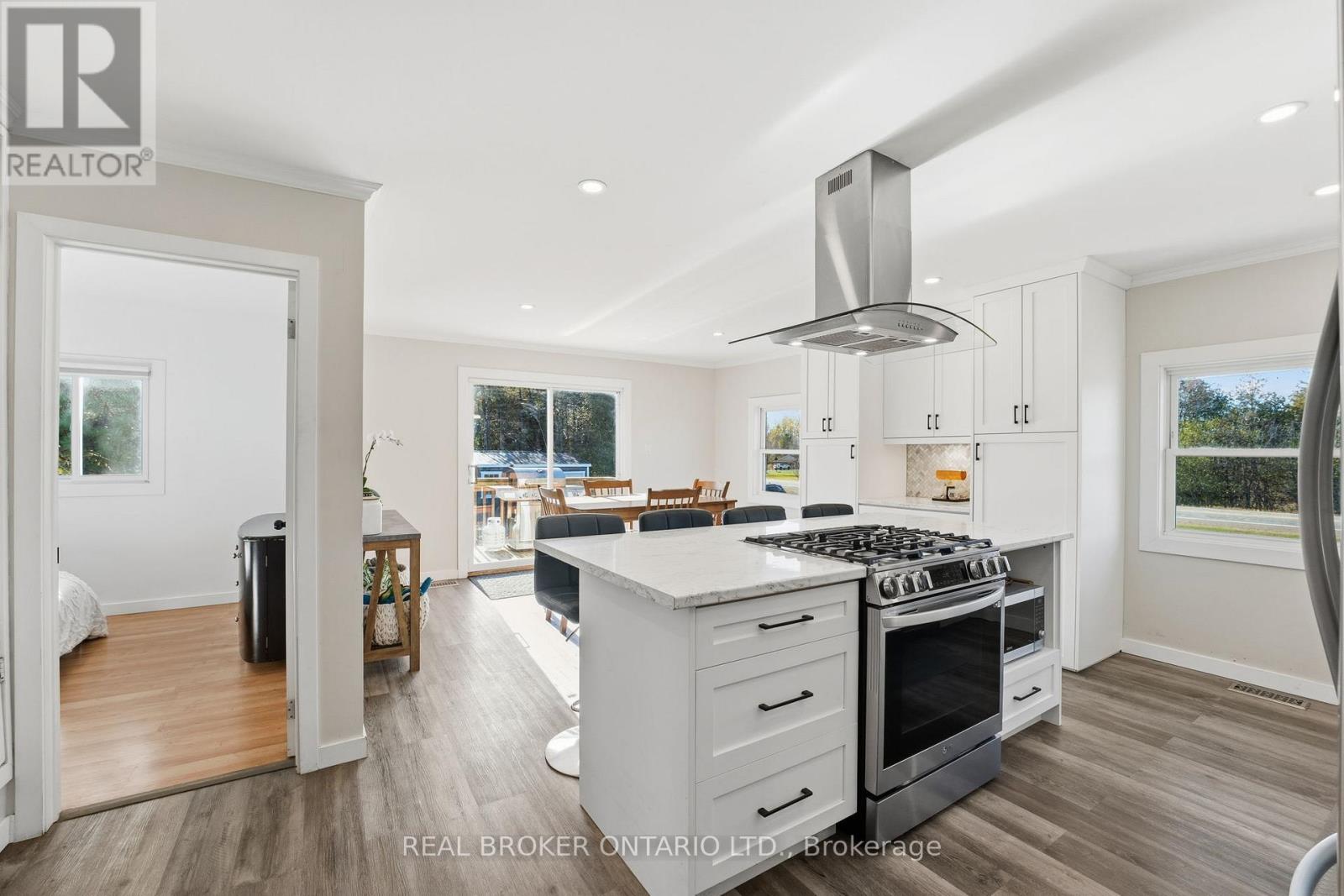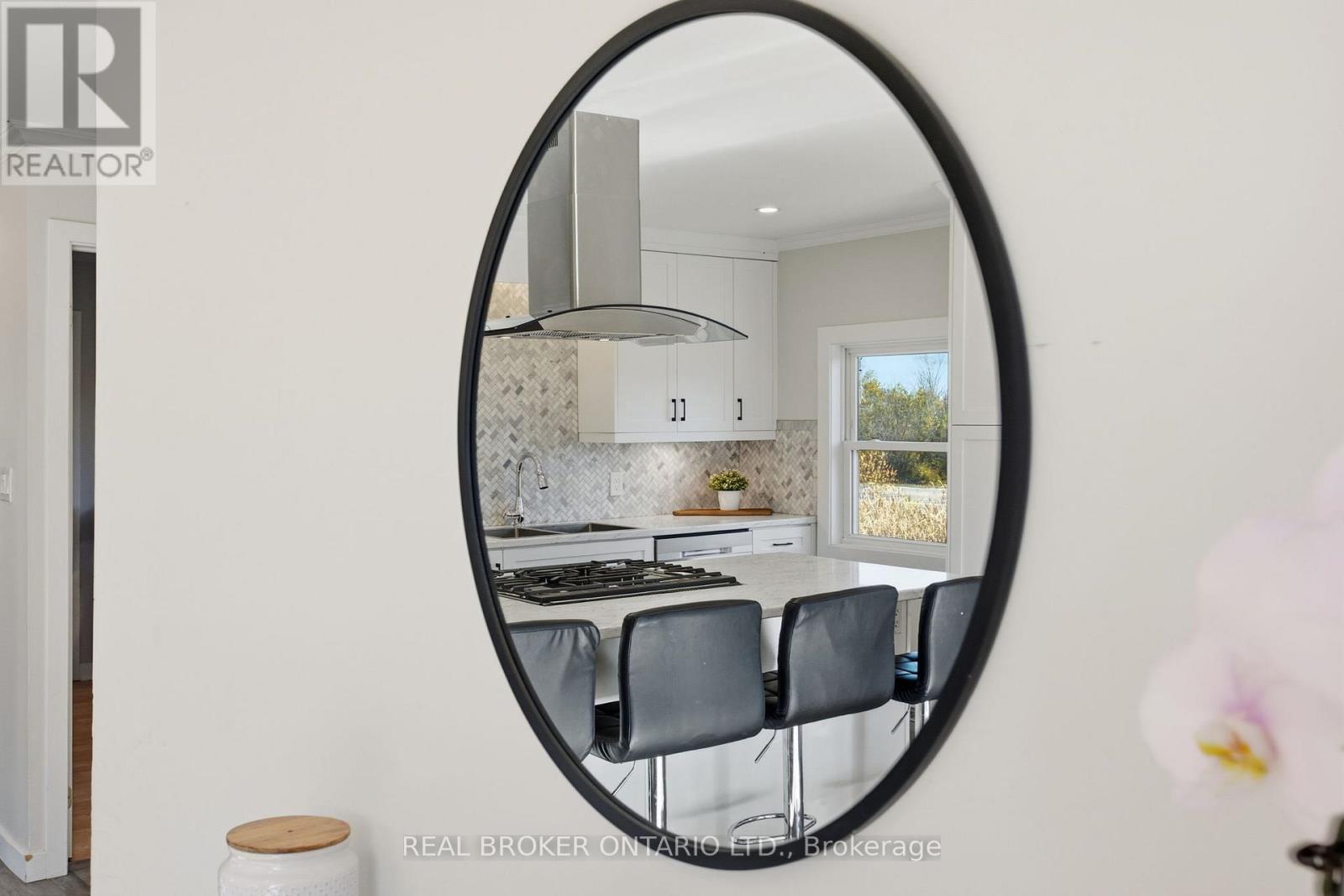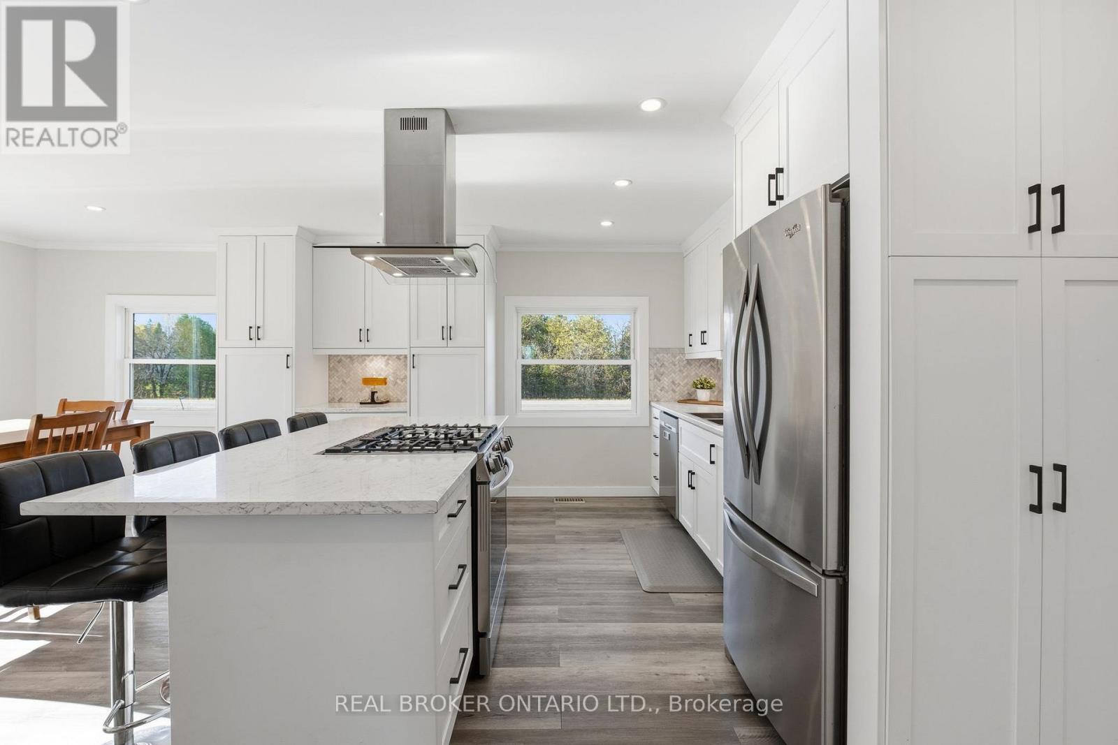 Beautifully renovated home, a heated & cooled shop & tons of room for hobbies, gardening & evening fire pit gatherings. You won't want to miss out on this 4 bedroom high ranch home on over an acre of land! Perfect quiet country setting. Enjoy privacy and space and just minutes to the amenities & charm of downtown Merrickville. This perfectly sized home was transformed in 2023, and features new vinyl siding with stonework and 2" energy board. New floors, ceilings and nicely updated bathrooms. The kitchen is a showstopper with sleek modern cabinetry, gorgeous backsplash, a huge island, and an open concept dining area with patio doors leading to the huge deck.. perfect for entertaining or relaxing in the hot tub. The living room is a quiet inviting space with a huge window. Versatile office off the living room could be a bedroom, or a play area to hide all the kids toys! 2 other bedrooms round out the main level. The lower level provides flexibility for family and guests with a large gym/den (you chose!) A spacious bedroom and a beautiful full bathroom. This home has it all; including practicality and good value. The perfect balance of style, comfort and country living. (id:64974)