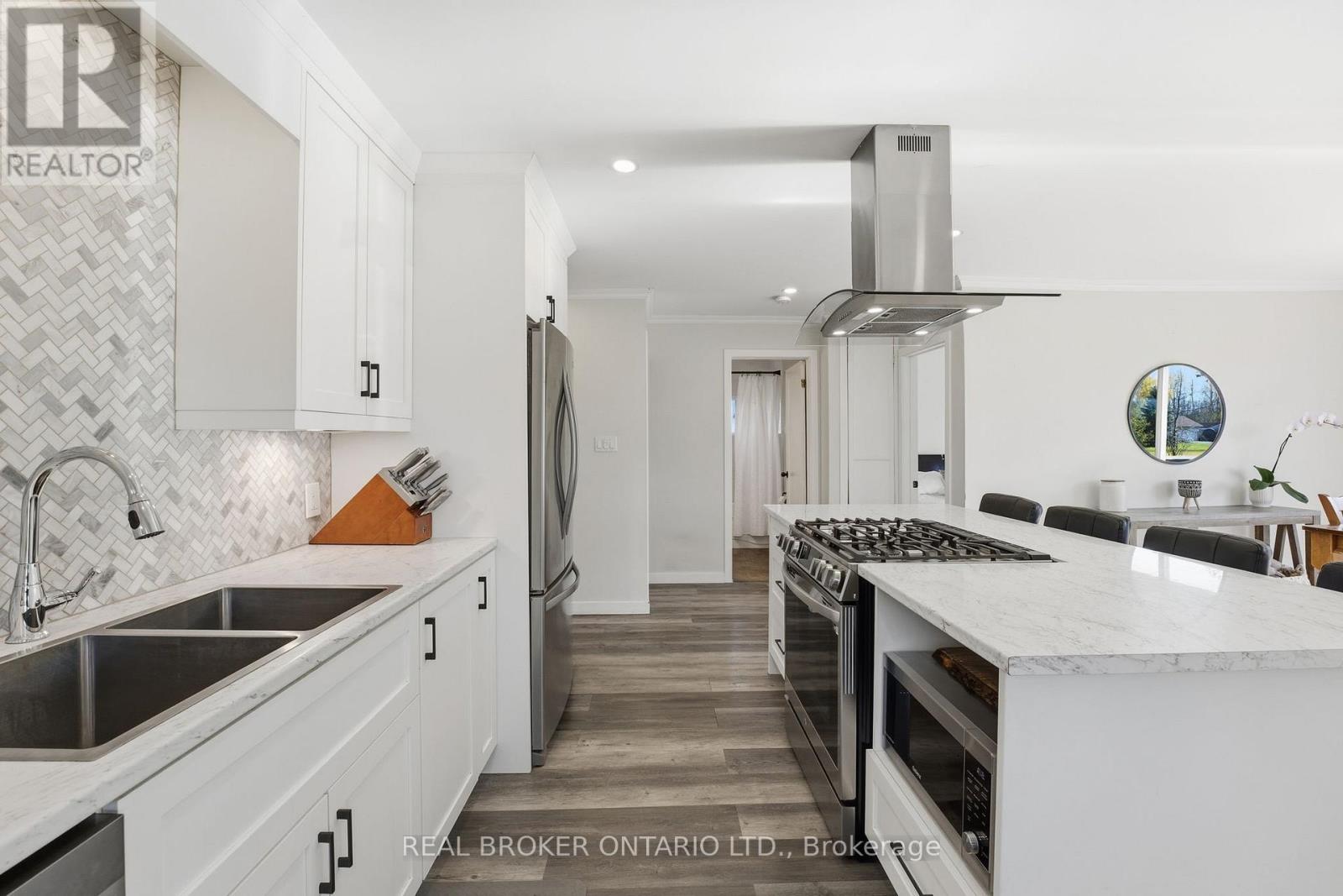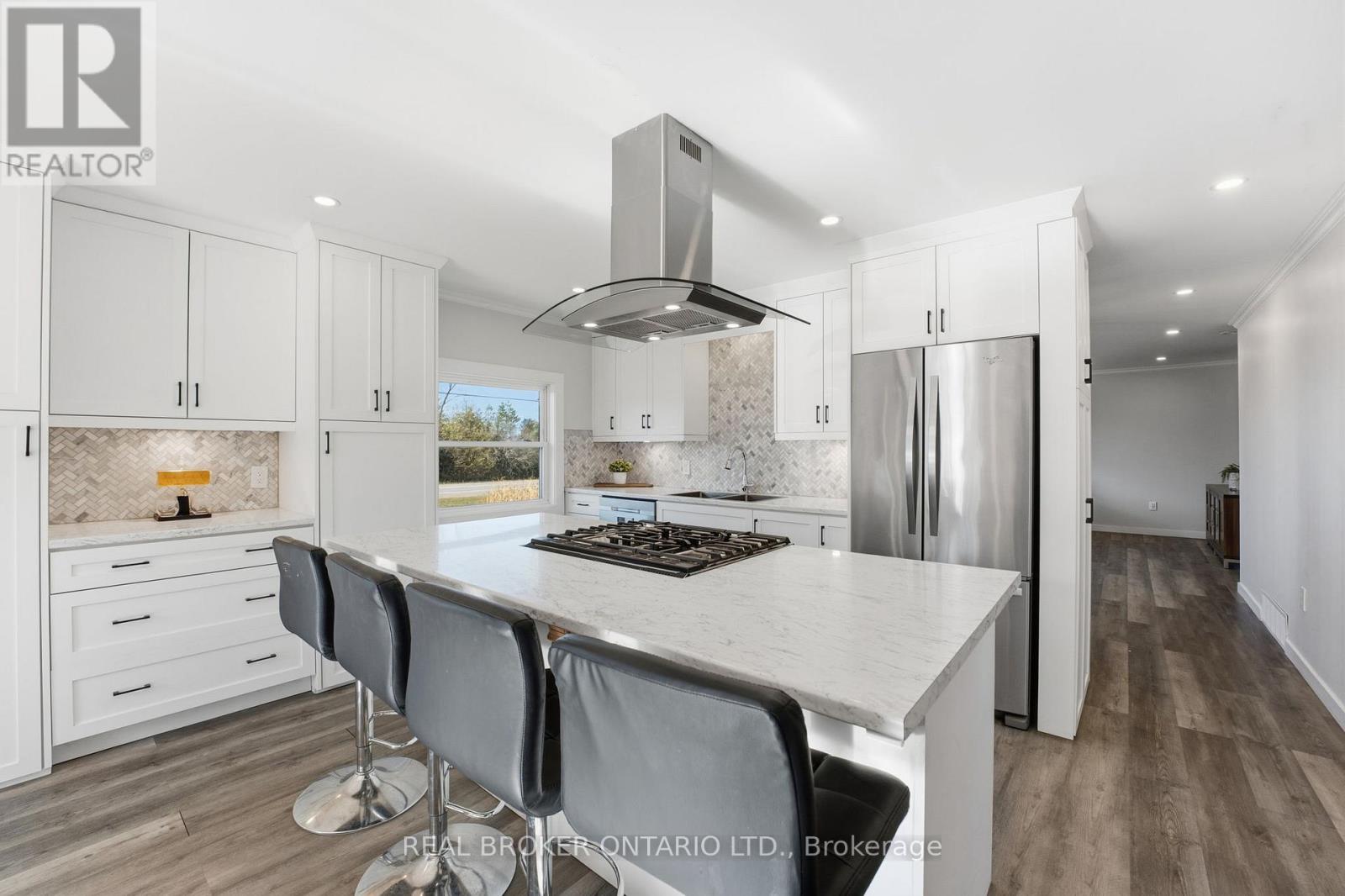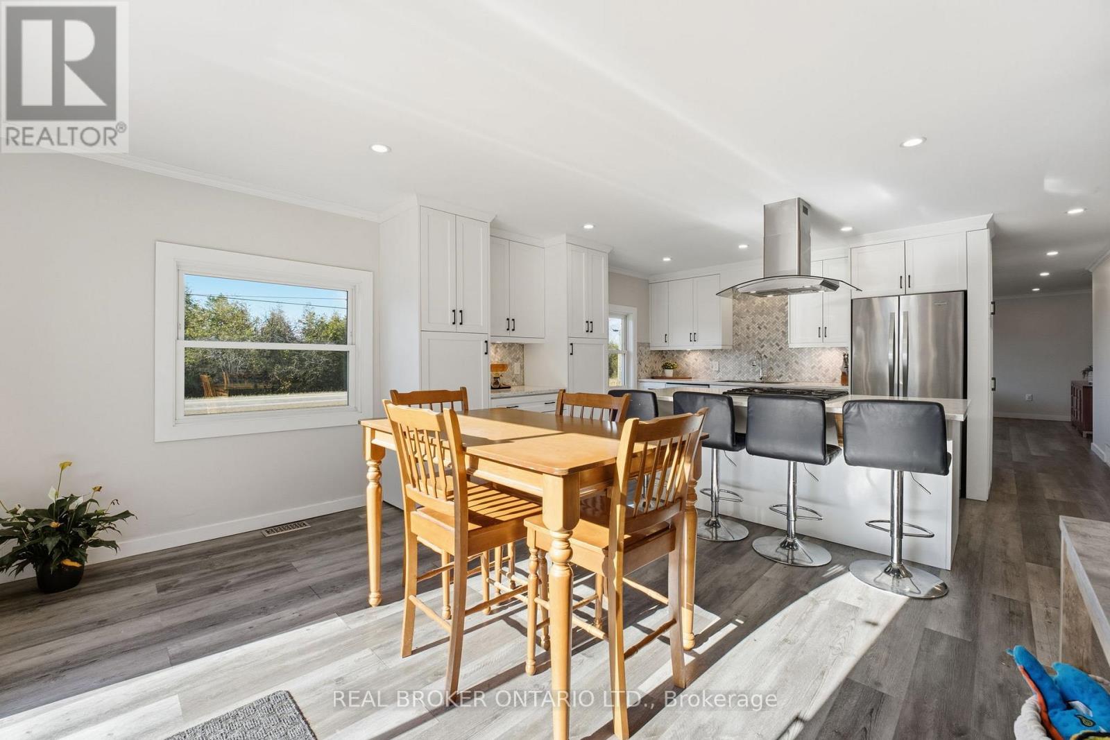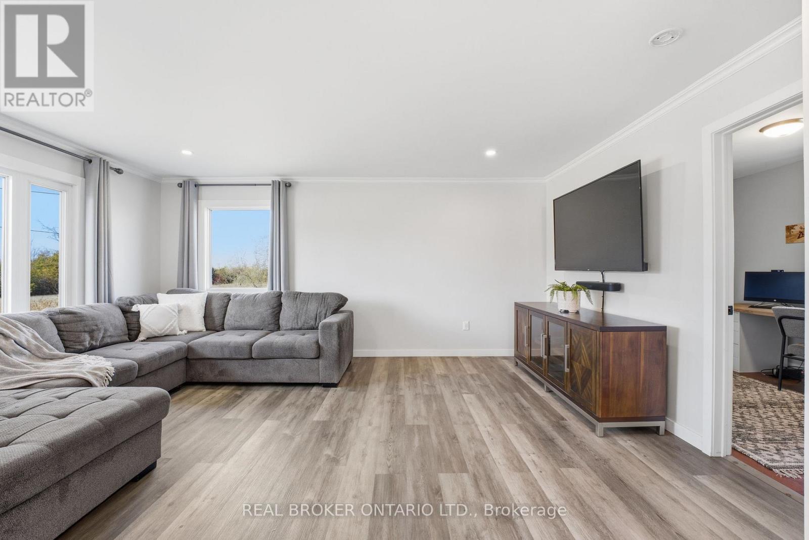 Beautifully renovated home, a heated & cooled shop & tons of room for hobbies, gardening & evening fire pit gatherings. You won't want to miss out on this 4 bedroom high ranch home on over an acre of land! Perfect quiet country setting. Enjoy privacy and space and just minutes to the amenities & charm of downtown Merrickville. This perfectly sized home was transformed in 2023, and features new vinyl siding with stonework and 2" energy board. New floors, ceilings and nicely updated bathrooms. The kitchen is a showstopper with sleek modern cabinetry, gorgeous backsplash, a huge island, and an open concept dining area with patio doors leading to the huge deck.. perfect for entertaining or relaxing in the hot tub. The living room is a quiet inviting space with a huge window. Versatile office off the living room could be a bedroom, or a play area to hide all the kids toys! 2 other bedrooms round out the main level. The lower level provides flexibility for family and guests with a large gym/den (you chose!) A spacious bedroom and a beautiful full bathroom. This home has it all; including practicality and good value. The perfect balance of style, comfort and country living. (id:64974)