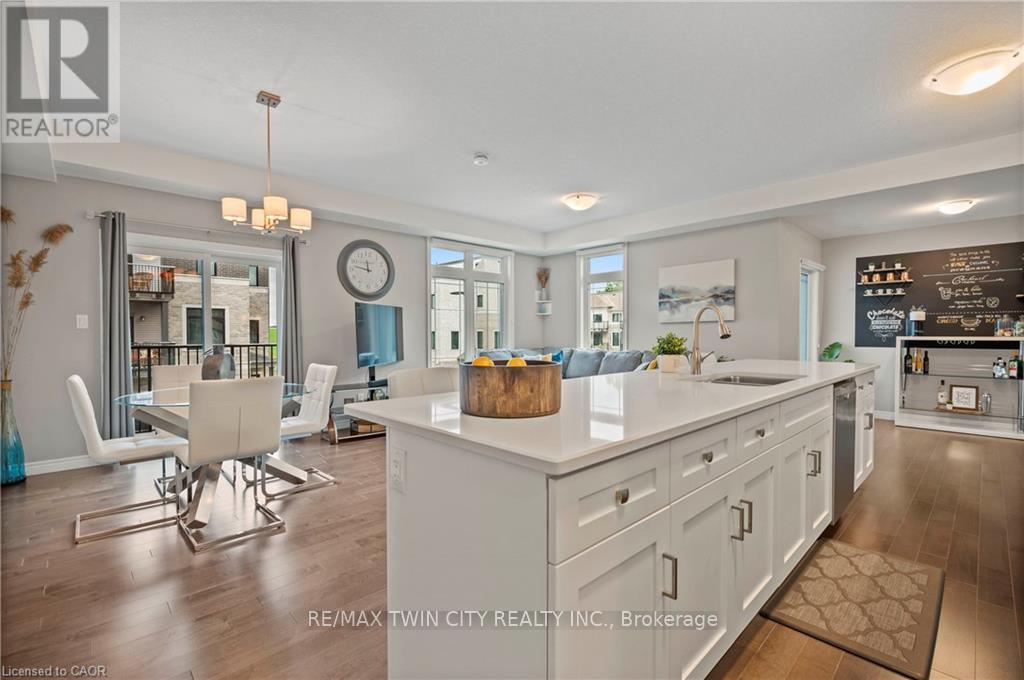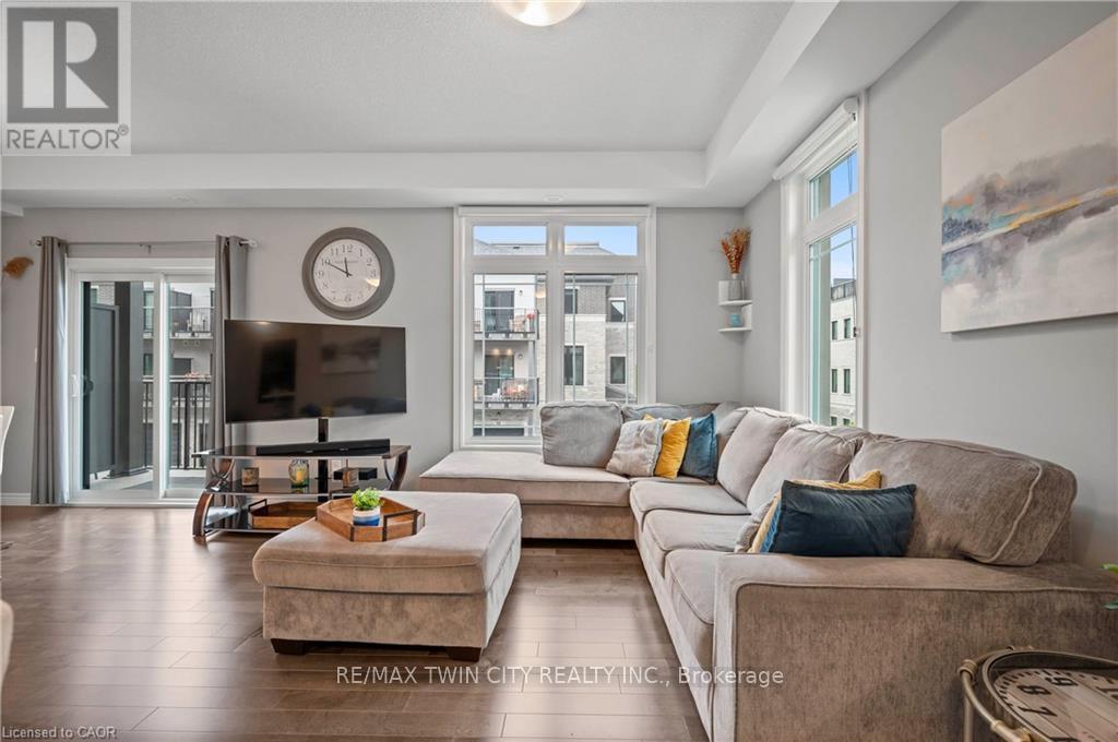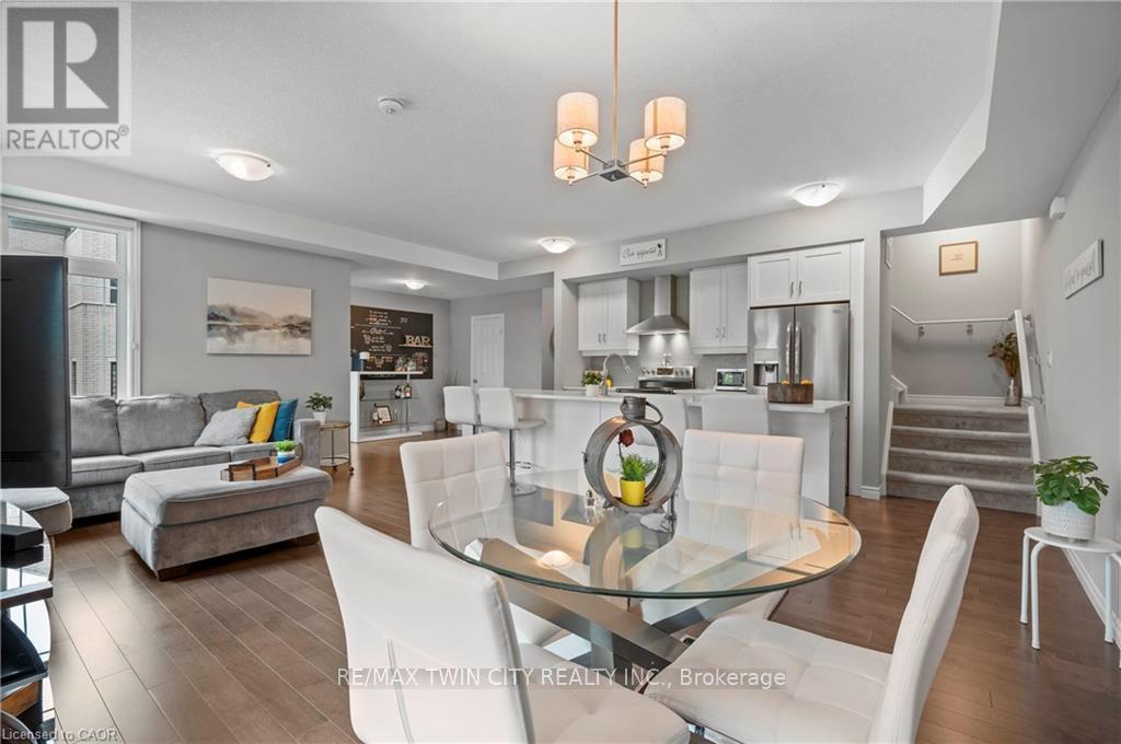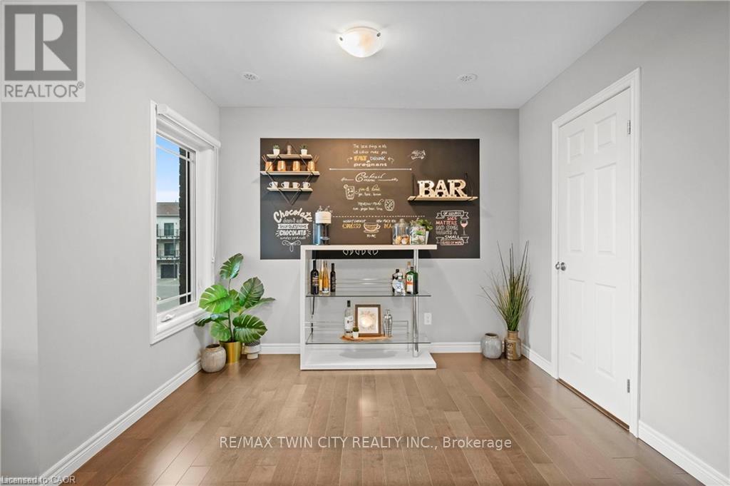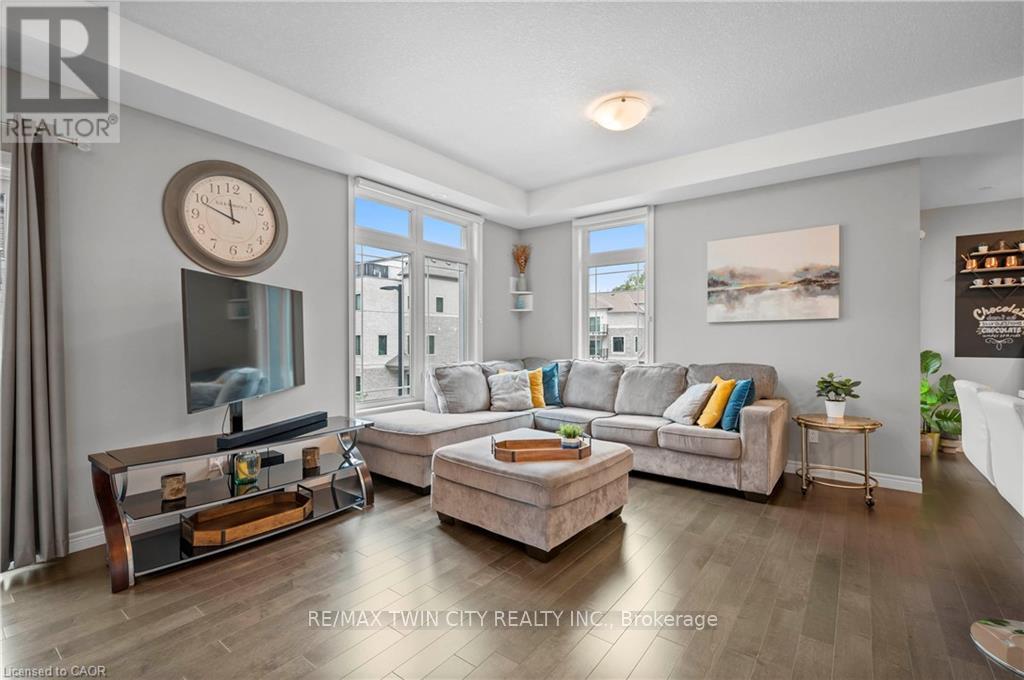 Welcome to 27-107 Westra Dr, featuring the stunning Soho Floorplan, the largest design on-site, & a rare 3 bedroom, 3 balcony setup with over $20,000 in upgrades. Nestled on a quaint street in a quiet, family-friendly neighborhood, this home offers a perfect blend of elegance & functionality. Upon entry, you'll be welcomed by a spacious family room adorned with hardwood floors. Access to laundry facilities for your ease & storage. The breathtaking kitchen boasts upgraded white cabinetry, a stylish back splash, & striking stone counter tops. High-end SS appliances elevate the cooking experience, while the enormous center island serves as a focal point for casual dining or entertaining. The adjacent sun-drenched dining area is perfect for formal gatherings. The living room, also with solid hardwood floors, flows seamlessly from the kitchen & dining area. Sliding doors lead to a serene balcony, ideal for unwinding or hosting outdoor gatherings. A convenient powder room completes this level. Upstairs, the spacious primary bedroom features a double closet & sliding doors to a private balcony. Two additional generously sized bedrooms offer plenty of closet space. The pristine 4-piece bathroom includes a shower/tub combination & a sleek vanity with stone counter tops & upgraded white cabinetry. On the top floor, a bonus room awaits, perfect for an office or workout area. Step out to your spectacular private rooftop patio, perfect for relaxation & entertaining. Located just steps from Ellis Creek Park & Mitchell Park, enjoy picturesque walking trails. The West End Community Centre, with its skating rinks & pool, is also nearby. Families will appreciate the proximity to Mitchell Woods Public School. Additionally, multiple shopping centers, including Costco & Zehrs, as well as various dining options, are conveniently close by. This home is a perfect blend of luxury & convenience, making it an ideal choice for families. Don't miss the opportunity to make it yours! (id:64974)