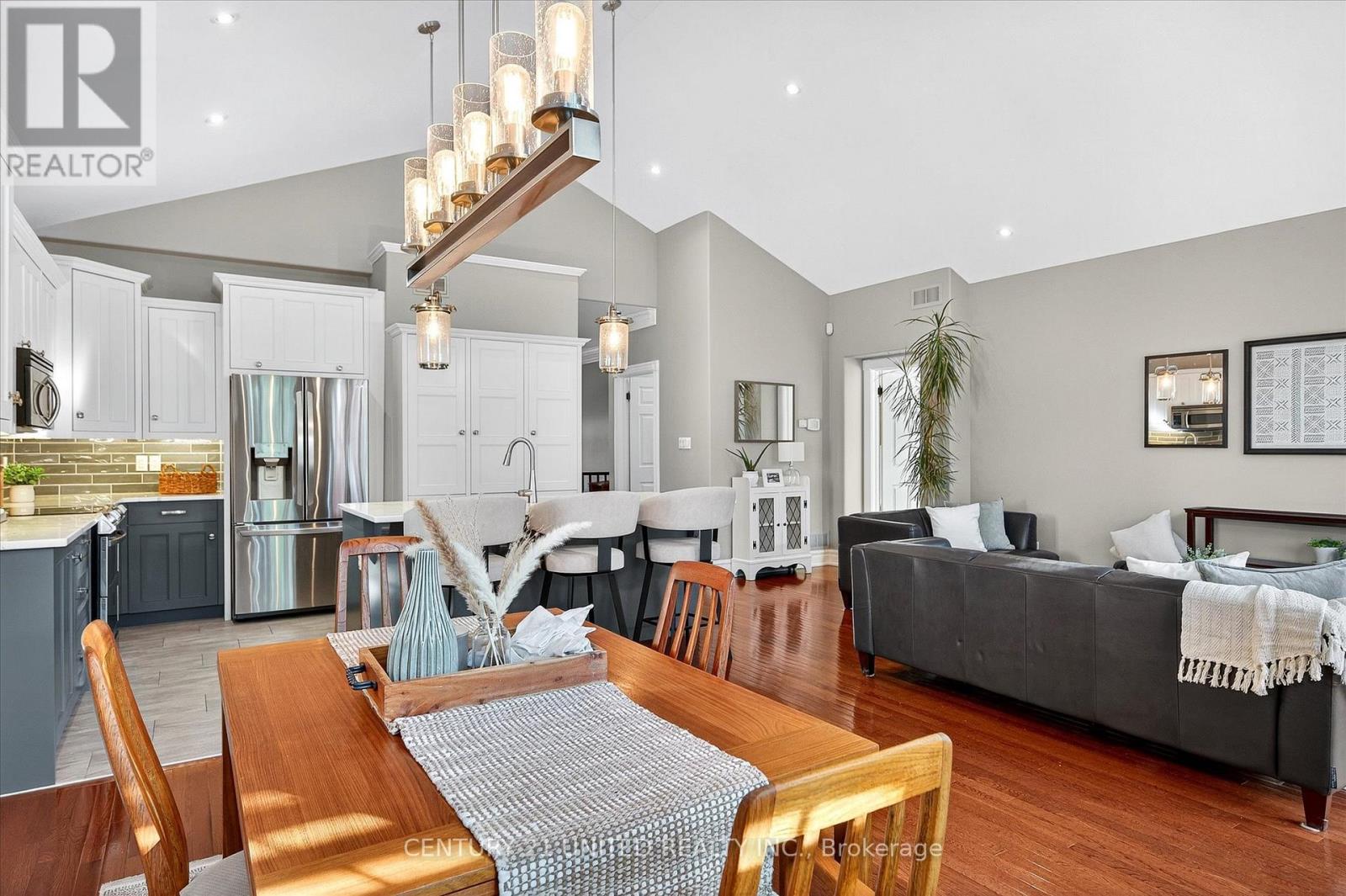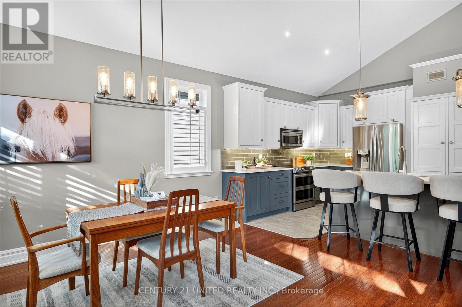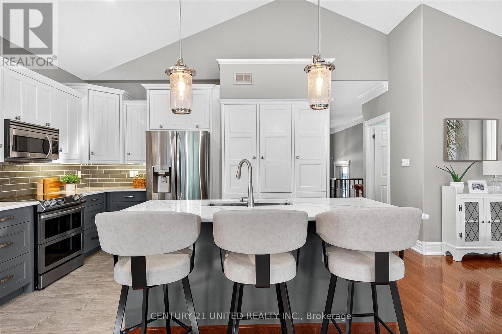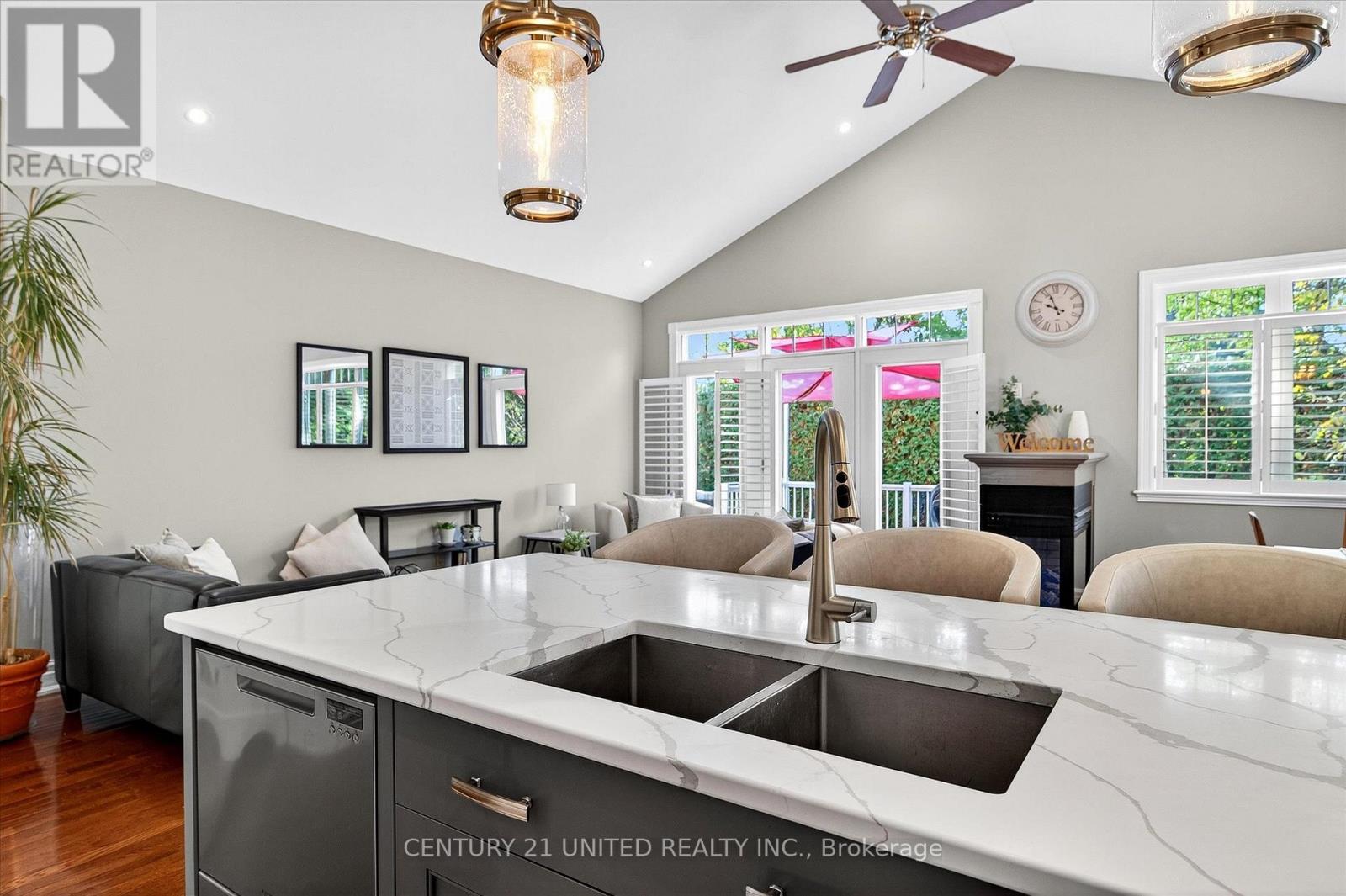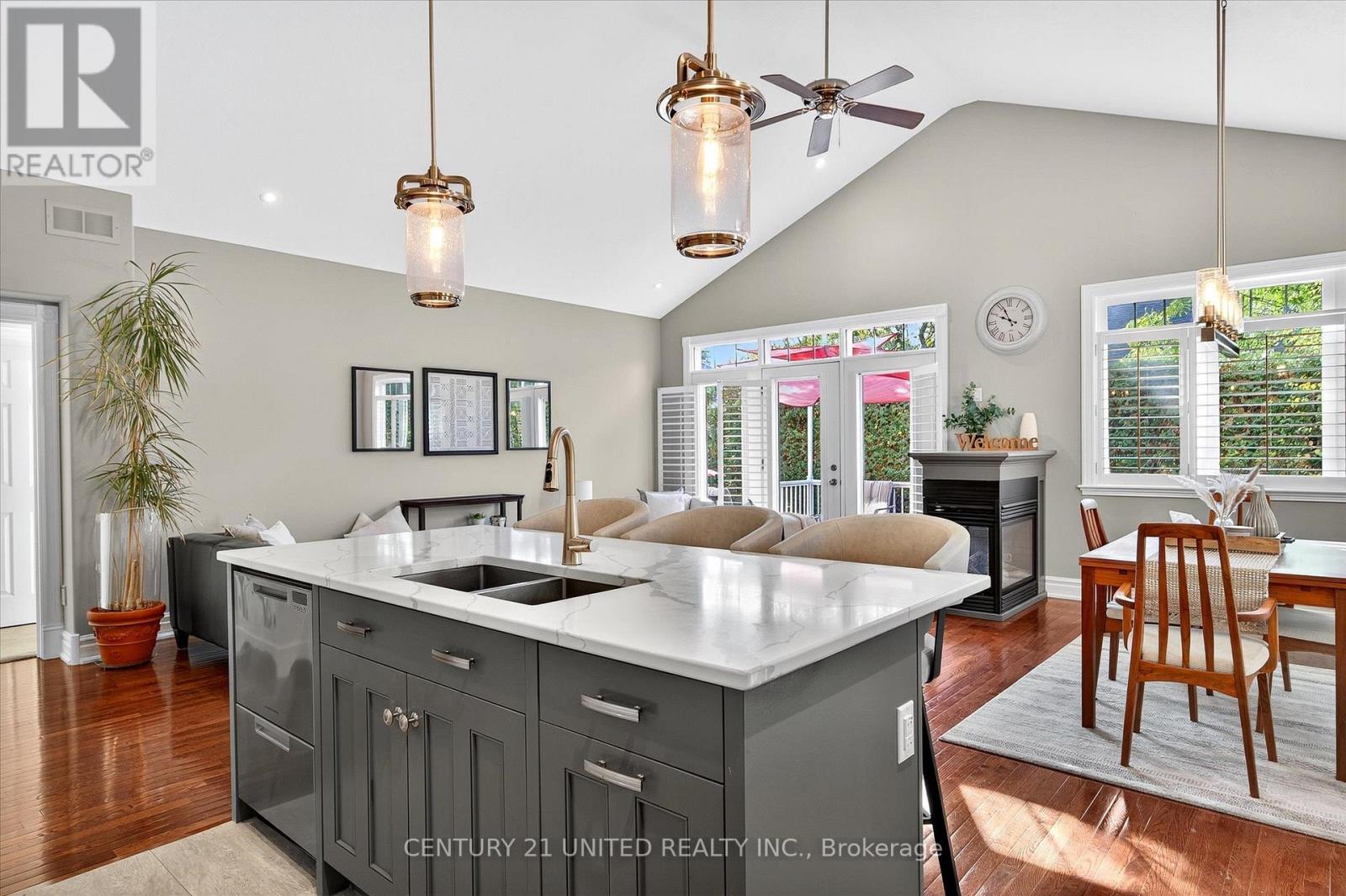 This beautifully appointed 2+2-bedroom, 3 bath raised bungalow exudes elegance. The main living area features hard surfaces throughout with a bright, open concept living space, with vaulted ceiling, that combines the living room, dining room and kitchen with natural separations provided by the three-sided gas fireplace and serviced kitchen island with room for seating. Spacious kitchen with SS appliances including double oven and pantry nearby. The living room exits onto the back patio for convenient hosting or outdoor cooking in a very private backyard. The laundry is located on the main floor, and all four bedrooms are generously sized with a primary that features a 4-piece ensuite and walk in closet. The lower level has ample storage room, a third 4-piece bathroom, a second gas fireplace in the rec room and nine-foot ceilings providing lots of air space. Extra bonus is an installed Generlink with generator/cable. Pre-inspected for your convenience. Don't miss your chance to make this gem your own! (id:64974)