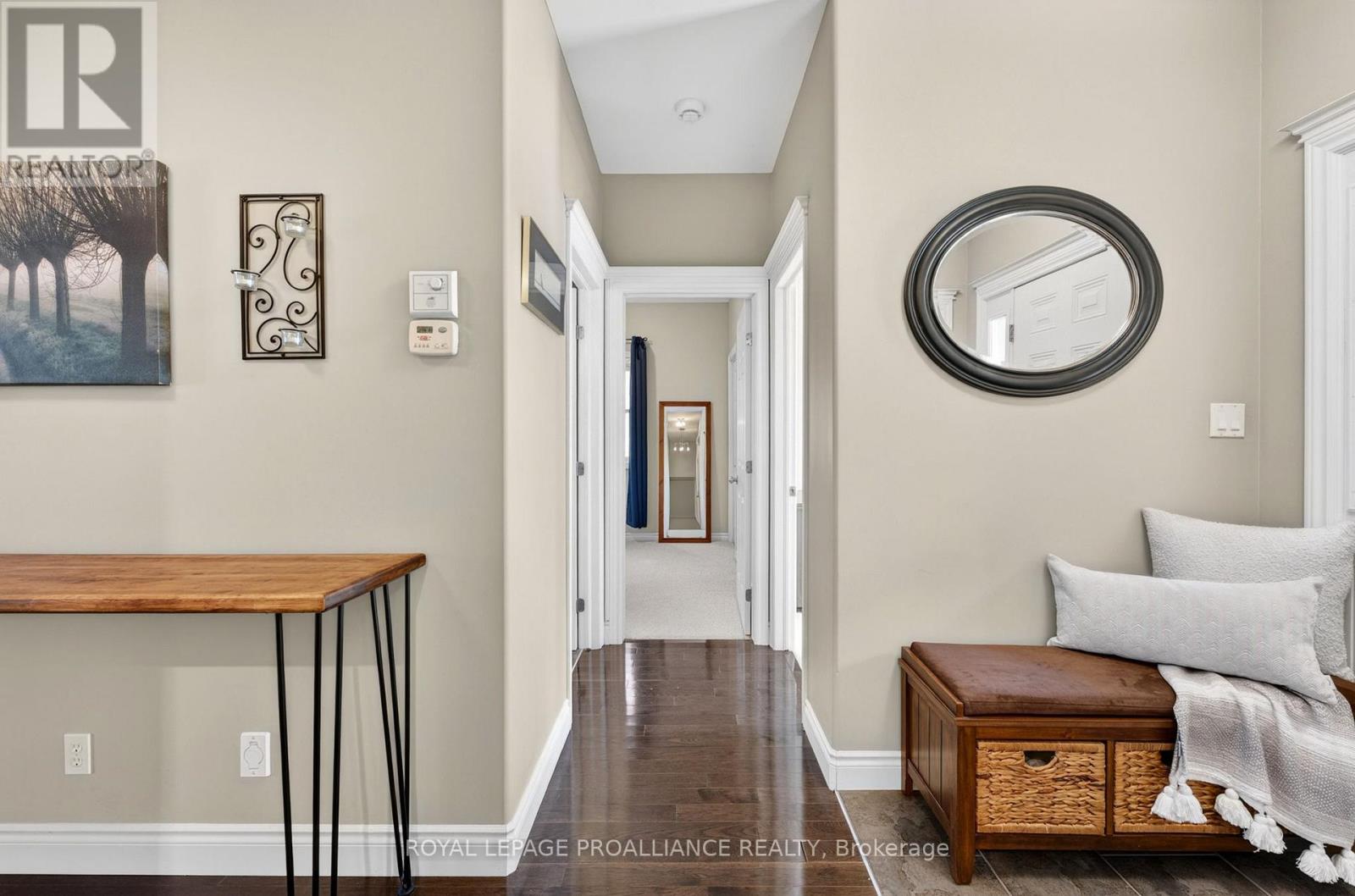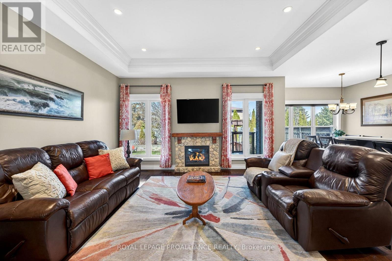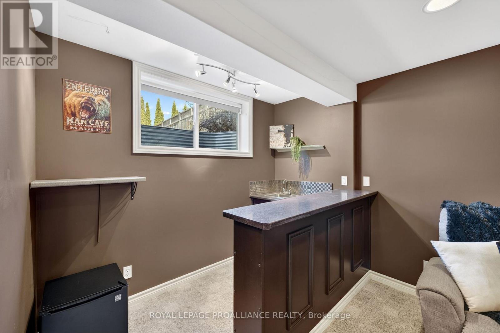 Welcome to this meticulously maintained all-brick bungalow nestled in one of Belleville's most desirable, established neighbourhoods. This home radiates pride of ownership, blending sophisticated design with functional family living. Step through the front door into a large, inviting foyer featuring durable ceramic tile. The expansive living room serves as a true centrepiece, boasting a stylish tray ceiling and gleaming hardwood floors. The modern kitchen is a chef's dream, featuring a gas stove, breakfast bar island, and ceiling-height cabinetry for maximum storage. The dining area offers a seamless walk-out to a private, tiered backyard deck equipped with a gas BBQ hookup for effortless summer entertaining. The primary suite is a true sanctuary, also featuring a tray ceiling. It is complemented by a 4pc ensuite bathroom with double sinks, and a large glass shower with a luxurious rain shower head. Two additional well-appointed bedrooms are located on the main level - one featuring a dramatic vaulted ceiling - along with a second 4pc bathroom. The main floor is completed by a laundry area and inside entry to an insulated double garage with a 220v outlet. The lower level offers a massive L-shaped family room anchored by a cozy electric fireplace and plush broadloom. This level also includes a generous fourth bedroom and a dedicated theatre room, complete with in-wall speakers, professional wiring, and a wet bar for the ultimate movie night! A third 4pc bath, large utility room, and a 2019 HVAC update offer total convenience and peace of mind. Outside, the property is equally impressive, featuring a two-tiered deck with a pergola and beautifully landscaped retaining walls showcasing mature perennial gardens. Located just north of the 401, you are minutes from the Quinte Mall, schools and major routes, with a beautiful park and walking trails right across the road. This home is truly move-in ready and waiting for its next chapter. (id:64974)