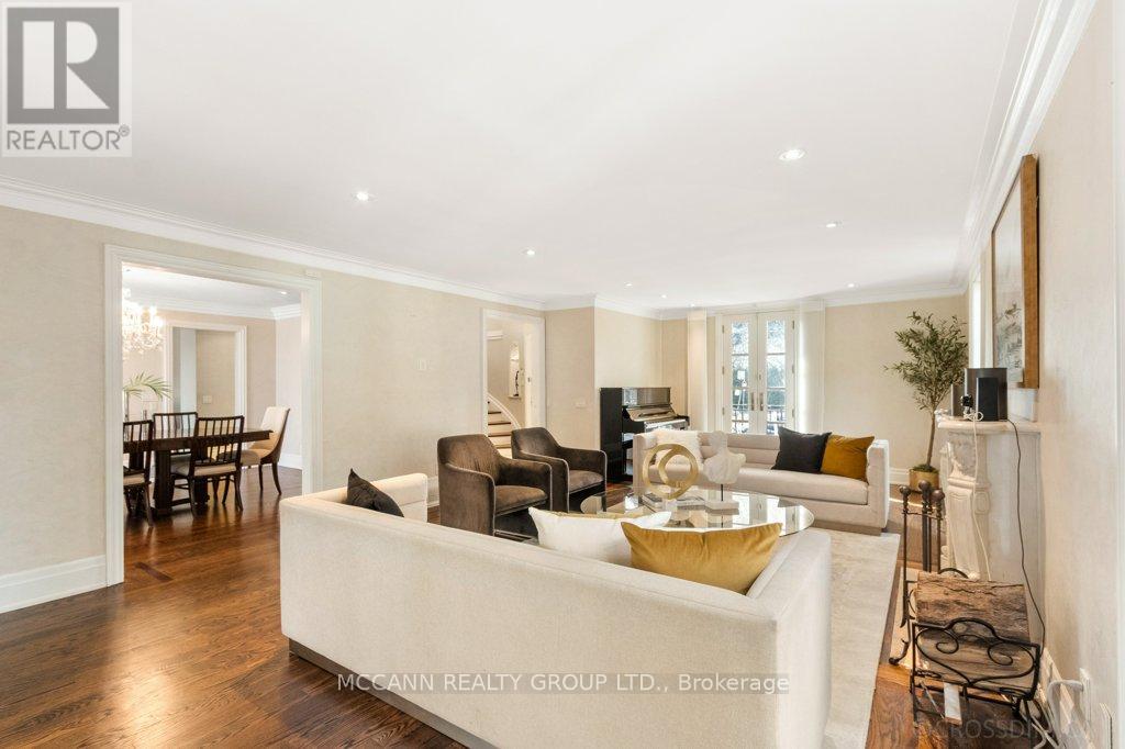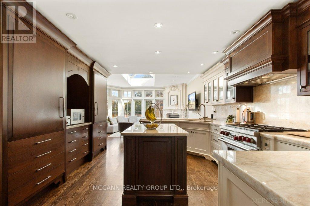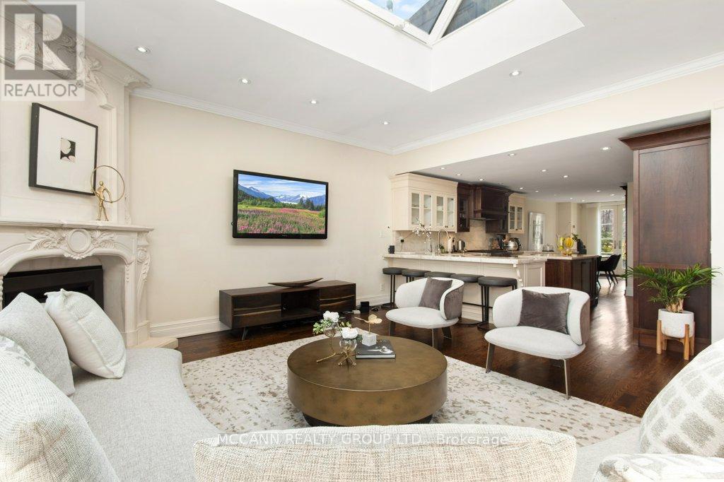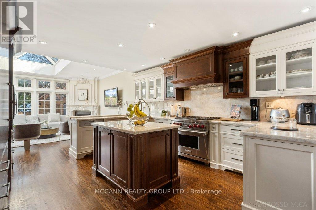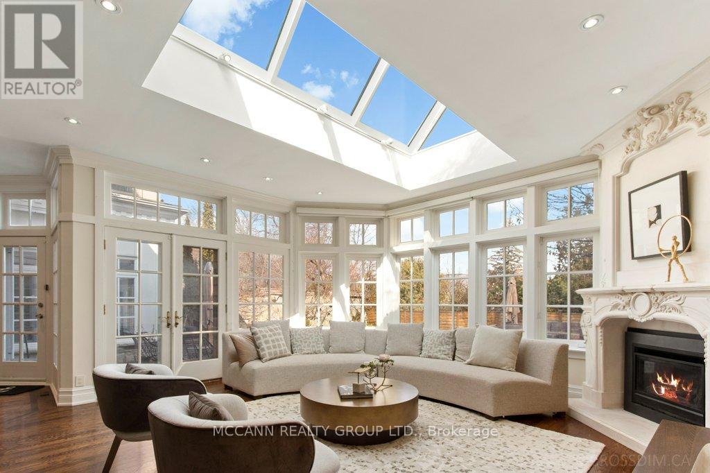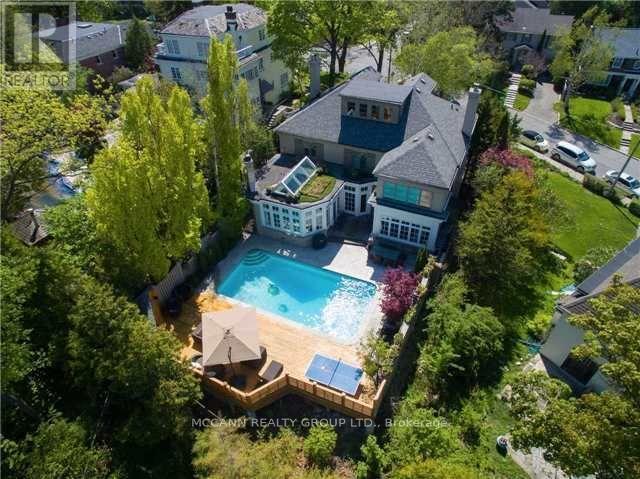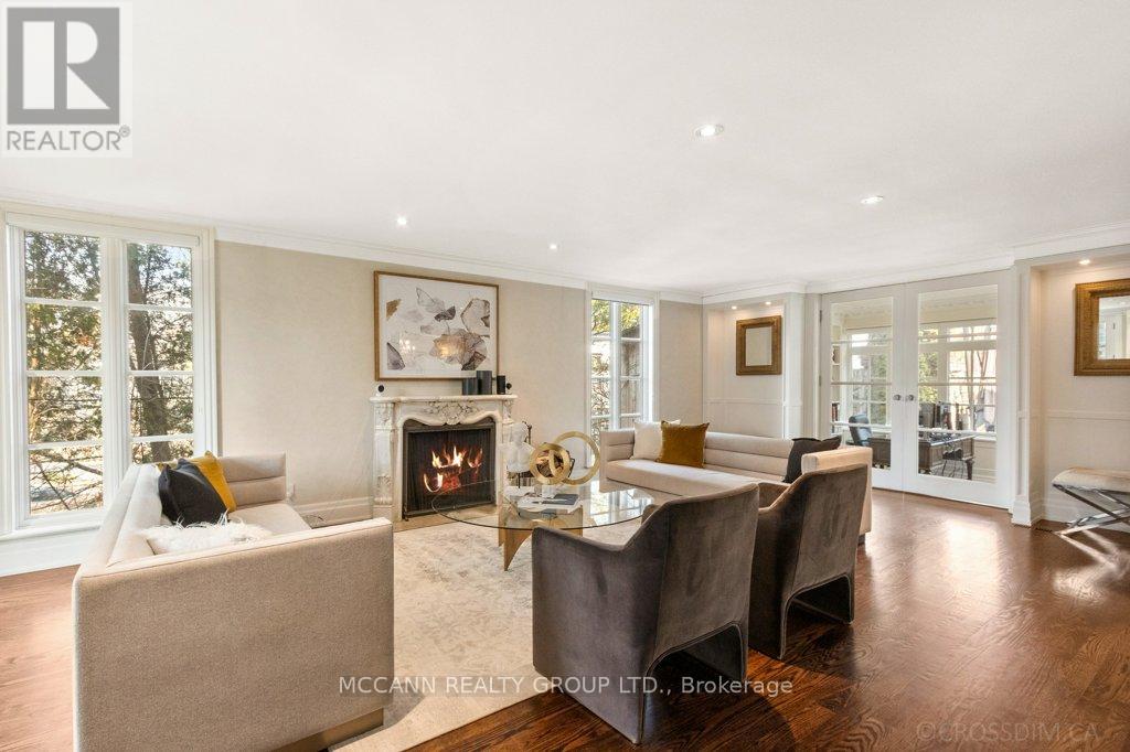 Nestled on one of Lawrence Park's most desirable streets, this beautifully appointed three-storey home offers exceptional space, comfort, and timeless style for modern family living. Featuring 4+1 bedrooms, generous principal rooms, and elegant finishes throughout, the thoughtfully designed layout provides both functionality and sophistication. The main level showcases a bright, open-concept family room anchored by a stunning chef's kitchen complete with striking onyx countertops and premium appliances, including a Wolf six-burner gas range. Abundant cabinetry, ample counter space, and both breakfast bar and eat-in dining options make this kitchen ideal for everyday living and entertaining alike. Separate living and dining rooms provide refined spaces for hosting, highlighted by a charming wood-burning fireplace in the living room. Two additional gas fireplaces, located in the family room and the primary bedroom, add warmth and character. The upper levels offer spacious, well-proportioned bedrooms designed to accommodate a growing family. The finished lower level features a large recreation room and a versatile nanny or guest suite, currently configured as a media room with built-in speakers. Step outside to a private backyard retreat featuring a pool perfect for summer entertaining, outdoor dining, and relaxation. Additional highlights include a private drive and built-in garage. Ideally located just minutes from top-rated schools, including Blythwood Junior Public School, beautiful green spaces such as Sherwood Park, and the shops and restaurants along Yonge Street, this home offers an exceptional opportunity to live in one of Toronto's most sought-after neighbourhoods. (id:64974)