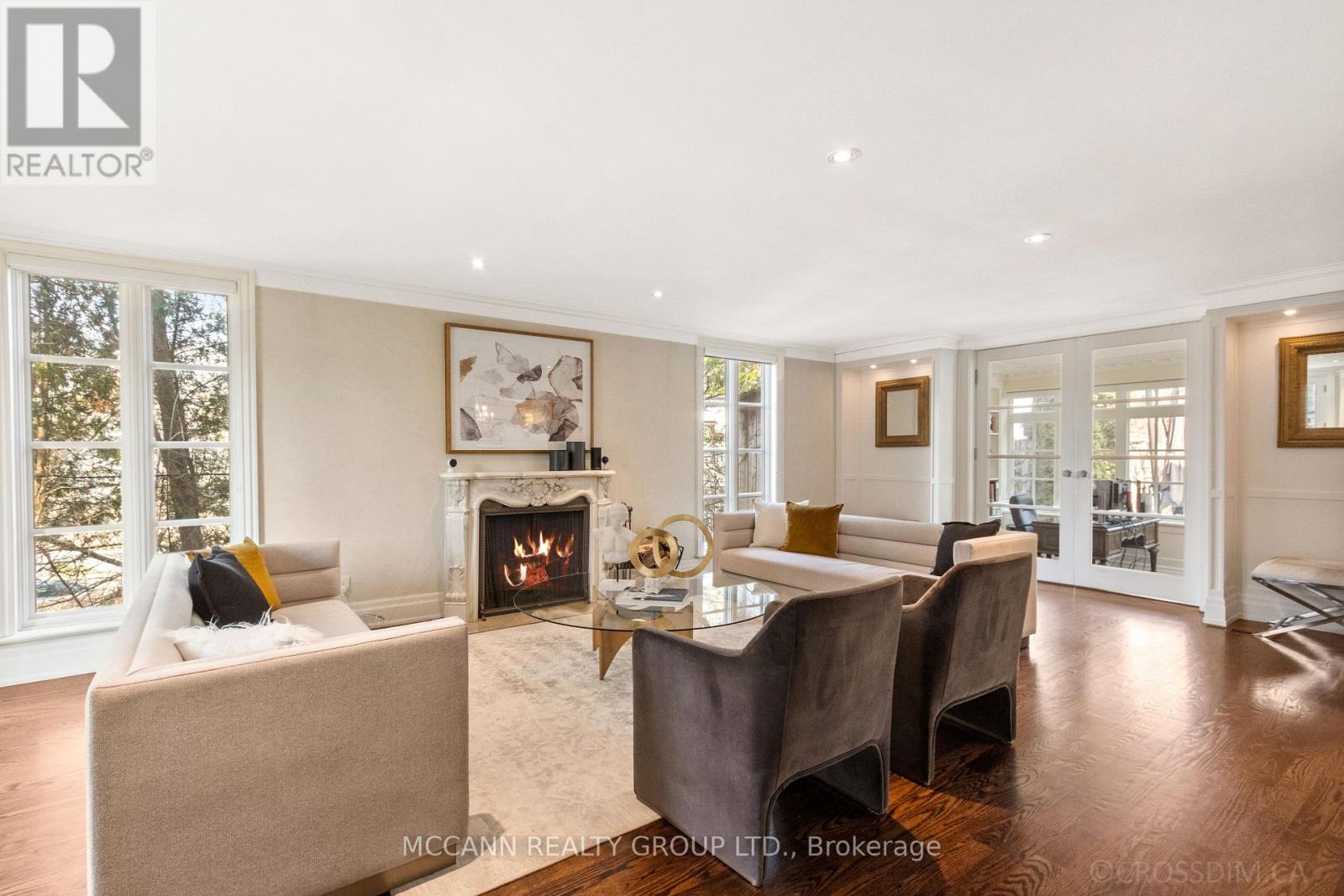 Nestled on one of Lawrence Park's most desirable streets, this beautifully appointed three-storey home offers exceptional space, comfort, and timeless style for modern family living. Featuring 4+1 bedrooms, generous principal rooms, and elegant finishes throughout, the thoughtfully designed layout provides both functionality and sophistication. The main level showcases a bright, open-concept family room anchored by a stunning chef's kitchen complete with striking onyx countertops and premium appliances, including a Wolf six-burner gas range. Abundant cabinetry, ample counter space, and both breakfast bar and eat-in dining options make this kitchen ideal for everyday living and entertaining alike. Separate living and dining rooms provide refined spaces for hosting, highlighted by a charming wood-burning fireplace in the living room. Two additional gas fireplaces, located in the family room and the primary bedroom, add warmth and character. The upper levels offer spacious, well-proportioned bedrooms designed to accommodate a growing family. The finished lower level features a large recreation room and a versatile nanny or guest suite, currently configured as a media room with built-in speakers. Step outside to a private backyard retreat featuring a pool perfect for summer entertaining, outdoor dining, and relaxation. Additional highlights include a private drive and built-in garage. Ideally located just minutes from top-rated schools, including Blythwood Junior Public School, beautiful green spaces such as Sherwood Park, and the shops and restaurants along Yonge Street, this home offers an exceptional opportunity to live in one of Toronto's most sought-after neighbourhoods. (id:64974)