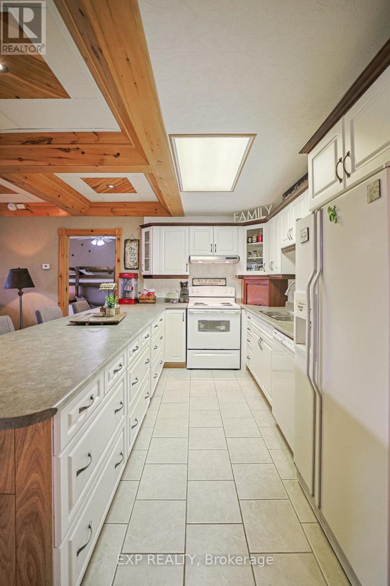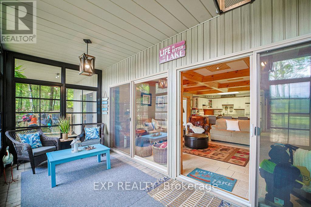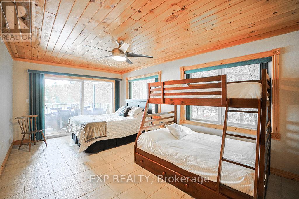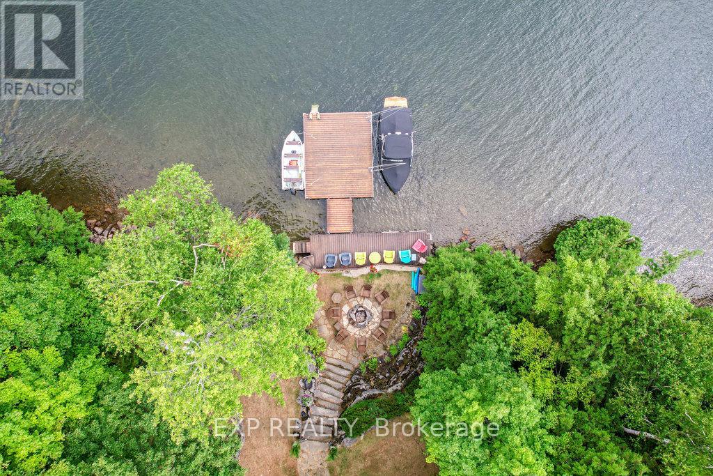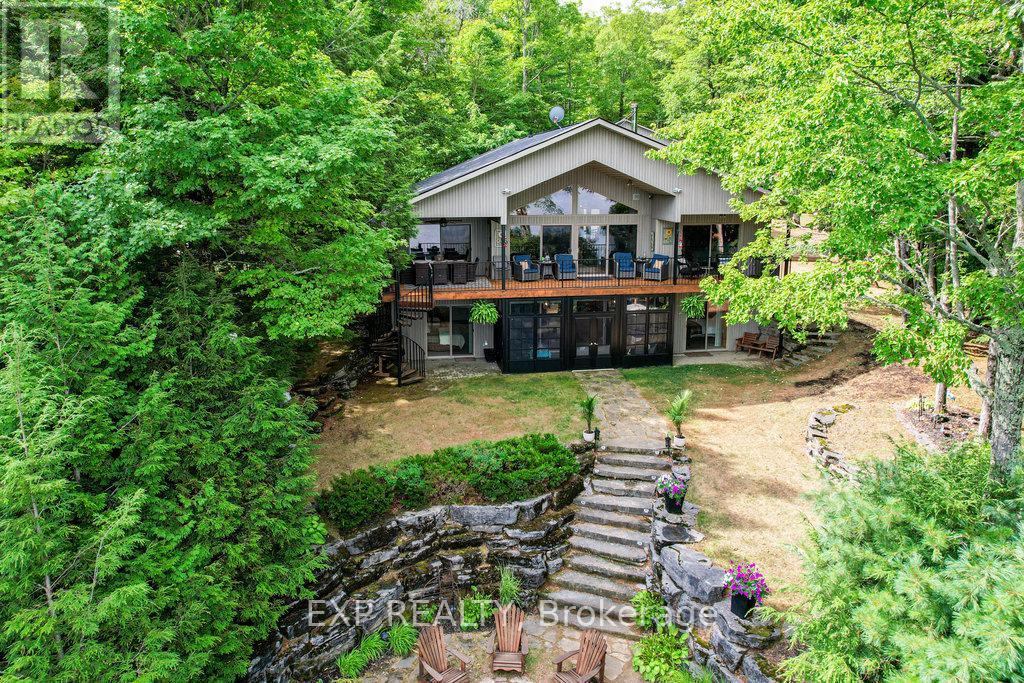 Chandos Lake, Custom-built, open-concept cottage features cathedral ceilings, a handcrafted stone fireplace, radiant floor heating on both levels, and a chef's kitchen with granite countertops and built-in appliances. Multiple walkouts lead to expansive decks and patios overlooking the lake, a sandy walk-in shoreline with deep swimming, dock lift system, and a beautiful stone fire pit area right by the water. This home provides a perfect balance of nature with contemporary living. Offering over 3,000 sq. ft. of finished living space, the cottage features four large, inviting bedrooms and three well-equipped bathrooms including a 4-piece ensuite, easily accommodating family and guests. The beautifully finished basement is complete with a private office and full kitchen with island. Rec Room walks out to a fully screened room and grants easy access to the expansive property and the lakefront. Garage 25'x40'x18' Steel Construction, Insulted with water & septic hook up. Chandos Lake is a deep clean lake with great fishing and boating opportunities and is conveniently connected to ATV and Snowmobile trails for year round enjoyment. This property is the perfect setting for creating lasting family memories, whether you're playing in or on the water, fishing off the dock, or simply relaxing in the comfort of your well-appointed cottage. (id:64974)
