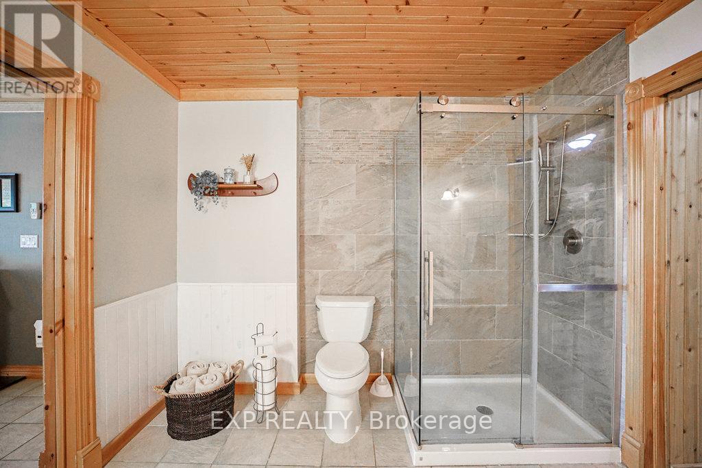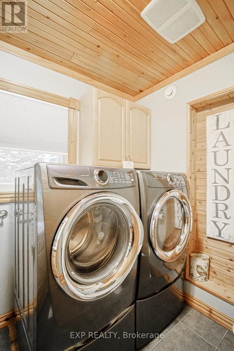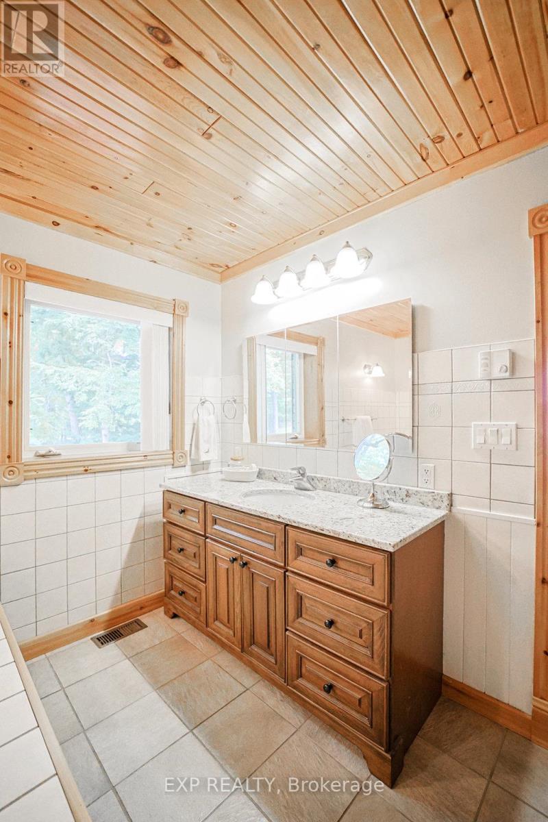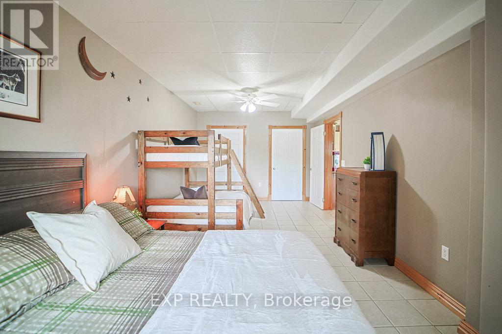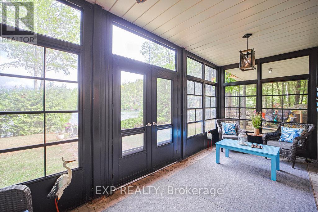 Chandos Lake, Custom-built, open-concept cottage features cathedral ceilings, a handcrafted stone fireplace, radiant floor heating on both levels, and a chef's kitchen with granite countertops and built-in appliances. Multiple walkouts lead to expansive decks and patios overlooking the lake, a sandy walk-in shoreline with deep swimming, dock lift system, and a beautiful stone fire pit area right by the water. This home provides a perfect balance of nature with contemporary living. Offering over 3,000 sq. ft. of finished living space, the cottage features four large, inviting bedrooms and three well-equipped bathrooms including a 4-piece ensuite, easily accommodating family and guests. The beautifully finished basement is complete with a private office and full kitchen with island. Rec Room walks out to a fully screened room and grants easy access to the expansive property and the lakefront. Garage 25'x40'x18' Steel Construction, Insulted with water & septic hook up. Chandos Lake is a deep clean lake with great fishing and boating opportunities and is conveniently connected to ATV and Snowmobile trails for year round enjoyment. This property is the perfect setting for creating lasting family memories, whether you're playing in or on the water, fishing off the dock, or simply relaxing in the comfort of your well-appointed cottage. (id:64974)
