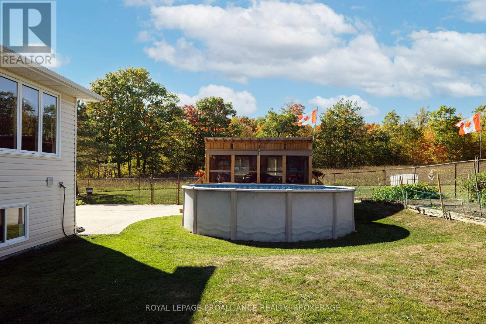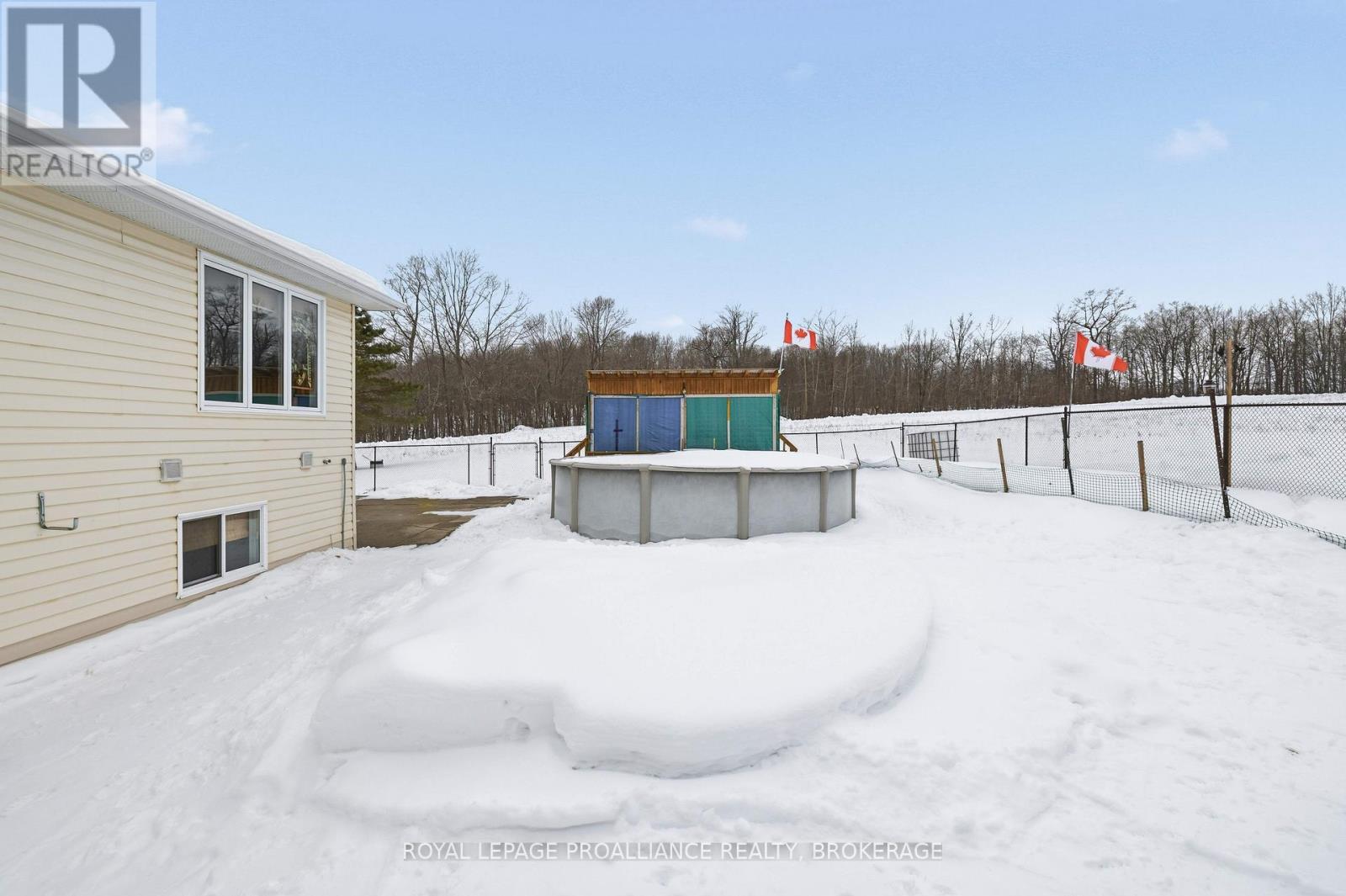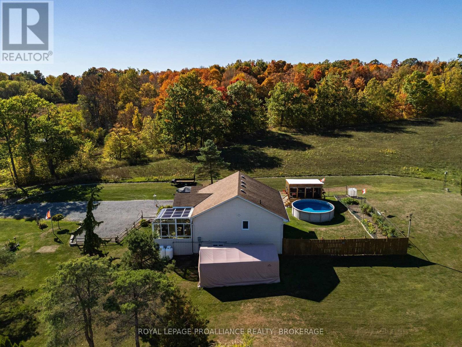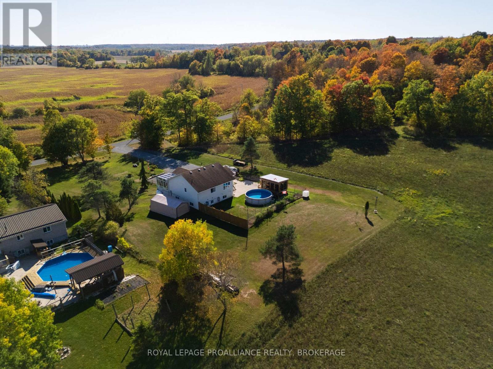 Beautifully updated and meticulously maintained raised bungalow, set on a private and manicured one-acre lot just five minutes north of the 401. Offering 2,000 square feet of finished living space, this wonderful family home features 2+2 bedrooms, 2 full bathrooms, formal dining room, a main floor family room, a bright solarium and a lower level rec/media room warmed by a cozy propane stove. Recent updates include refinished kitchen and bathroom cabinetry, new countertops, updated flooring, a new above-ground pool and a custom screened-in sun-room designed for extended summer enjoyment. Positioned high above the road, the property offers sweeping views of rolling farmland and a peek of the Rideau waterway. Immaculately maintained with every detail thoughtfully cared for, this home is truly move-in ready. (id:64974)