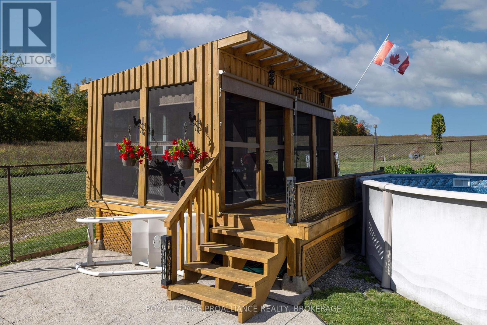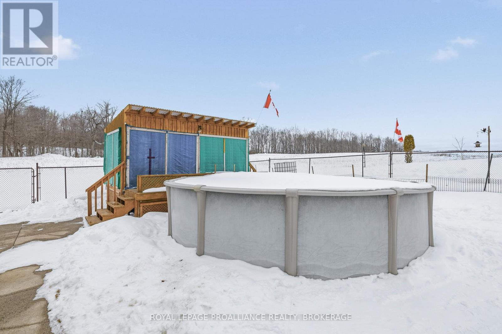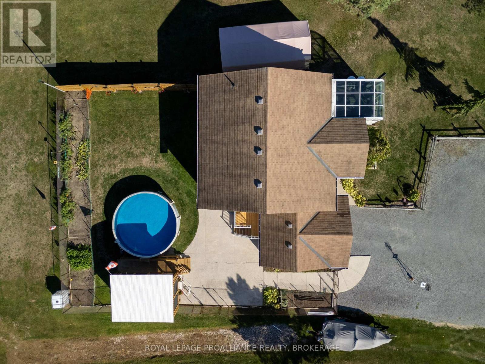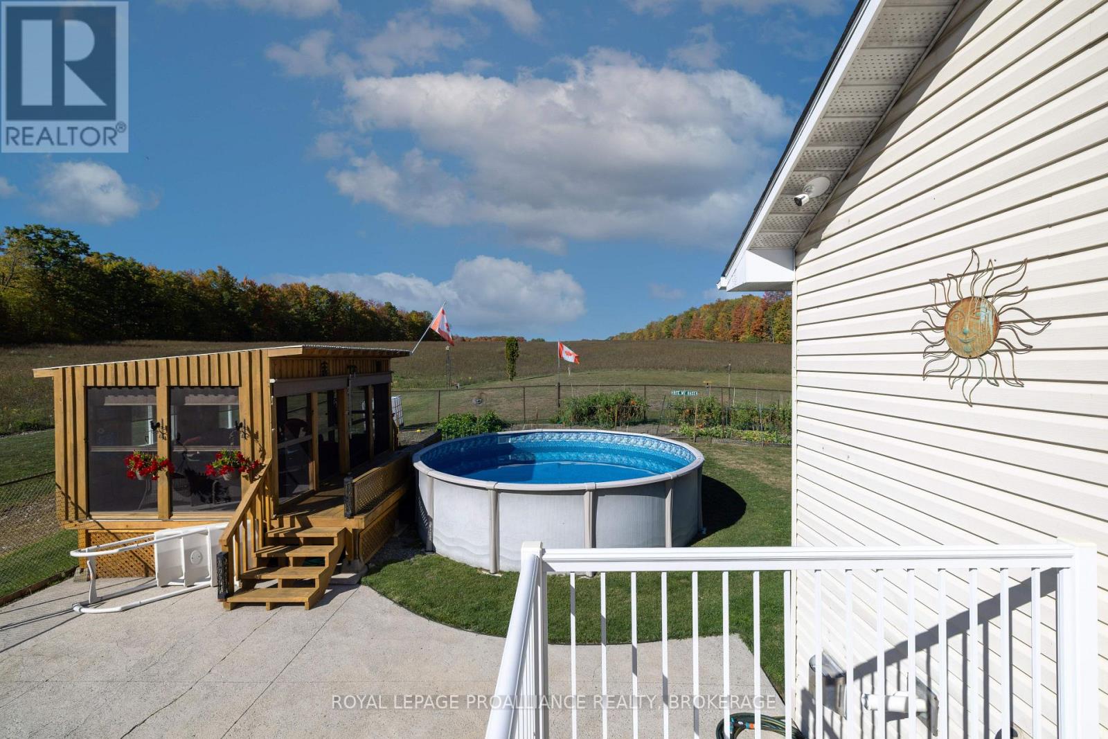 Beautifully updated and meticulously maintained raised bungalow, set on a private and manicured one-acre lot just five minutes north of the 401. Offering 2,000 square feet of finished living space, this wonderful family home features 2+2 bedrooms, 2 full bathrooms, formal dining room, a main floor family room, a bright solarium and a lower level rec/media room warmed by a cozy propane stove. Recent updates include refinished kitchen and bathroom cabinetry, new countertops, updated flooring, a new above-ground pool and a custom screened-in sun-room designed for extended summer enjoyment. Positioned high above the road, the property offers sweeping views of rolling farmland and a peek of the Rideau waterway. Immaculately maintained with every detail thoughtfully cared for, this home is truly move-in ready. (id:64974)