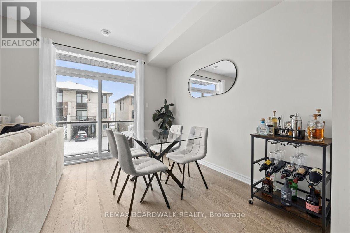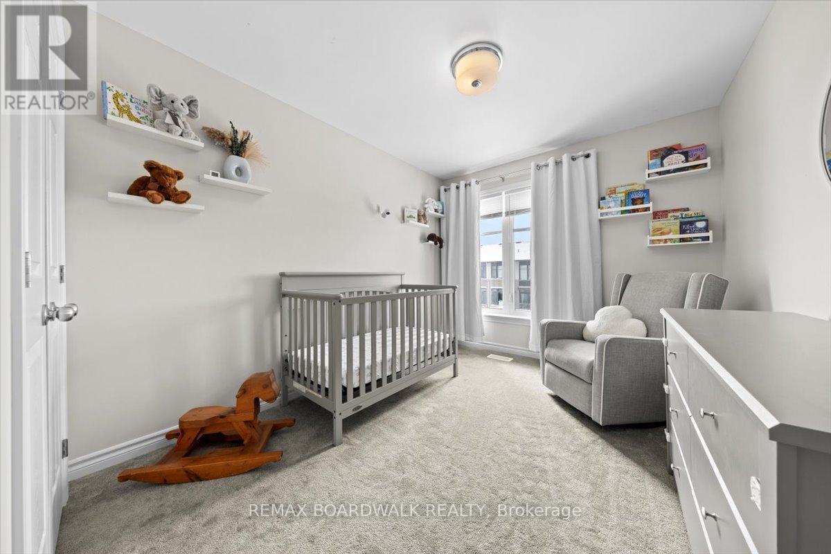 Welcome to a thoughtfully designed freehold Tamarack built 3-storey townhome on Pastel Way, where modern design meets functional, low maintenance living in one of Barrhaven's growing communities. The main level offers a spacious entry with a dedicated office nook, creating the ideal work from home setup, along with convenient interior access to the garage and the basement w/ additional storage space + utilities. The second level is bright and open, designed for both everyday living and effortless entertaining. Convenient powder room. The kitchen is anchored by a centre island with breakfast bar seating, finished with quartz countertops and walk-in pantry. The space seamlessly connects to the dining and living areas. Expansive windows fill the space with natural light, creating a warm and inviting atmosphere + the private east-facing balcony off the dining area to enjoy the sunshine and sip your coffee. On the third level, two generously sized bedrooms offer comfort and flexibility. The primary bedroom features large windows, a runway style walk in closet, and a private ensuite with a glass shower, creating a refined space to unwind. The second bedroom is well proportioned for guests, a nursery, or an additional workspace. A full bathroom with a spacious vanity, along with a dedicated laundry area and linen storage, completes this level.With its versatile layout, clean modern aesthetic, and separation of living spaces, this home is ideal for buyers seeking more space, more light, and more intention in how they live, all without the upkeep of a detached property.Located in a growing pocket of Barrhaven, this home offers convenient access to parks, schools, shopping, and everyday amenities. Enjoy nearby walking paths, green space, and quick connections to Strandherd Drive and Highway 416, making commuting and day to day living seamless. Perfectly positioned for those seeking a balanced, family friendly community with everything close at hand. (id:64974)