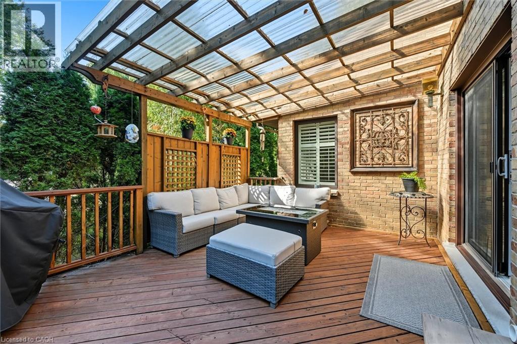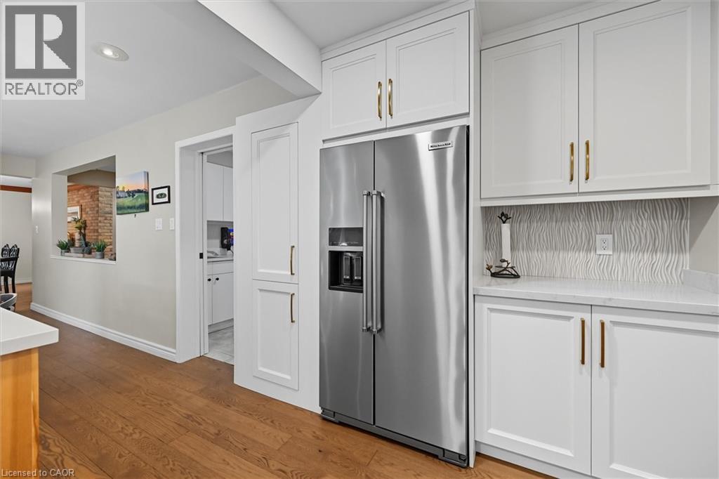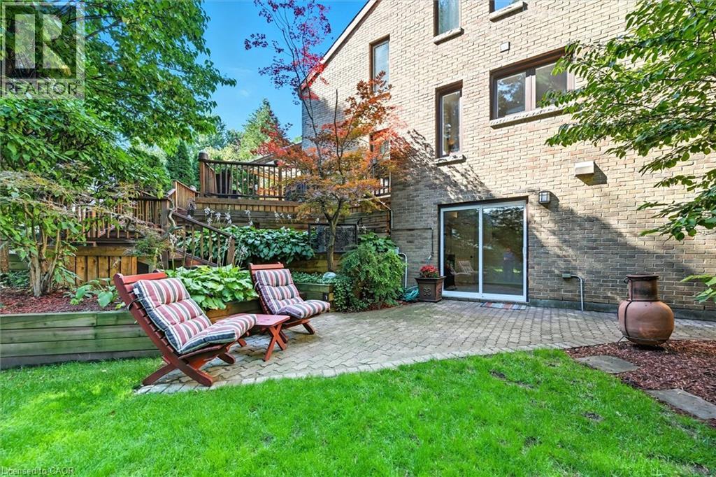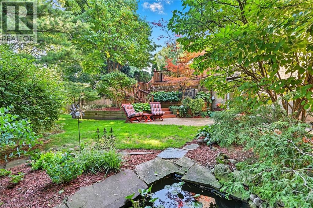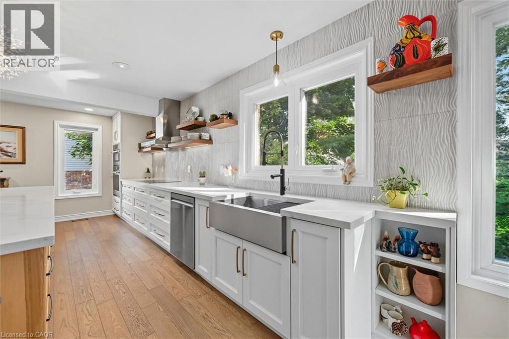 In Ancaster's sought-after Harmony Hall neighbourhood, this distinctive architectural design home of approximately 3500 square feet of finished living space, offers a blend of modern comfort and timeless character. Features a walk-out basement to a beautiful, private tree-farmed lot. With extensive renovations costing over $300,000 completed in 2022, this three (plus possibility for an extra bedroom on the lower-level) bedroom, 3 1/2 bath home features a flexible layout that adapts easily to today's lifestyle. The inviting entry opens into a dramatic living space with soaring vaulted ceilings, new linear gas fireplace with full-height brick surround, and expansive windows that frame the mature gardens. The enlarged kitchen features custom cabinetry, a stunning ten-foot island, coffee bar, quartz countertops and premium appliances. A glass door leads you to a large deck with a covered area for lounging, and a gas fireplace for further entertaining. Hardwood flooring runs throughout, while custom oak treads and glass railings provide bright and open sight lines to the home's upper level. The primary suite was reimagined with built-in cabinetry in the walk-in closet and a spa-inspired ensuite with heated floors, custom vanities, walk-in glass shower and large skylight. A new and modern guest bathroom with laundry area added. The second bedroom features two closets along with a large walk-in closet for endless storage. The walk-out lower level was redesigned for a possible in-law suite with the addition of a kitchen and bathroom. Rebuilt retaining walls, stunning mature landscaped gardens with stone walkways, attached double car garage, wide interlock driveway, and every major detail thoughtfully addressed, this property combines architectural distinction, privacy, and modern practicality, all within minutes of shops, dining, golf, parks and the highway. (id:64974)