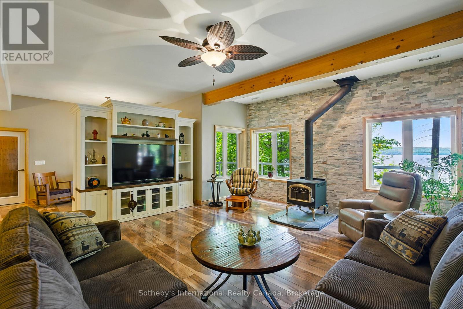 Built in 2008, this energy-efficient ICF block bungalow with walk-out basement offers year-round comfort. Situated at the end of a dead-end road provides privacy on this irregular 1-acre lot. Lake front property with the desirable southwest exposure of Lake Cecebe, a lake that offers 40 miles of boating joining Lake Cecebe with the Magnetawan River, Midlothian Lake and Ahmic Lake. Perfectly placed in between Burk's Falls and Magnetawan and just 30 minutes from Huntsville. The main floor of the home features hardwood/tile floors, a custom chef's kitchen by Cutter's Edge of Muskoka made of solid hickory including extra touches such as two sinks and Corian countertops. Open concept from kitchen, dining and living room provides the perfect space for entertaining your family and friends. The living room has vaulted ceilings and a grandeur granite stone gas fireplace. A deck off each side of the living room provides extra living space for outdoor dining and relaxation. Main floor primary bedroom has a walk-in closet, ensuite with double sinks, walk-in shower and heated tile floor. A pantry provides extra storage and a place for a freezer. The laundry room on the main floor shares a mud room coming in from the 2-car 30' x 30' garage with work bench. An added touch is the 2-piece washroom with a work sink in the garage. To complete this level is a second bedroom facing the lake. The lower level has 2 spacious bedrooms with closets, 3-piece washroom with heated tile floor. The family room has a Napolean wood burning stove, entertainment centre and a shuffleboard table. There is a wood room on this level for easy access to the wood or it can be easily converted to another bedroom. To continue with convenience, there is a kitchenette on this level equipped with a refrigerator, microwave, cupboards and sink for easy cleanup. Relax in an indoor hot tub that has a sliding door to the outdoors or convert to an office, bedroom or gym. Walk out to a deck which leads you to the lake. (id:64974)