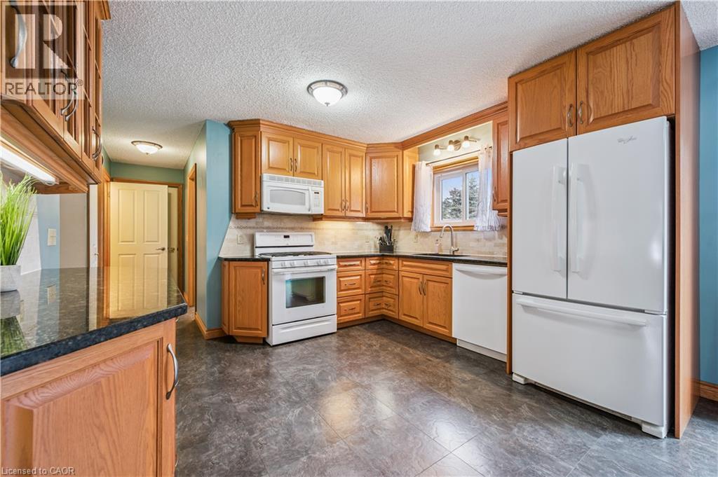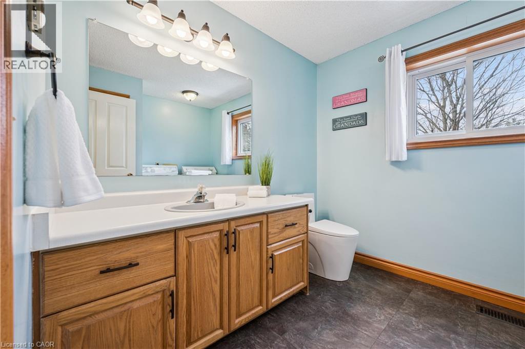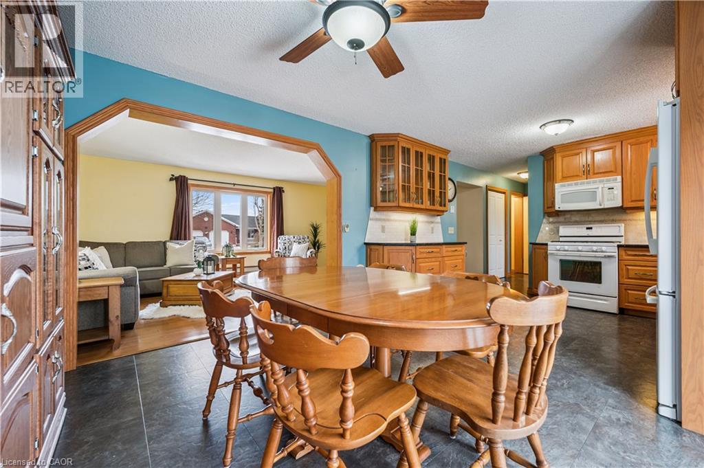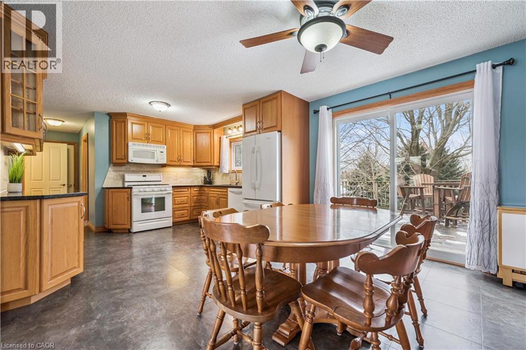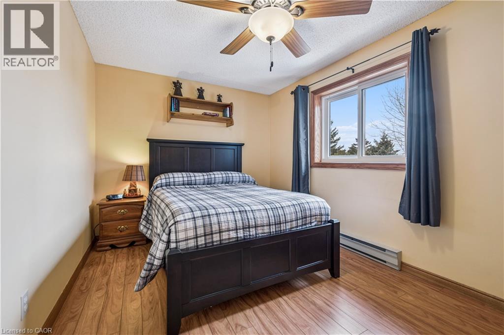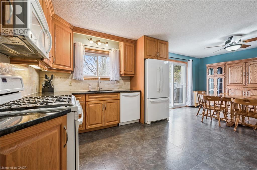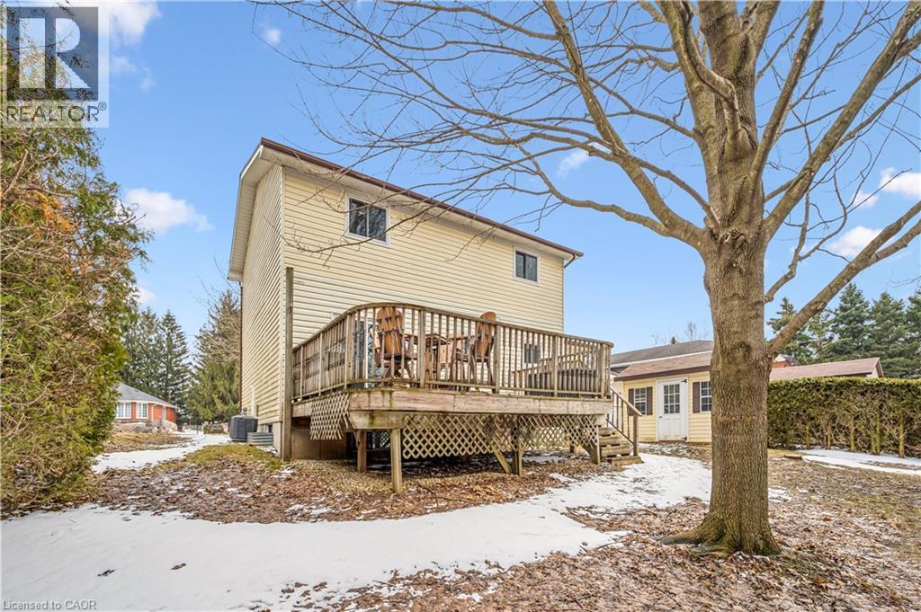 Welcome to small town living - where comfort, quality and space come together in a home that truly delivers. This quality built home offers an ideal floor plan for families looking to settle in and comfortably grow. Its' main floor features a tastefully updated and spacious eat-in kitchen, granite countertops, gas stove and sliding doors overlooking the mature and private 165' pie shape lot, delivering an exceptional outdoor experience with mature trees and landscaping that is increasingly hard to find. Large bright living room with updated maple hardwood floors, guest bathroom and laundry complete the main floor conveniences. The upper level offers 3 roomy bedrooms, king size primary bedroom with cheater ensuite and his & hers closets. The fully finished basement adds incredible versatility with a large rec room, ideal for entertaining. You'll also find an additional bedroom complete with walk-in closet, that adapts to your needs, whether it's for your growing family, guests, home office, hobby room or workout space. This home is not complete without the cold cellar and ample storage space - perfect for keeping your home organized without sacrificing living space. Many other updates to this home, include windows, doors, roof, furnace and A/C and more ... ready for you to move in and enjoy ! Steps to public school and downtown shops, restaurants, community/sports centre, parks and theatre. Located in a welcoming family friendly neighborhood, not far from the city, this home offers the lifestyle you've been dreaming of - quiet streets, community feel and fresh air to breath - while still keeping you connected to everything you need. It's all here - now it just needs you. Don't miss your opportunity! (id:64974)