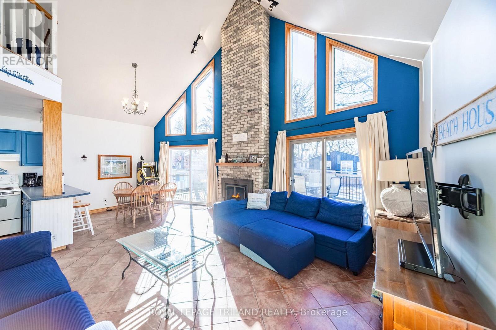 Fabulous Viceroy-style home or cottage featuring dramatic, towering prow windows and an airy two-story great room with natural fireplace. Located in the heart of the beach village of Grand Bend, just a short 3.5 minute walk (320 mtrs) to the town's famous sandy beach and legendary sunsets. Enjoy peace of mind with a bomb-proof metal roof and year-round comfort with forced-air gas furnace and central air. This property is offered fully furnished as a true turn-key package, including all appliances, furniture, BBQ, outdoor furniture, beach chairs, umbrellas, TVs, and central vacuum, the list goes on. Many updates have been in recent years including the kitchen, which was just re-faced in 2024, plus the expansion of parking on site & backyard hardscaping with new concrete surfaces at front and back of home. The spacious laundry room is so large it functions almost like a second kitchen - perfect for entertaining or extended stays. The home offers 4 generous bedrooms, including a main-floor primary suite, and two FULL bathrooms. Step outside to the impressive 30 ft x 10 ft front deck-ideal for morning coffee, summer dining, or relaxing after a day at the beach. Two skylights enhance the bright, open feel throughout. Additional highlights include a cement driveway with ample parking, attached extra-deep single garage with inside entry to the home, and unbeatable walkability to Main Street shopping, dining, and entertainment just 2 minutes away and of course, to the 3rd best beach in Canada just 3.5 minutes away. Park-and-play convenience with all amenities at your doorstep! An exceptional opportunity to create lifelong family memories, enjoy beach-town living, and own an excellent investment-priced right and ready to enjoy immediately. (id:64974)