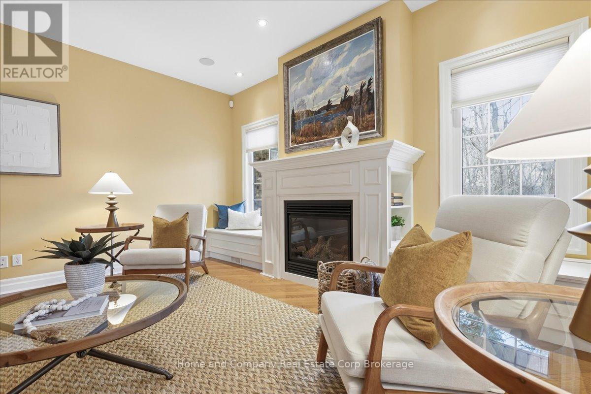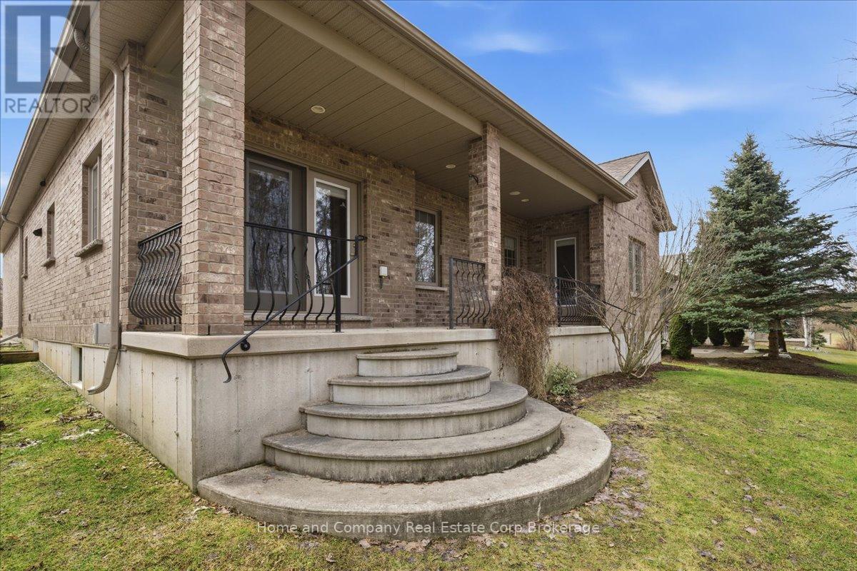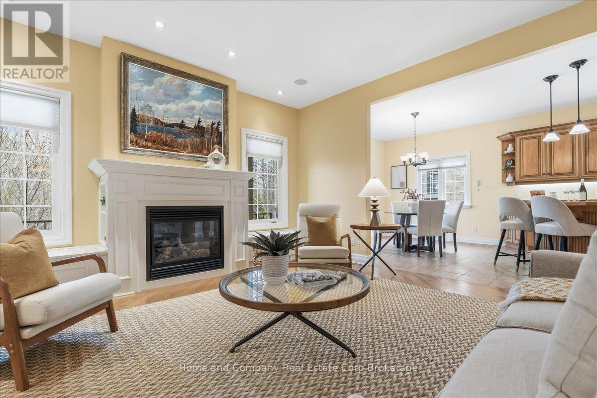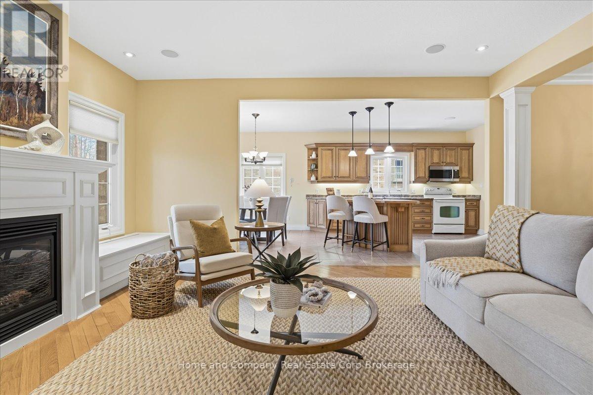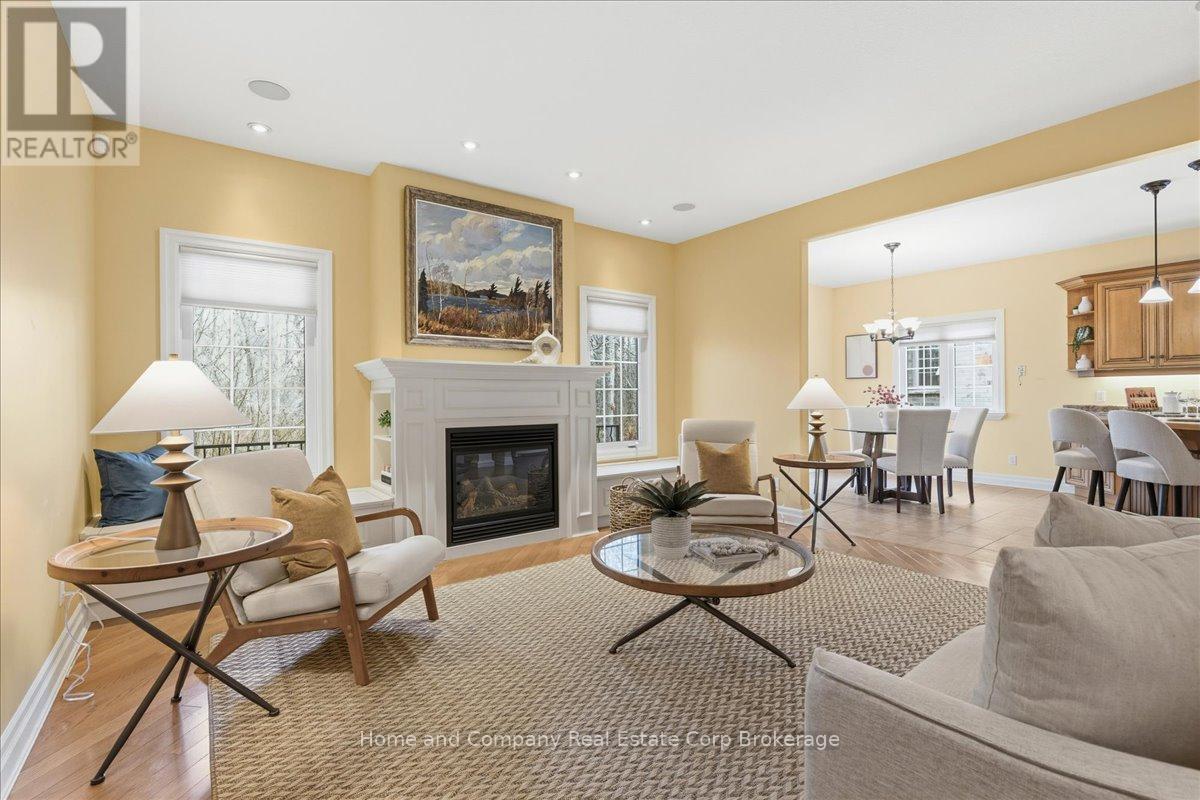 Welcome to 28 North Pointe Drive. This beautiful 2+1 bedroom, brick bungalow, with over 1,800 sq. ft. of main floor living space, is nestled in an exclusive enclave community, offering serene living with direct views of protected-mature green space. This home combines privacy, comfort, and an elevated lifestyle in one of the area's most sought after neighbourhoods. The heart of the home features open concept living, highlighted by a gas fireplace and built in speakers, creating an inviting space for everyday comfort and entertaining. A spacious dining area flows seamlessly from the eat in kitchen (with walk-out), providing plenty of room for gatherings. The primary bedroom offers a private retreat, complete with a 5 piece ensuite and a walk out to the covered rear porch, perfect for quiet mornings or evening relaxation. A second main floor bedroom and a 2 piece bath provide exceptional convenience for guests. The finished basement expands the living space with a large recreation room with gas fireplace, an additional bedroom, a 4 piece bathplus, and a versatile office/craft room. A convenient walk-up from the interior to the double-car garage adds practicality and ease of access. (id:64974)