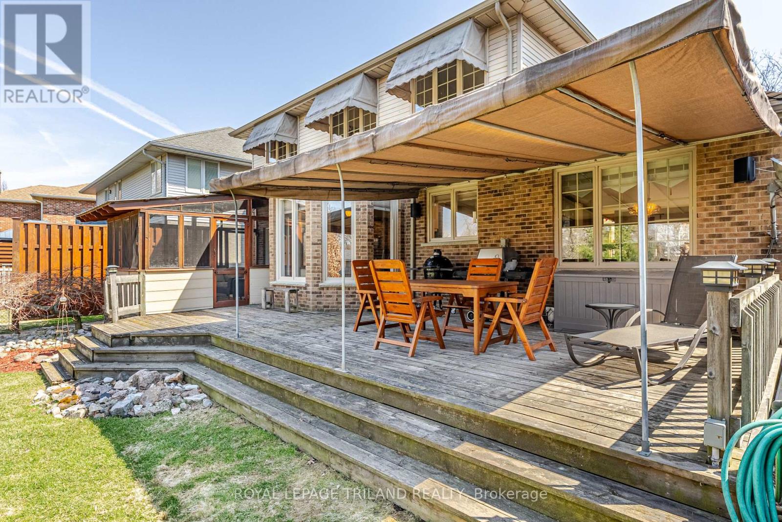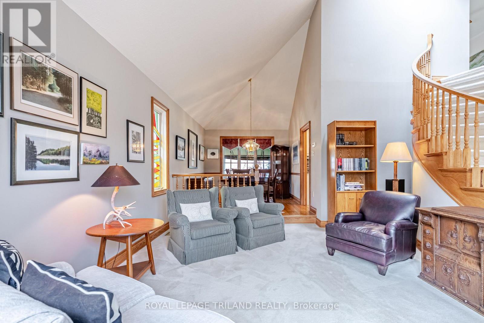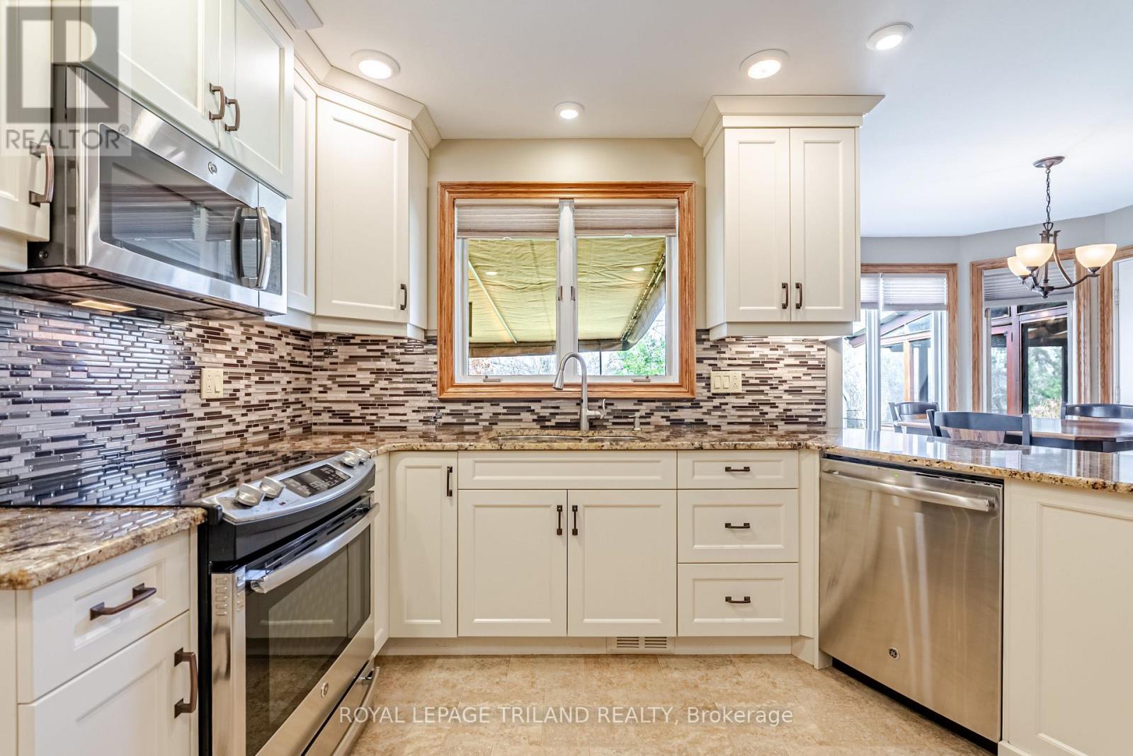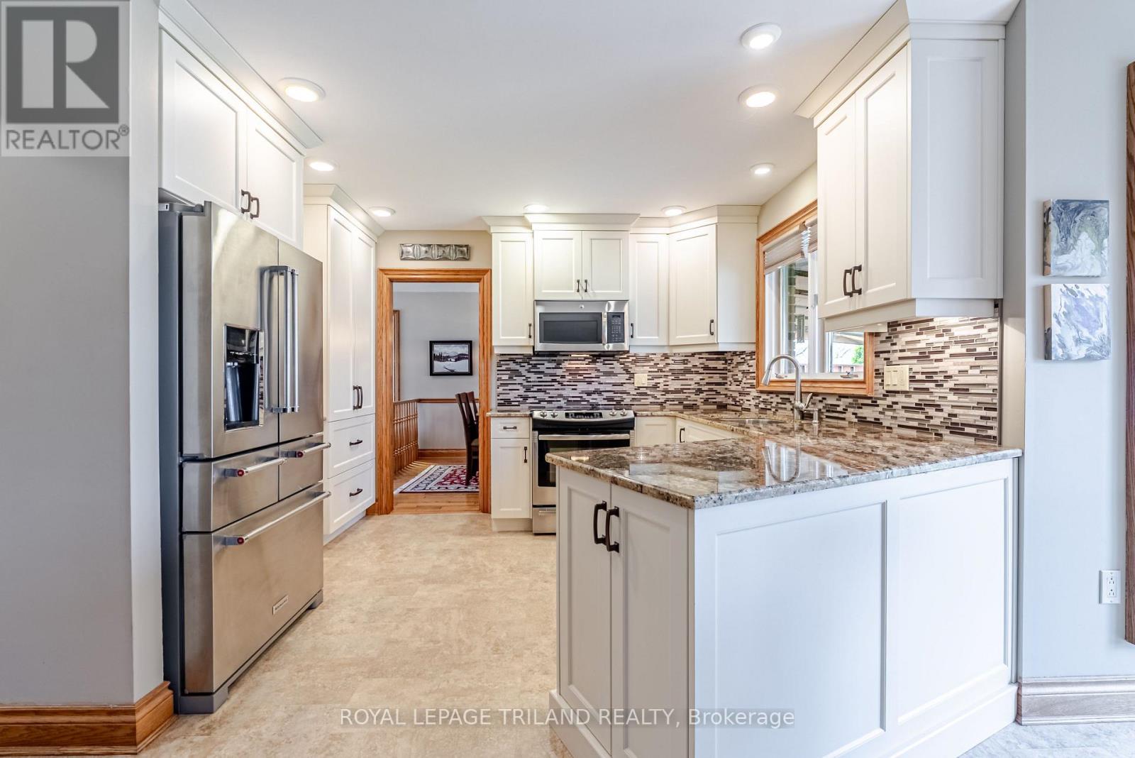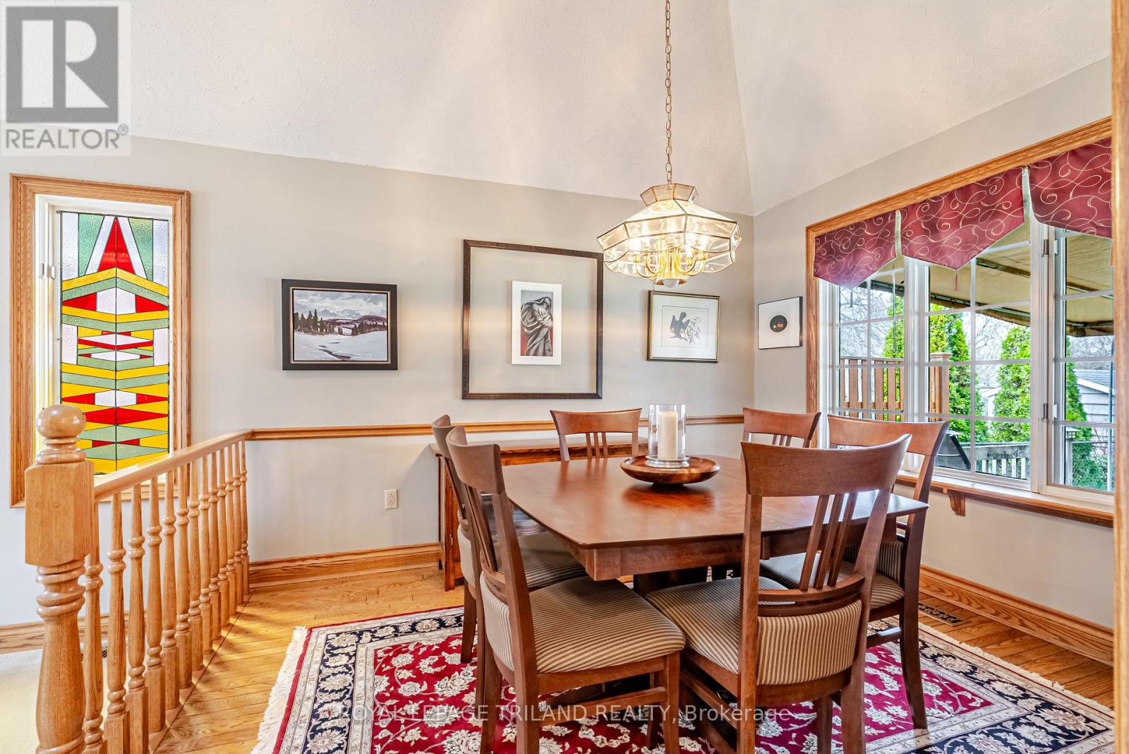 Welcome to this stunning family home set on a beautiful ravine lot in a sought-after neighbourhood! Perfectly located just a short walk to the East Elgin Community Complex and schools, this home offers the ideal blend of space, comfort, and convenience. Step inside and you're immediately welcomed by a bright foyer featuring impressive double oak staircases leading to both the upper and lower levels. The main floor offers a spacious living and dining area with vaulted ceilings and a large skylight, filling the space with natural light and creating a warm, inviting atmosphere. The updated kitchen is truly the heart of the home, complete with an eating area and direct access to your outdoor living space. Step out onto the large deck, featuring both a screened-in area and an open section with a canopy-perfect for enjoying morning coffee or hosting friends while taking in the peaceful views of mature trees and the ravine. Just off the kitchen, the cozy family room with a wood-burning fireplace and patio door access makes this space perfect for everyday living. Upstairs, you'll find a spacious primary suite with a dedicated closet area and a beautifully updated 5-piece ensuite. Two additional bedrooms and a bright loft area offer flexibility for family, guests, or a home office-all enhanced by large windows and natural light throughout. The lower level is the perfect place for additional space for the family with, an additional bathroom, and even a sauna-your own private retreat at home. Set in a family-friendly neighbourhood and surrounded by nature, this home offers incredible indoor and outdoor living space. This is the kind of home where memories are made-don't miss your chance to make it yours. (id:64974)