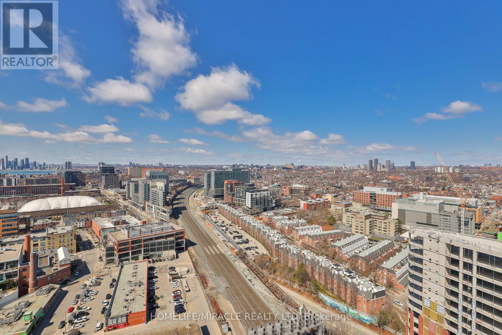 A rare offering in Liberty Village-this is the one buyers wait for.Units of this size rarely come to market-this is the first in over a year. Perched on the 28th floor with over 1,000 sq ft and not one, but two private balconies, this suite delivers panoramic city views from every angle and true indoor-outdoor living.Step inside to a freshly painted, sun-filled true 2-bedroom + oversized den, 2-bath layout designed for both comfort and functionality. This is not a token den-it's a fully usable, large separate space, perfect for a home office, guest area, or even a third bedroom setup.The open-concept living and dining space flows seamlessly to one of the balconies, creating an elevated lifestyle rarely found in condo living. The modern kitchen features stainless steel appliances, stone countertops, and ample cabinetry-ideal for both everyday living and entertaining.The primary bedroom is a true retreat, complete with its own private balcony, large closet, and ensuite bath. A well-sized second bedroom and second full bathroom round out a layout that truly stands apart from typical Liberty Village units.1 parking and 1 locker included-adding real convenience and value.Located in the heart of Liberty Village, you're steps to top restaurants, cafes, fitness studios, parks, and transit, with access to premium building amenities including a gym, indoor pool, concierge, and more.If you've been waiting for a large, functional condo with real outdoor space and a usable den in Liberty Village-this is it (id:64974)