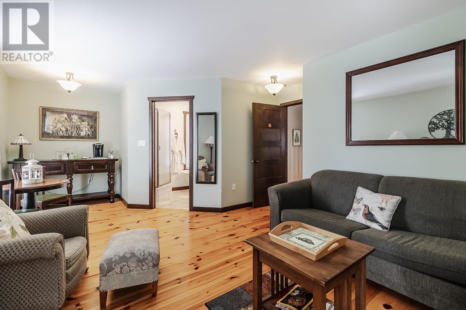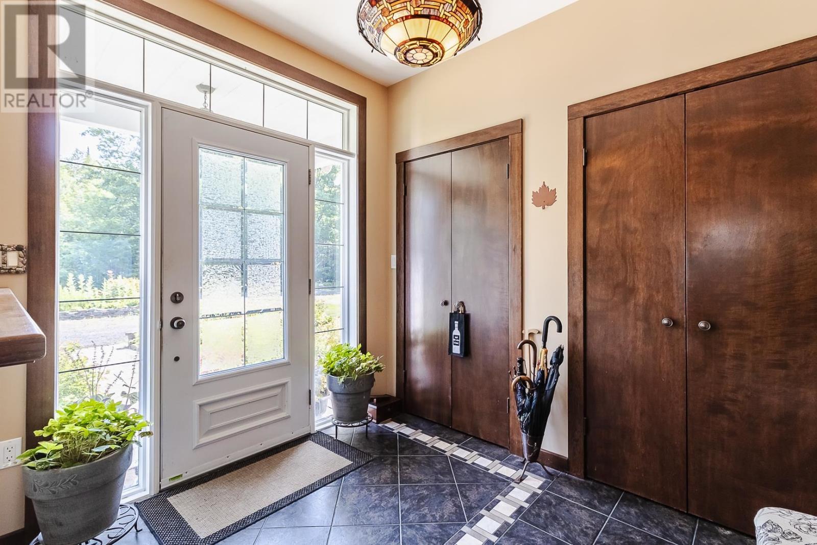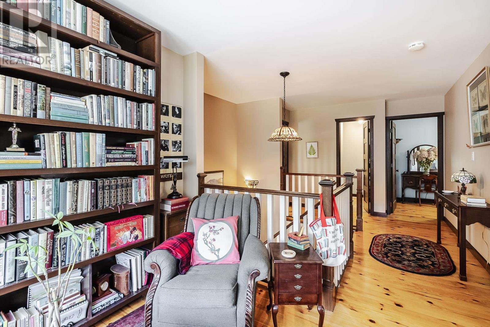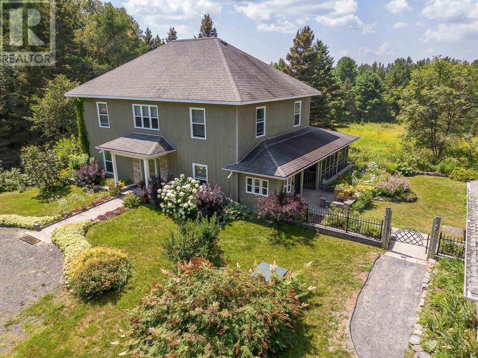 WELCOME TO STONEFIELD. Built in 2008 and inspired by the craftsmanship of an 18th century Irish farmhouse, this distinctive country estate sits on 74 private acres! Formerly operated as a bed & breakfast, the home features custom trim, doors, and carefully selected flooring and lighting. Detached garage designed to complement traditional Irish architecture. The main floor offers a reception, chef’s kitchen with propane stovetop and walk-in pantry, formal dining and living room, screened porch with sweeping views, and primary suite with walk in closet, three piece bath with walk in shower, and laundry. Upstairs includes a library with window seat, 3 bedrooms; 2 with ensuites, plus a spacious private suite with seating area, vintage style fireplace, and clawfoot tub. The lower level features an AUTHENTIC IRISH PUB! with wood bar, snug, fireplace, stage with stand up piano, and walkout to two patio areas surrounded by mature trees. Outdoor amenities include trails across the property, gardens, apple trees, fire pit, and bunkie. Additional features include forced air propane heat (2022), central air, CanExcel siding, and detached garage. Ideal as a private residence, boutique B&B, or event venue. (id:64974)