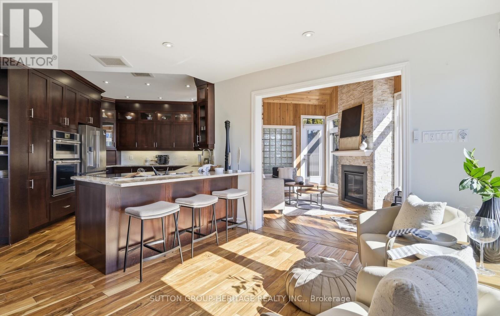Renovated, improved and lovingly cared for, this property is truly unique. Located on a deep, south facing, lot w/80' of water frontage. Easy enjoyment of fishing/boating/snowmobiling/ice hockey. The custom compass star marks the heated portion on the driveway. Walk the landscaped entrance to the double front door of timeless design. The living room has wall-to-wall windows overlooking the lake and pool. The walkout to the balcony provides a sheltered spot for your morning coffee. The kitchen is spacious and renovated with high-end appliances & granite counters. Hardwood flrs throughout the main level. The primary bdrm has a 5pc ensuite with large steam shower. Walkout from the main fl family room to the covered BBQ entertainment area which also provides access to the 20x44 loft over the detached garage. The loft is perfect for work space or party room with built-in sound. The comfortable & family friendly walkout bsmt boasts a brick wood-burning fireplace with w/o to inground pool and patio. 5 fireplaces add warmth to this spacious home no matter what the weather. Landscaped lot gently slopes down to the waterfront. Mature trees and cedars make it private. Two heated garages with 4 access doors & room for 5 cars will intrigue any car enthusiast. Truly worth a look as this home shows pride of ownership on all levels. Situated on a quiet dead-end street. Be in before summer to enjoy all this home has to offer! See attached list of improvements. (id:64974)