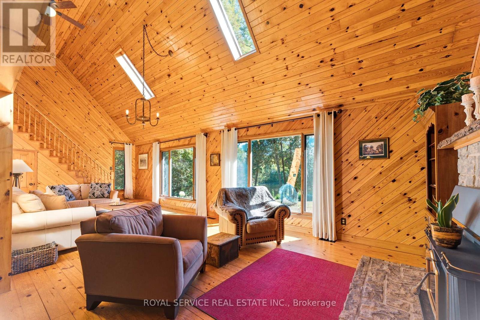 Between Campbellford and Marmora sits a riverside estate. A quiet, peaceful, serene place with a building made of stone, built with care--a much loved home. The main floor is open and bright with a high vaulted ceiling, large windows with views of the river, a wood stove for warmth on crisp autumn days. Open to the living room is a warm cherry wood kitchen with granite counters and stainless steel appliance. It flows to the dining room with a walk out to your saltwater pool and out to the backyard, your retreat. On this floor is also a tiled shower, a study/laundry/room. Upstairs, the master has its own balcony with breath-taking views. Two more bedrooms wait down the hall. The bath is large, with a jetted tub and a shower. The large basement family/bar/games room has a walk up for easy access, a wet-bar, a former fireplace (that could be brought back) and another utility room with tonnes of storage. Outside the land has so much to offer. A heated salt-water pool. A hot tub. A large heated -insulated garage that is perfect for tinkering, building fixing-or storing your toys. There's a greenhouse. A basketball court. A bunkie with root cellar. There are treehouses, a small fenced paddock. The river runs here. Over a hundred feet of riverfront. You can swim, boat and fish. The estate is built for life. Many ways to heat it. A generator backup if the power fails and supplemental wood heat. A built-in water sprinkler for the grass, a gorgeous stone and rock waterfall. Gardens a plenty. This is more than a home. This is a stead. A dream stead. (id:64974)