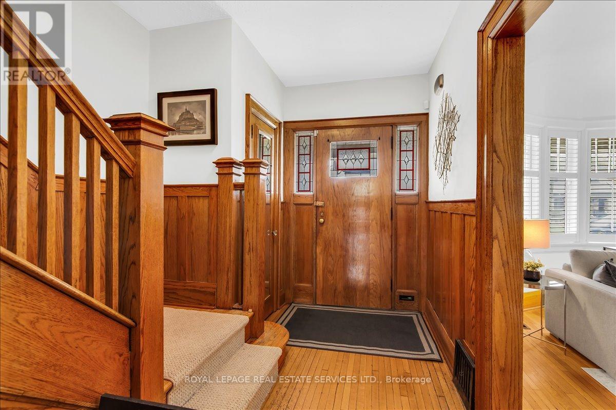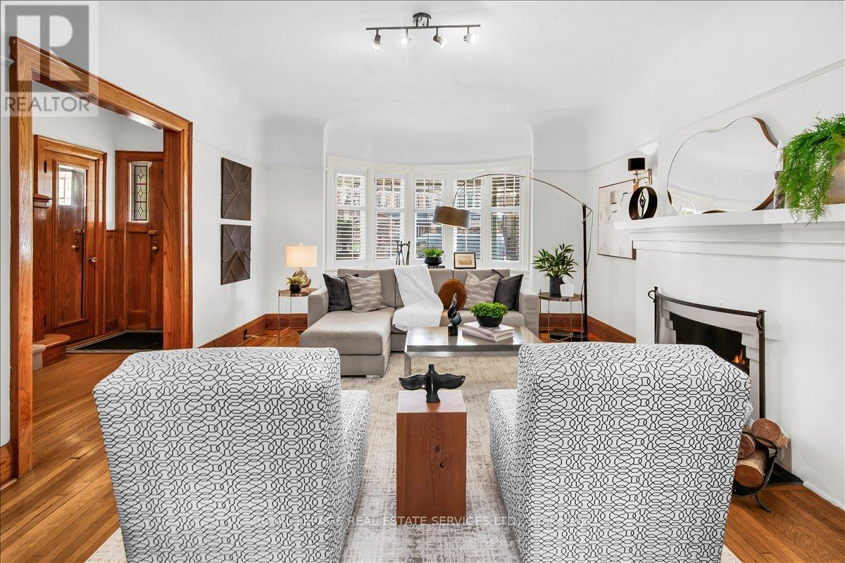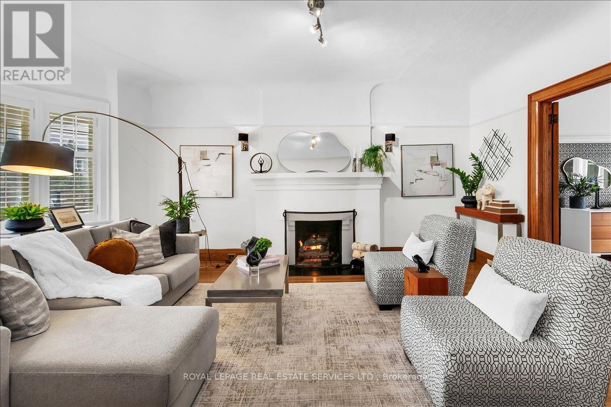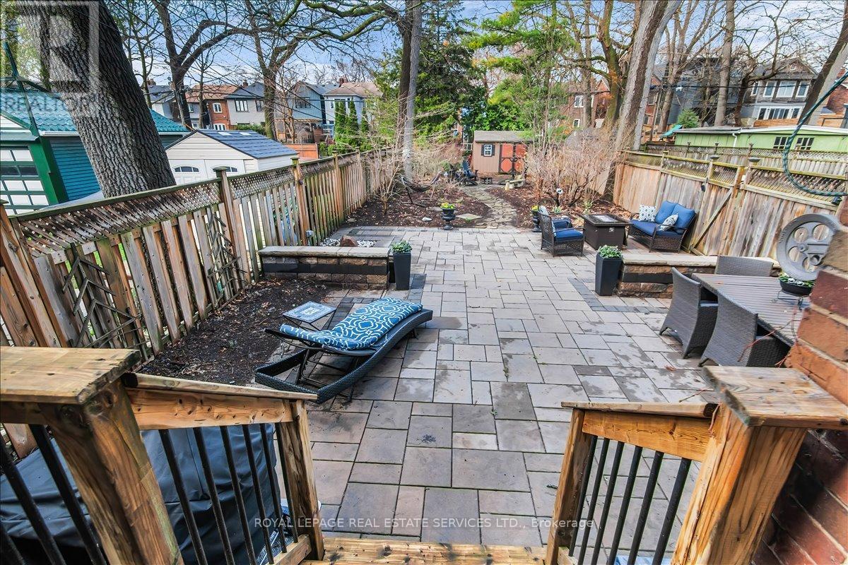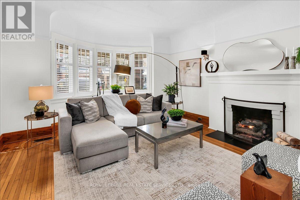 Welcome to one of Bloor West Village's most sought-after streets, where timeless charm meets modern comfort in this exceptional family home. A spacious foyer sets the tone, leading into a bright and inviting living room featuring a cozy gas fireplace and a stunning bay window. The formal dining room overlooks the beautifully landscaped backyard-perfect for entertaining. The updated gourmet kitchen boasts stainless steel appliances, quartz countertops, and a sun-filled breakfast area with a bay window and walk-out to the patio and garden. This home is rich in character, offering extra-high ceilings, exquisite wood trim, original stained-glass accents, and designer lighting throughout. Upstairs, the primary bedroom is a serene retreat with hardwood floors, a large picture window, and elegant plantation shutters. Three additional generously sized bedrooms share a stylish, spa-inspired bathroom complete with a vintage clawfoot tub. The finished lower level features a high-ceiling recreation room with an electric fireplace, plus a luxurious 4-piece bathroom with a jacuzzi tub and separate steam shower-ideal for relaxation. Step outside to enjoy a private 145-ft deep fenced yard with a low-maintenance perennial garden, stone patio, deck off the kitchen, and a large storage shed. The charming front porch is perfect for your morning coffee. All of this just steps from the subway, top-rated schools, High Park, and the vibrant shops and cafés along Bloor Street. A rare opportunity to own a 4-bedroom home in this highly coveted neighbourhood. (id:64974)