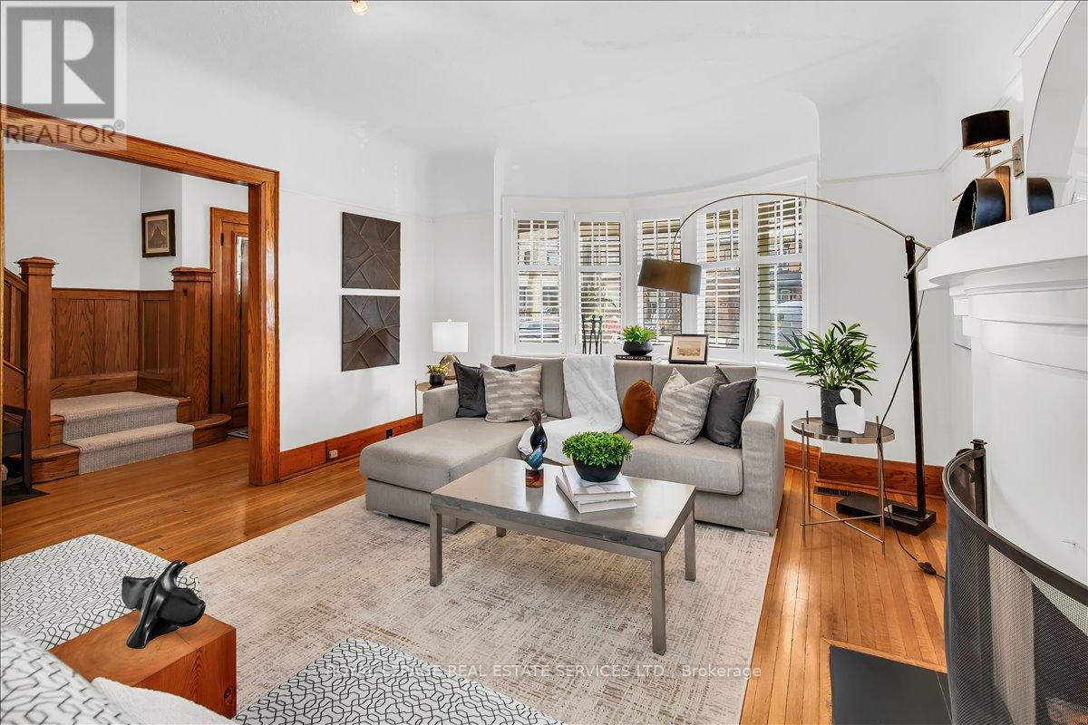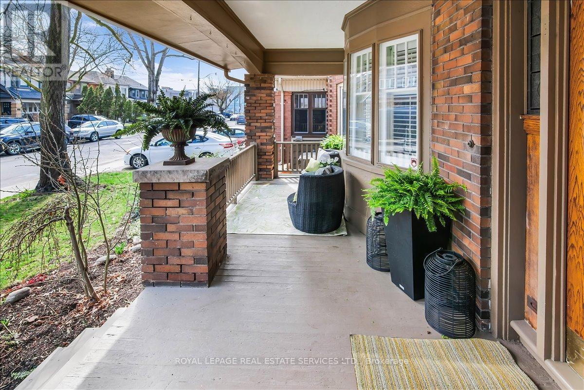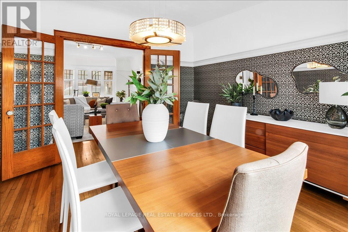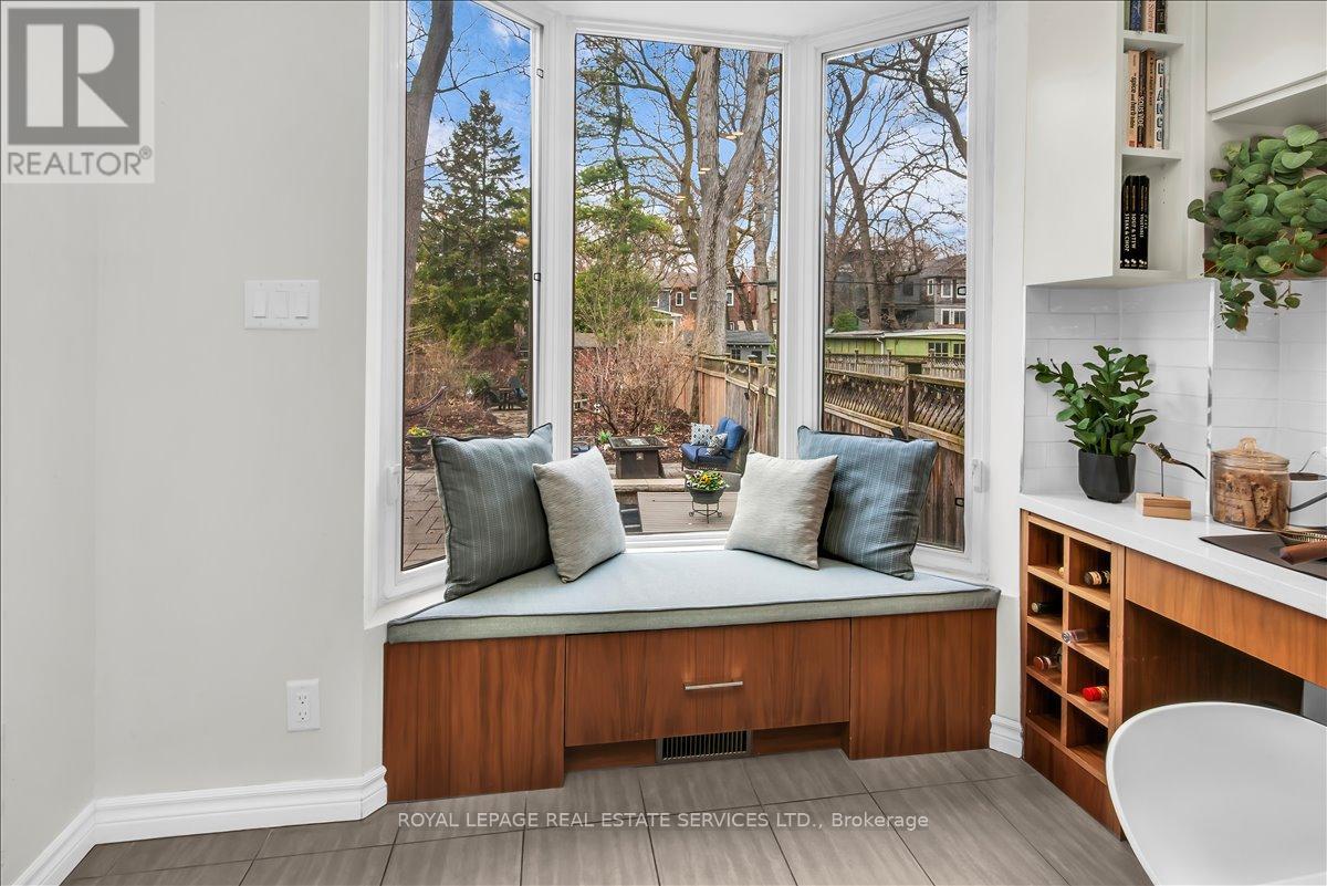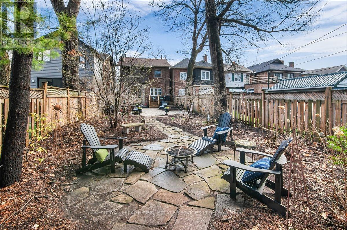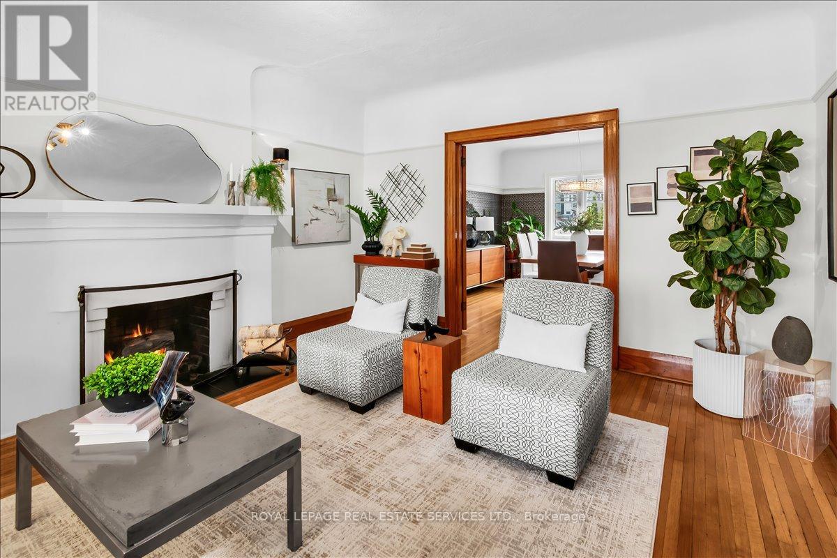 Welcome to one of Bloor West Village's most sought-after streets, where timeless charm meets modern comfort in this exceptional family home. A spacious foyer sets the tone, leading into a bright and inviting living room featuring a cozy gas fireplace and a stunning bay window. The formal dining room overlooks the beautifully landscaped backyard-perfect for entertaining. The updated gourmet kitchen boasts stainless steel appliances, quartz countertops, and a sun-filled breakfast area with a bay window and walk-out to the patio and garden. This home is rich in character, offering extra-high ceilings, exquisite wood trim, original stained-glass accents, and designer lighting throughout. Upstairs, the primary bedroom is a serene retreat with hardwood floors, a large picture window, and elegant plantation shutters. Three additional generously sized bedrooms share a stylish, spa-inspired bathroom complete with a vintage clawfoot tub. The finished lower level features a high-ceiling recreation room with an electric fireplace, plus a luxurious 4-piece bathroom with a jacuzzi tub and separate steam shower-ideal for relaxation. Step outside to enjoy a private 145-ft deep fenced yard with a low-maintenance perennial garden, stone patio, deck off the kitchen, and a large storage shed. The charming front porch is perfect for your morning coffee. All of this just steps from the subway, top-rated schools, High Park, and the vibrant shops and cafés along Bloor Street. A rare opportunity to own a 4-bedroom home in this highly coveted neighbourhood. (id:64974)