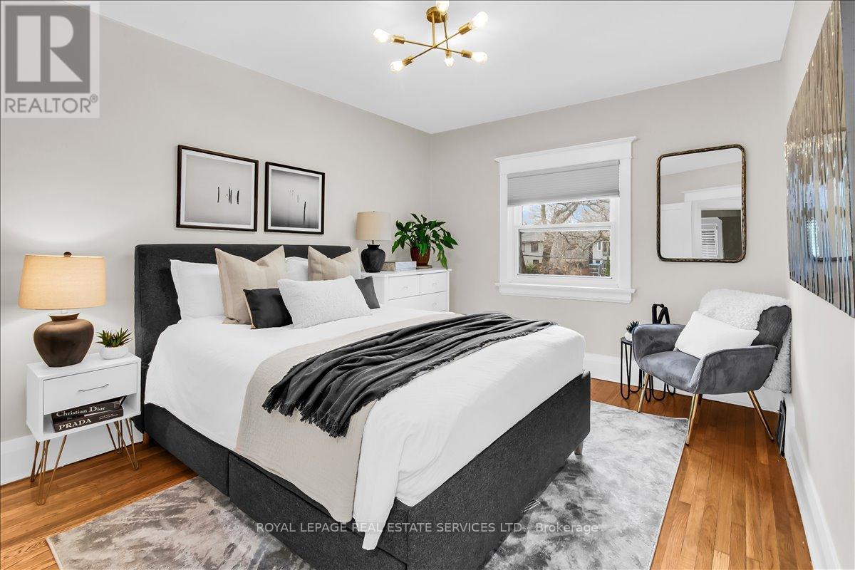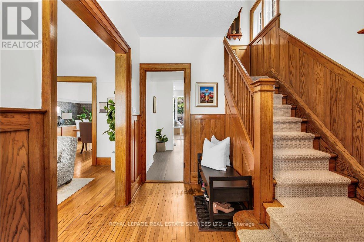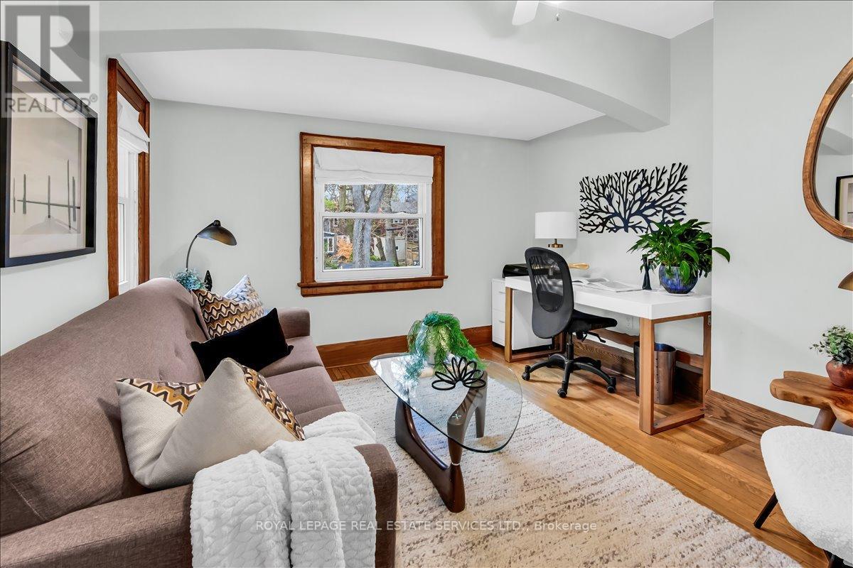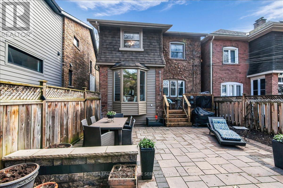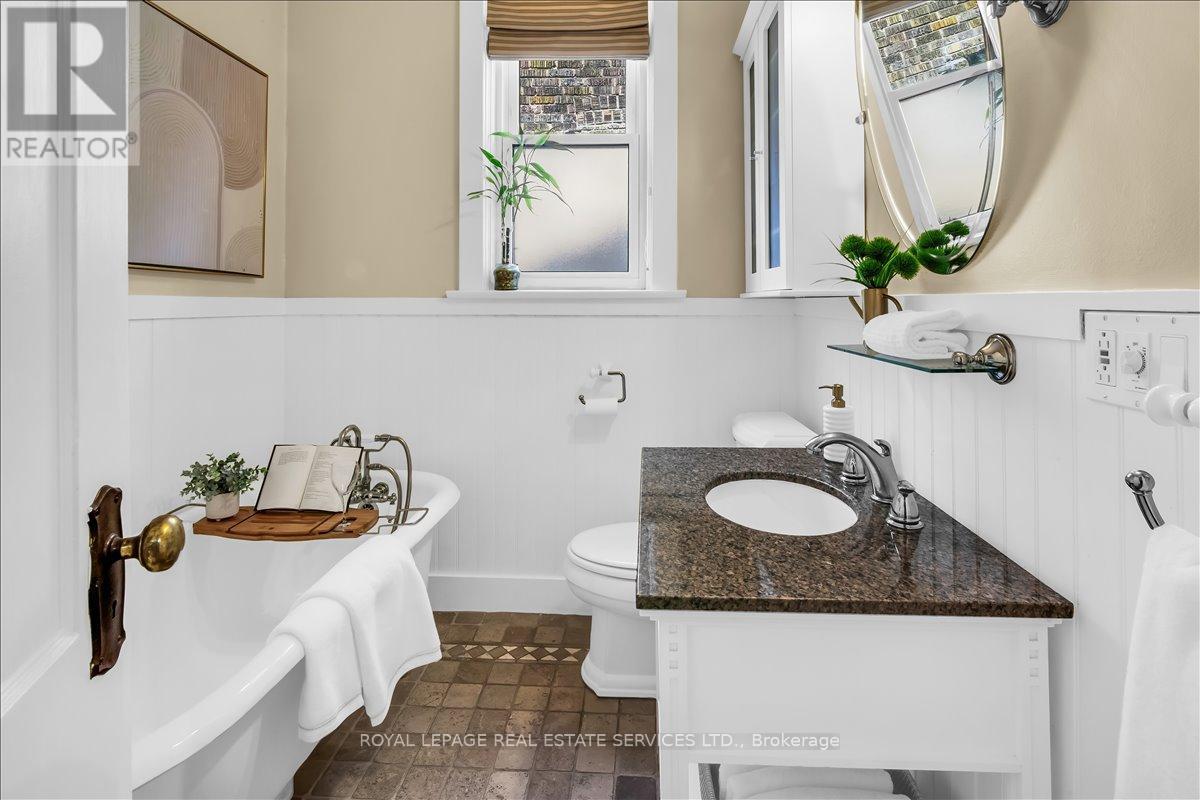 Welcome to one of Bloor West Village's most sought-after streets, where timeless charm meets modern comfort in this exceptional family home. A spacious foyer sets the tone, leading into a bright and inviting living room featuring a cozy gas fireplace and a stunning bay window. The formal dining room overlooks the beautifully landscaped backyard-perfect for entertaining. The updated gourmet kitchen boasts stainless steel appliances, quartz countertops, and a sun-filled breakfast area with a bay window and walk-out to the patio and garden. This home is rich in character, offering extra-high ceilings, exquisite wood trim, original stained-glass accents, and designer lighting throughout. Upstairs, the primary bedroom is a serene retreat with hardwood floors, a large picture window, and elegant plantation shutters. Three additional generously sized bedrooms share a stylish, spa-inspired bathroom complete with a vintage clawfoot tub. The finished lower level features a high-ceiling recreation room with an electric fireplace, plus a luxurious 4-piece bathroom with a jacuzzi tub and separate steam shower-ideal for relaxation. Step outside to enjoy a private 145-ft deep fenced yard with a low-maintenance perennial garden, stone patio, deck off the kitchen, and a large storage shed. The charming front porch is perfect for your morning coffee. All of this just steps from the subway, top-rated schools, High Park, and the vibrant shops and cafés along Bloor Street. A rare opportunity to own a 4-bedroom home in this highly coveted neighbourhood. (id:64974)
