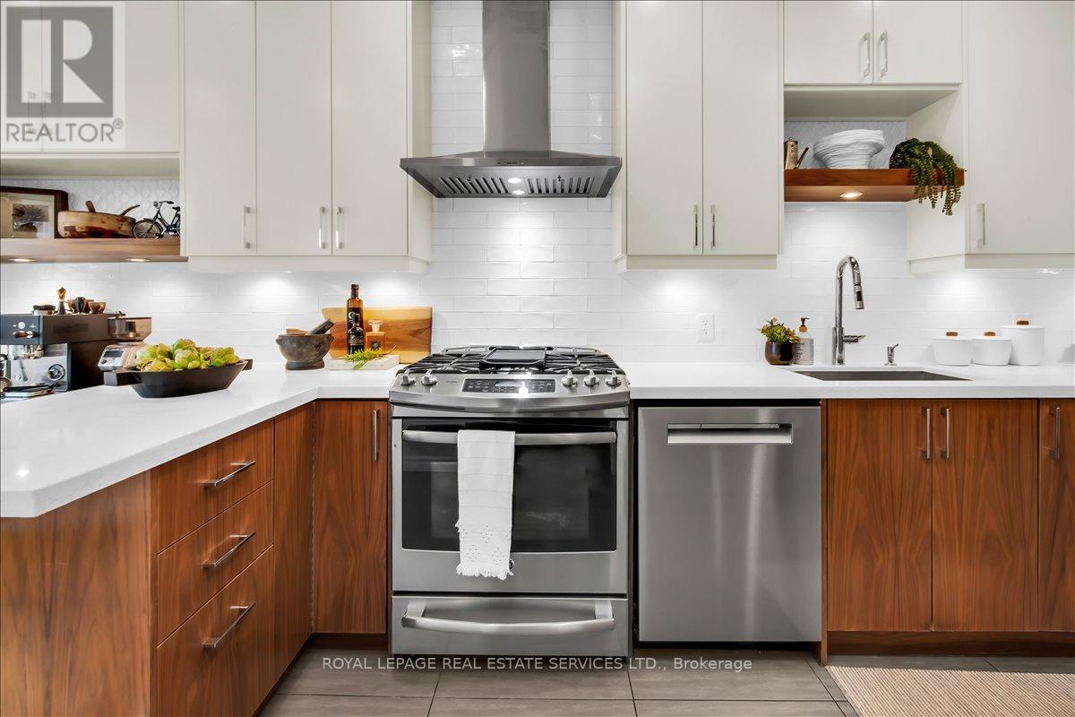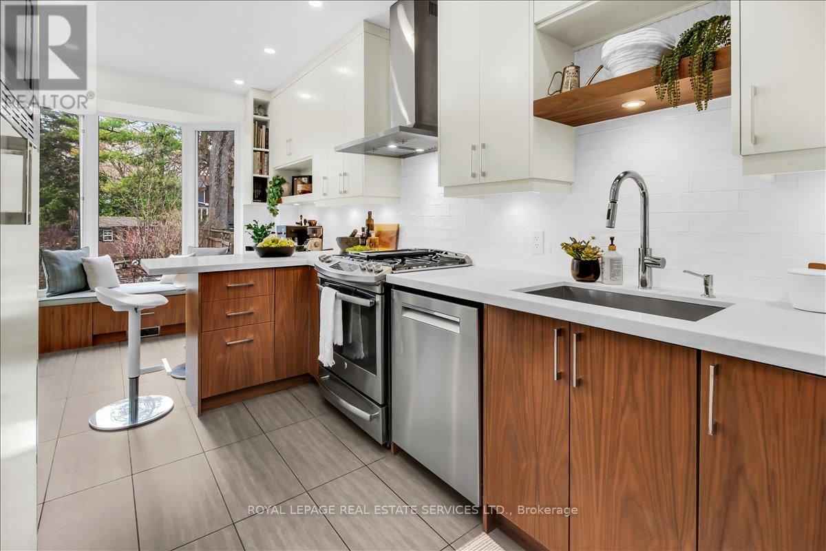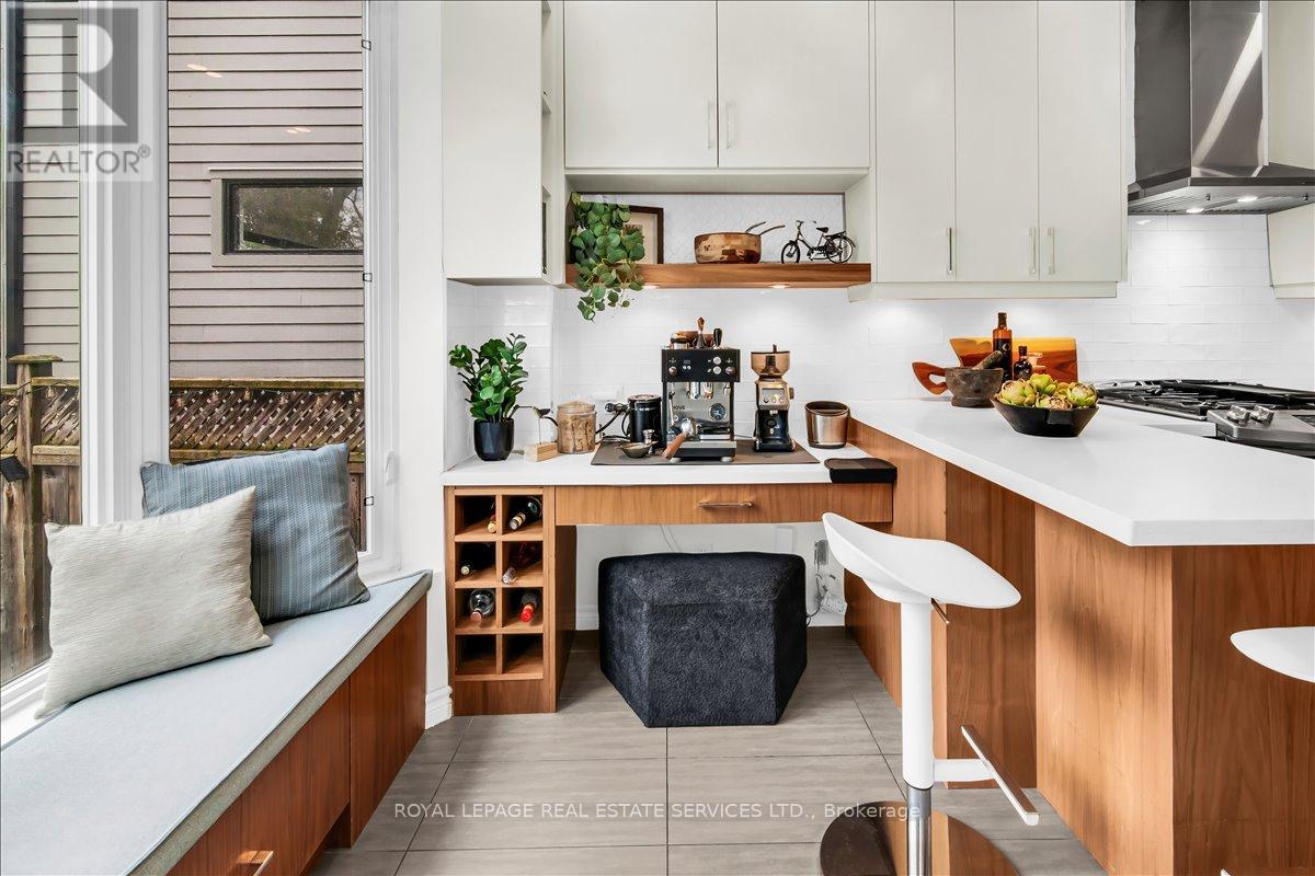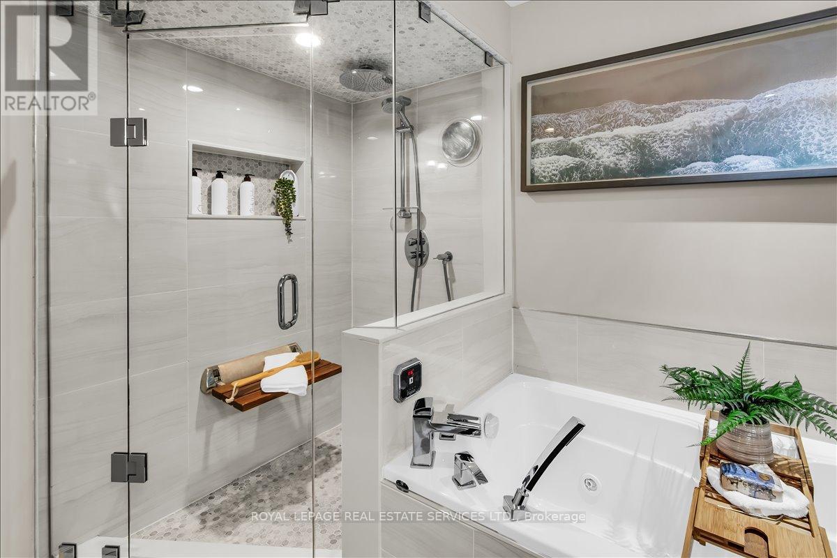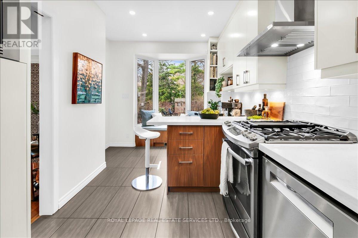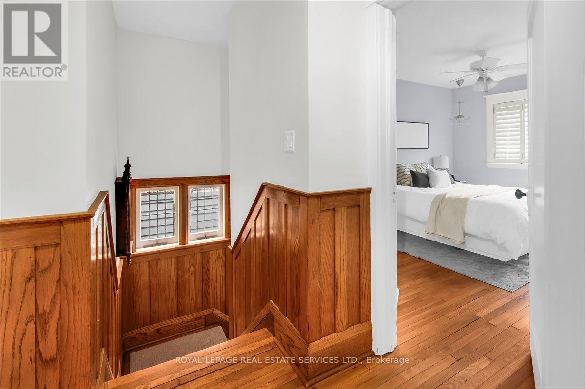 Welcome to one of Bloor West Village's most sought-after streets, where timeless charm meets modern comfort in this exceptional family home. A spacious foyer sets the tone, leading into a bright and inviting living room featuring a cozy gas fireplace and a stunning bay window. The formal dining room overlooks the beautifully landscaped backyard-perfect for entertaining. The updated gourmet kitchen boasts stainless steel appliances, quartz countertops, and a sun-filled breakfast area with a bay window and walk-out to the patio and garden. This home is rich in character, offering extra-high ceilings, exquisite wood trim, original stained-glass accents, and designer lighting throughout. Upstairs, the primary bedroom is a serene retreat with hardwood floors, a large picture window, and elegant plantation shutters. Three additional generously sized bedrooms share a stylish, spa-inspired bathroom complete with a vintage clawfoot tub. The finished lower level features a high-ceiling recreation room with an electric fireplace, plus a luxurious 4-piece bathroom with a jacuzzi tub and separate steam shower-ideal for relaxation. Step outside to enjoy a private 145-ft deep fenced yard with a low-maintenance perennial garden, stone patio, deck off the kitchen, and a large storage shed. The charming front porch is perfect for your morning coffee. All of this just steps from the subway, top-rated schools, High Park, and the vibrant shops and cafés along Bloor Street. A rare opportunity to own a 4-bedroom home in this highly coveted neighbourhood. (id:64974)