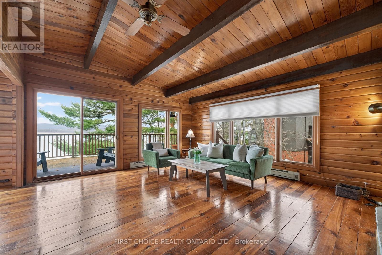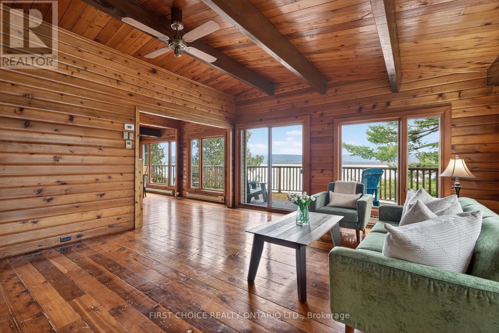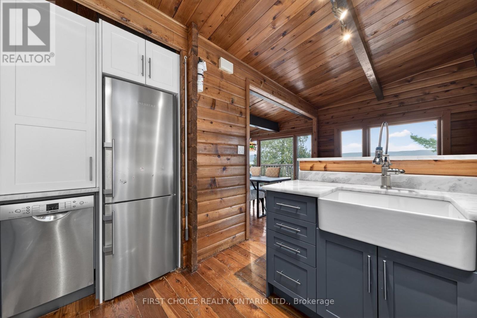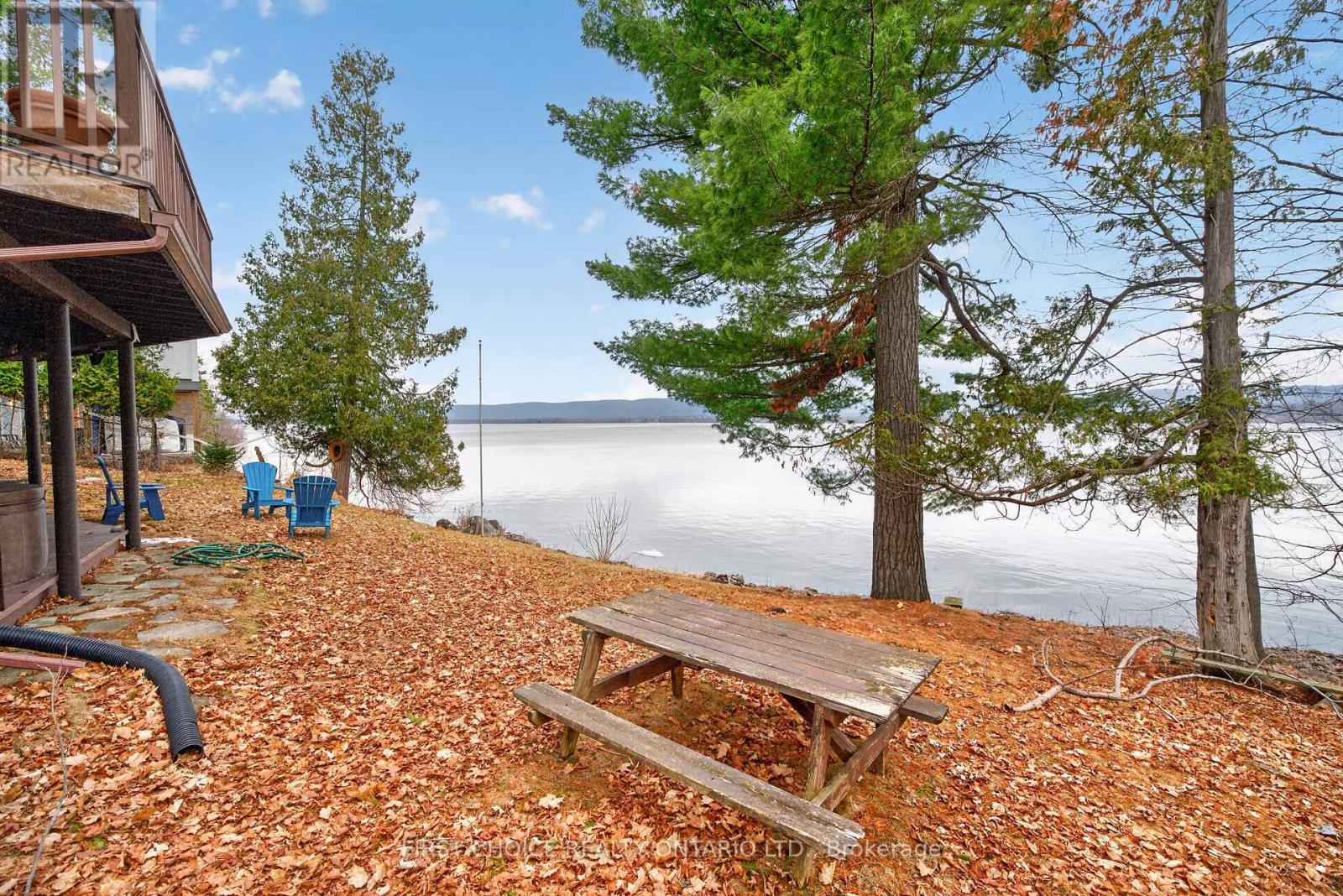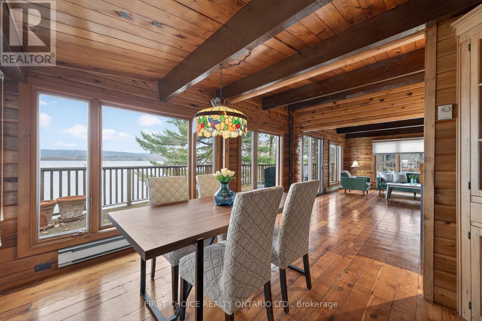 Open House Sunday 2-4pm. Exceptional retreat w/warm wood accents throughout interior, positioned with unobstructed water views on a premium in the ultra-private and sought after majestic Dunrobin Shores...where every day feels like an escape to nature's most peaceful and inspiring landscapes! From the moment you open the door, the craftsmanship and warmth of the home are unmistakable, with its rich cedar, exposed beams, and inviting architectural character that blends rustic charm with modern comfort. Note the renovated kitchen and bathroom! A spectacular 37-foot deck spans the entire length of the home, offering panoramic views of the Ottawa River and the Gatineau Hills-an ideal setting for morning coffees, golden sunsets, or gatherings with family and friends. Inside, wall-to-wall windows flood the interior with natural light, while the stunning floor-to-ceiling stone wood-burning fireplace becomes the heart of the home and a retreat year round. Numerous updates enhance the property, including a beautifully redesigned kitchen featuring sleek, modern cabinetry, stone countertops, and high-end appliances that make cooking a pleasure. A cozy four-season room which had been used as an office and a bedroom overlooks the front gardens. The walkout lower level expands your living space with a bright recreation room, bathroom, and workshop, along with a spacious patio door leading to the covered lower deck, where you can unwind rain or shine in either the soft tub... ready for use... or enjoy a quiet sitting area with a coffee and a book! Meticulous landscaping, mature trees, and thoughtfully curated gardens surround the entire property, creating a sense of tranquility and privacy rarely found so close to city conveniences. Located on prestigious Barlow Crescent-one of Dunrobin's most sought-after addresses-this home stands as one of its finest offerings, merging the very best of country living with easy access to every amenity. 20 Minutes to Kanata High Tech! (id:64974)
